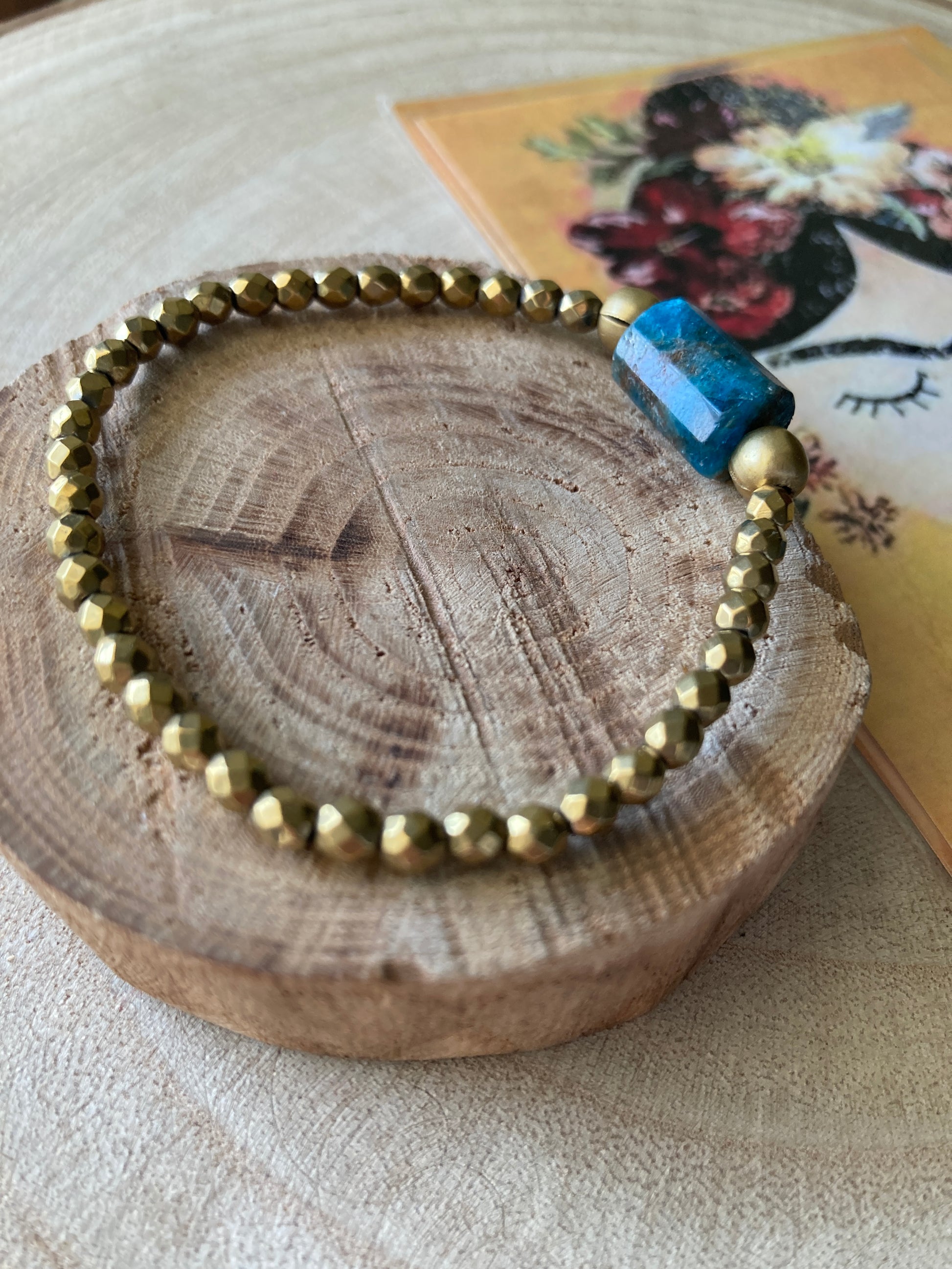 Bracciale realizzato a mano con elastico, ematite dorata, pepite in ottone, pietra cilindrica centrale Apatite blu