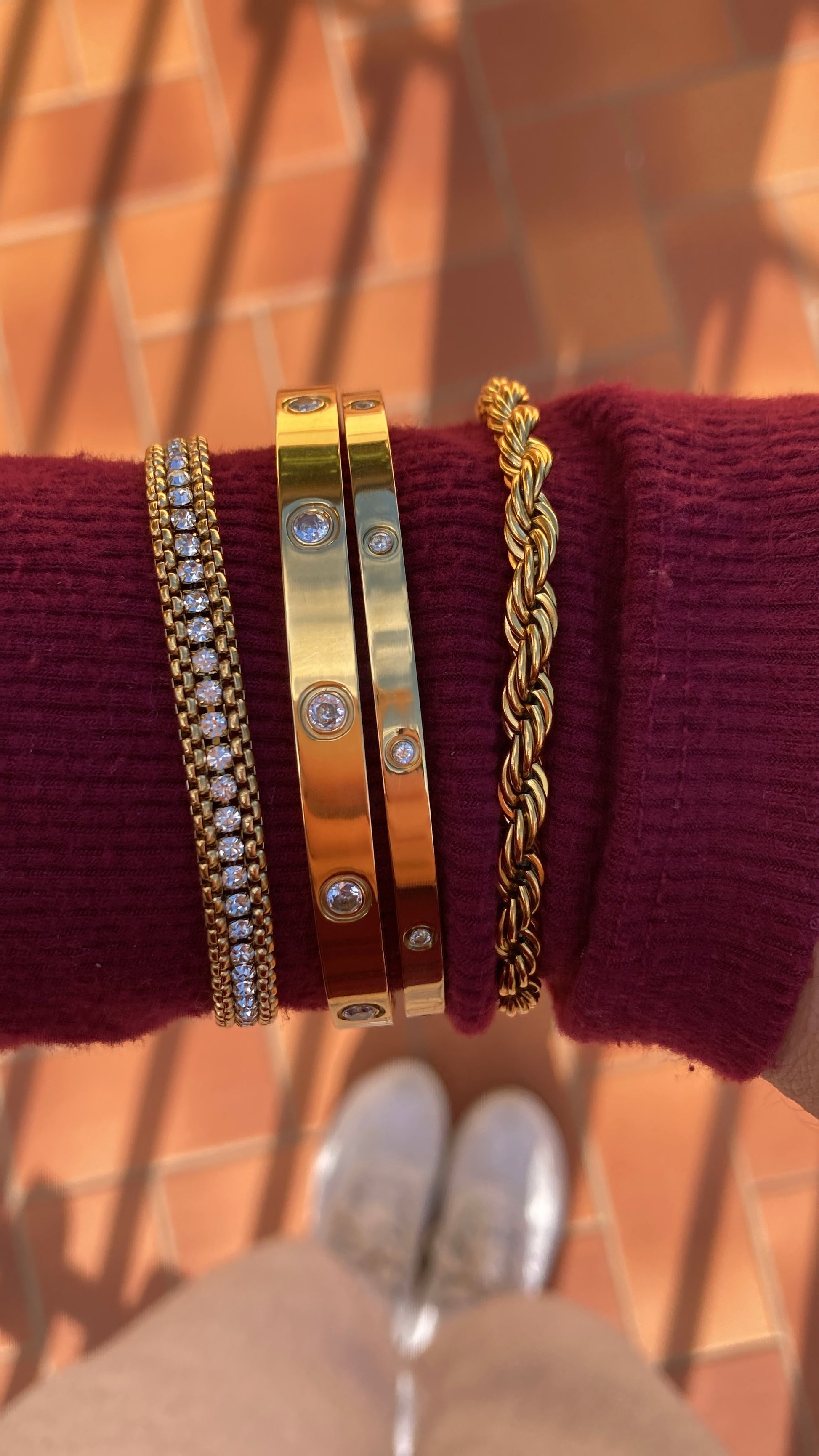 E' Caratterizzato da tanti piccoli zirconi, uno affianco all'altro, stile tennis, centrati in una maglia (catena) in finitura gold e silver!