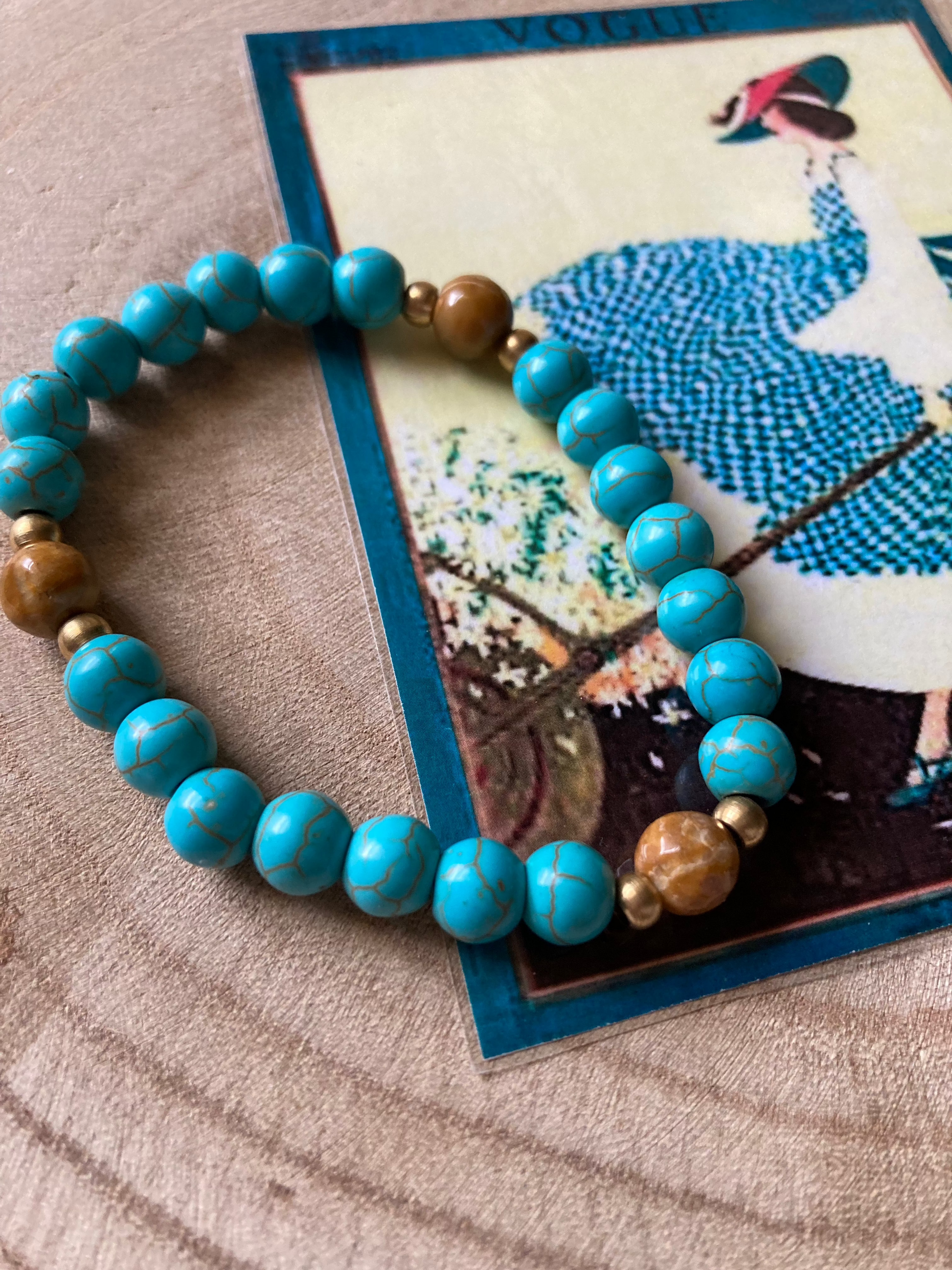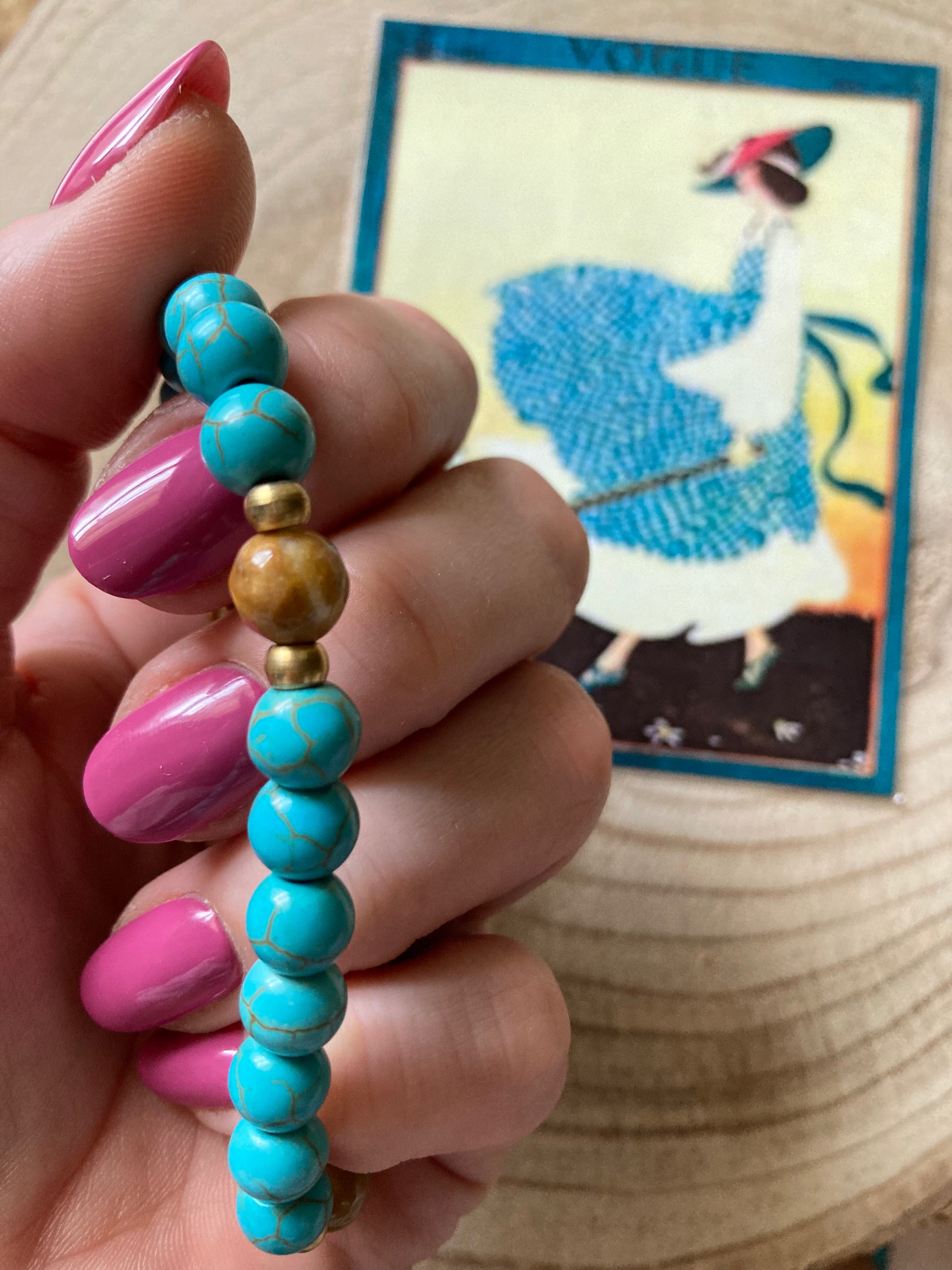 Bracciale realizzato a mano con pietre di Giada, Pasta Turchese, pepite in ottone, la circonferenza interna, senza tensione è di 16 cm, elastico