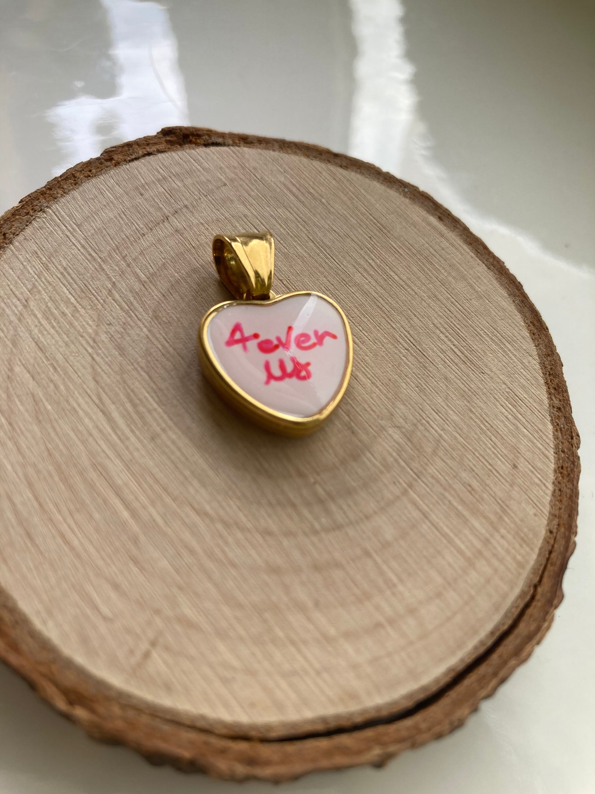Il ciondolo ha due lati; da una parte troverete il fiore vero, ricreato, memtre dall'altra parte la scritta "4ever us"! In questo modo sarà come avere due ciondoli diversi!