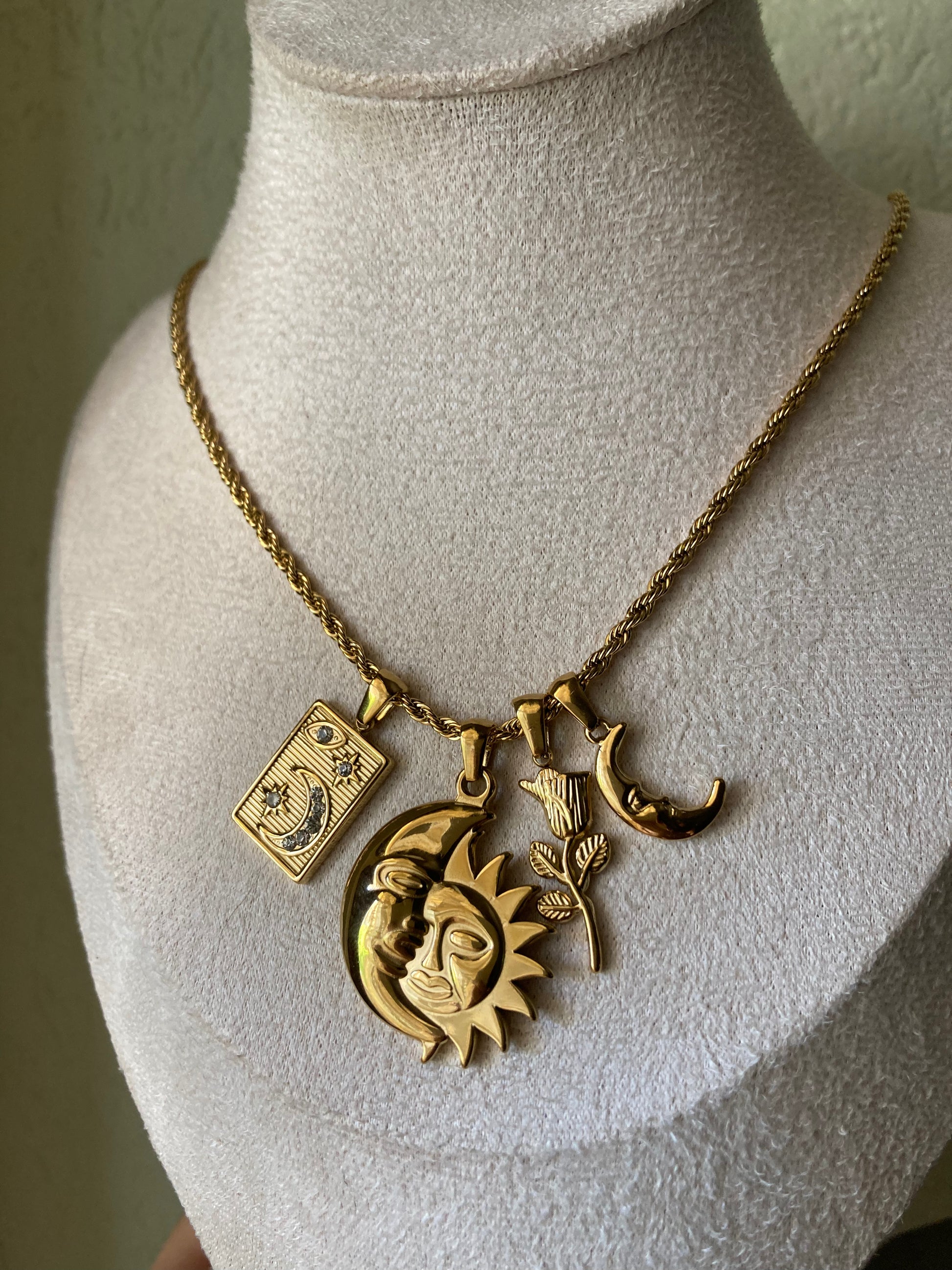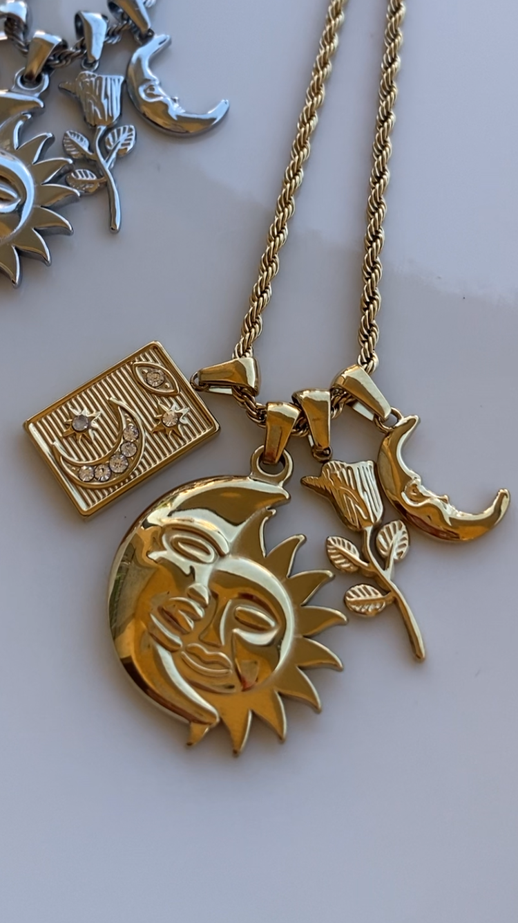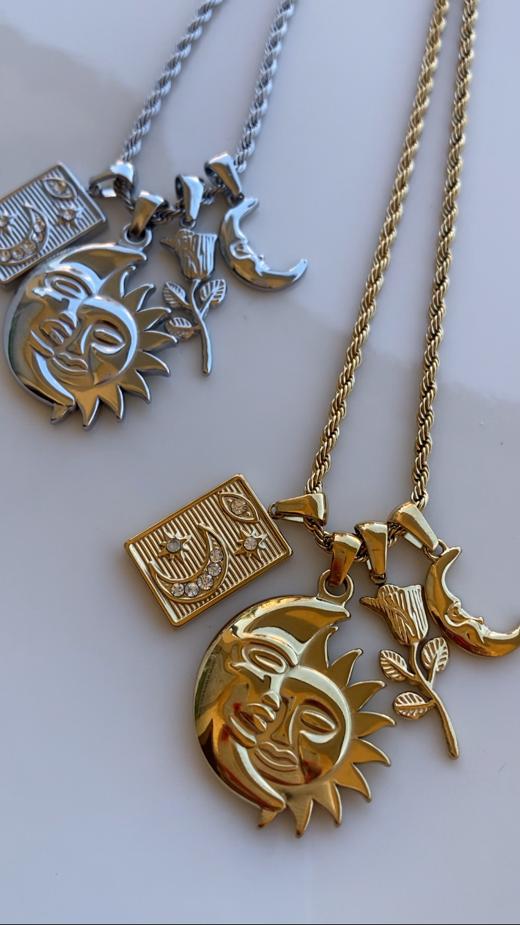 Collana e pendenti in acciaio; i pendenti mi fanno pensare tantissimo alla favola de "La Bella e la Bestia"... per la rosa.. per la contrapposizione del sole e la luna.... da qui appunto il nome Belle!