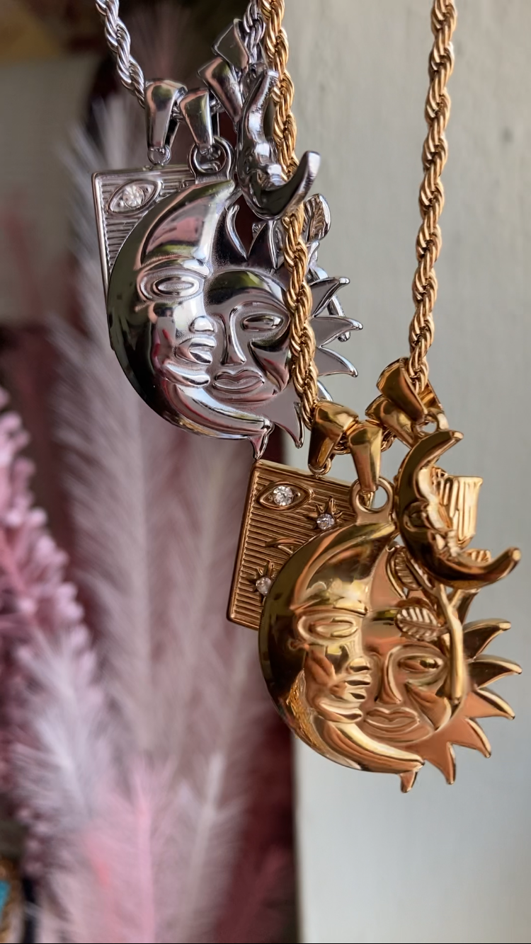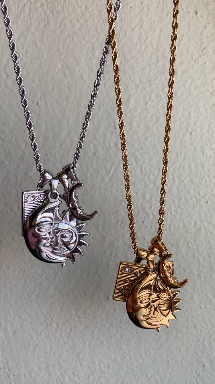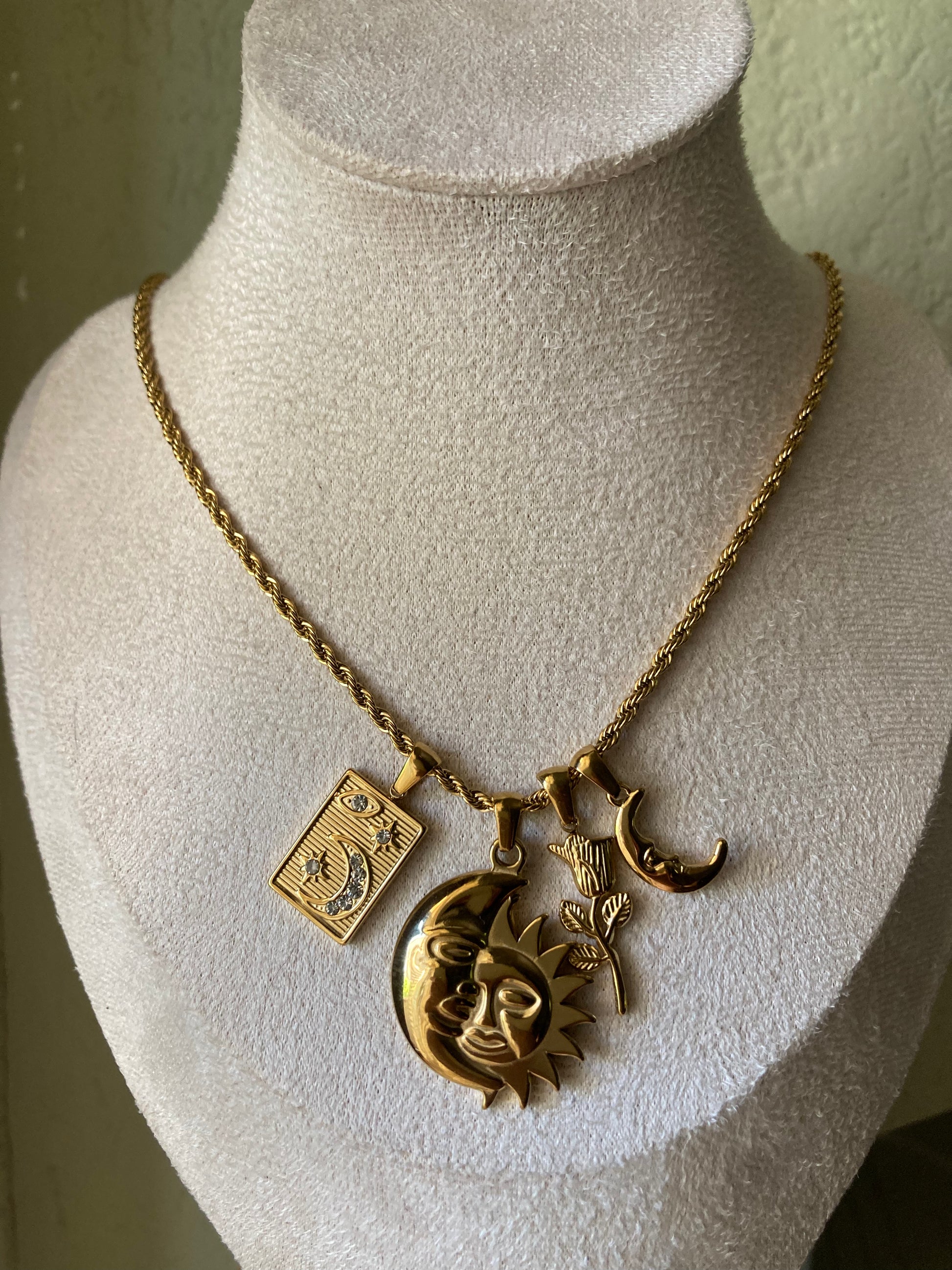 Collana e pendenti in acciaio; i pendenti mi fanno pensare tantissimo alla favola de "La Bella e la Bestia"... per la rosa.. per la contrapposizione del sole e la luna.... da qui appunto il nome Belle!