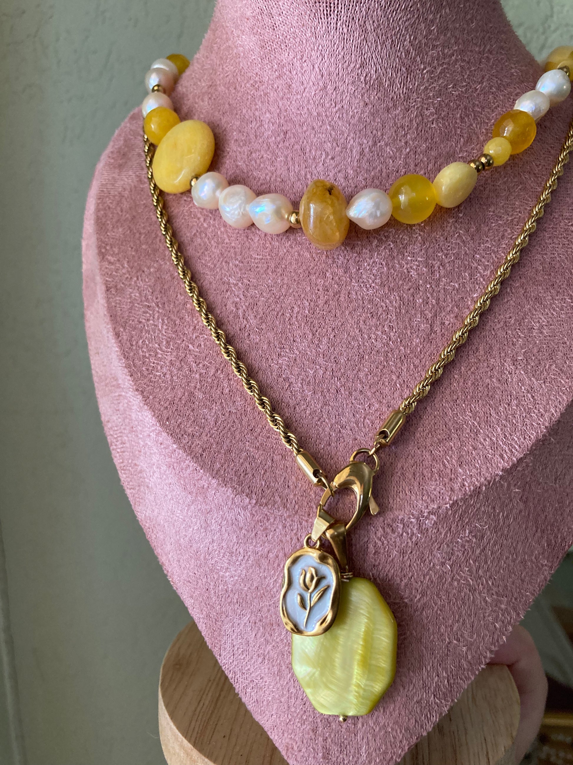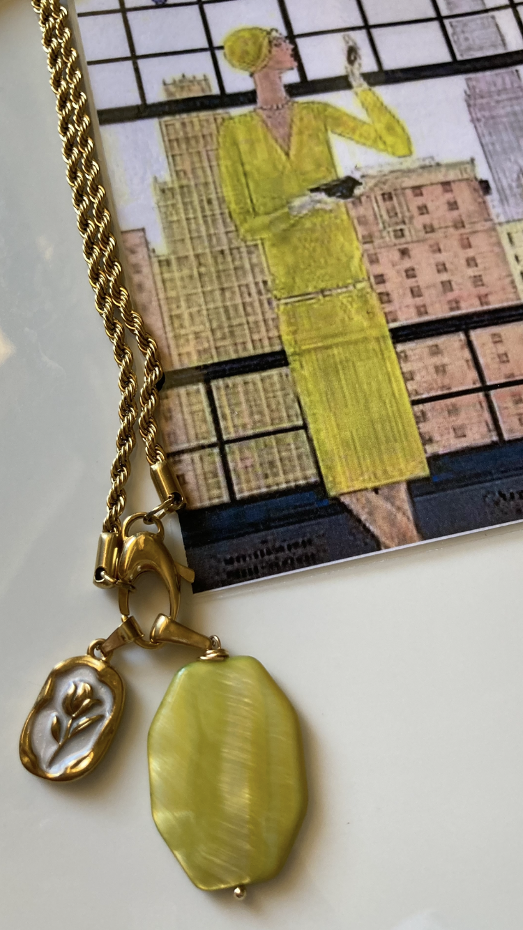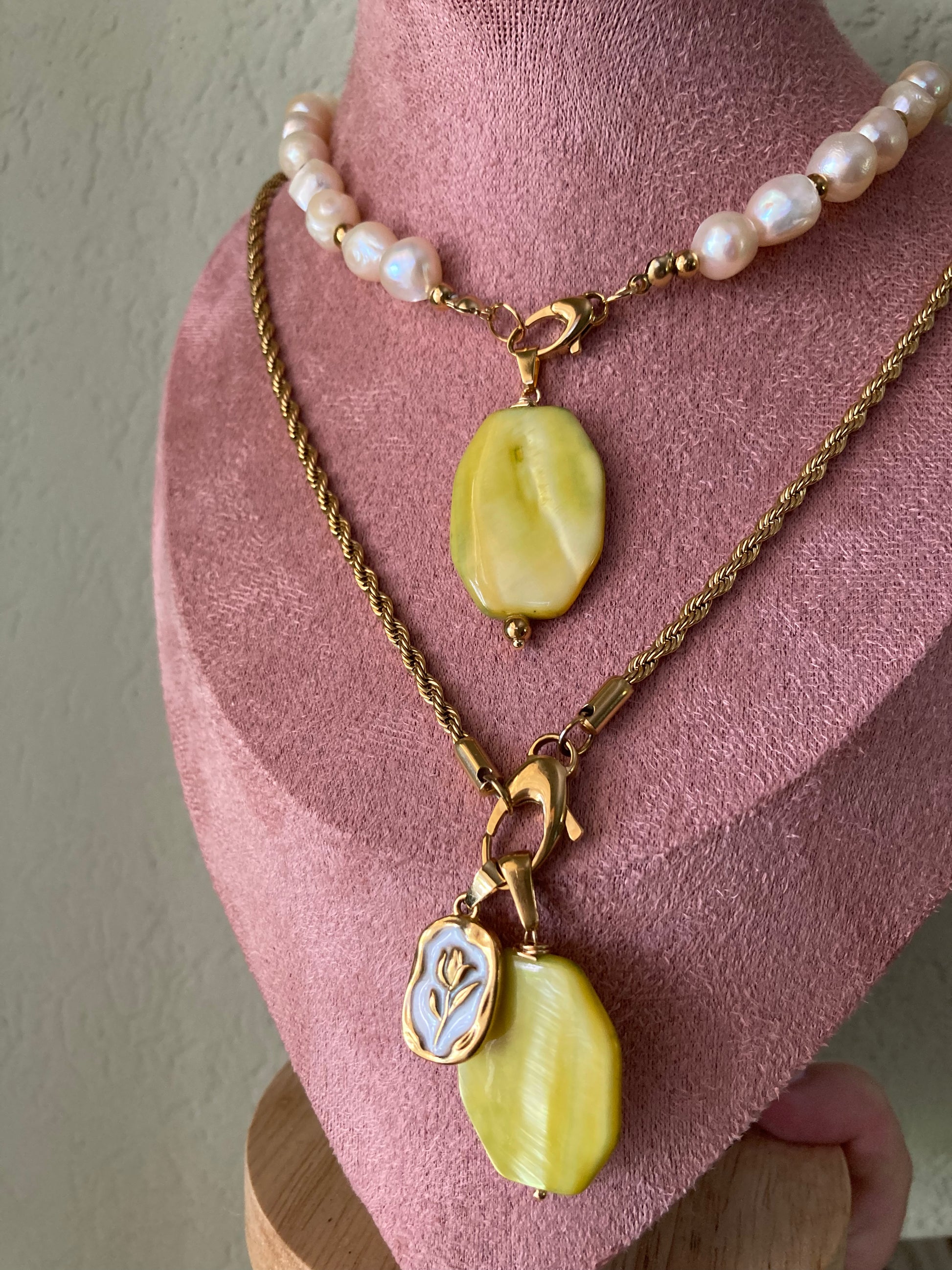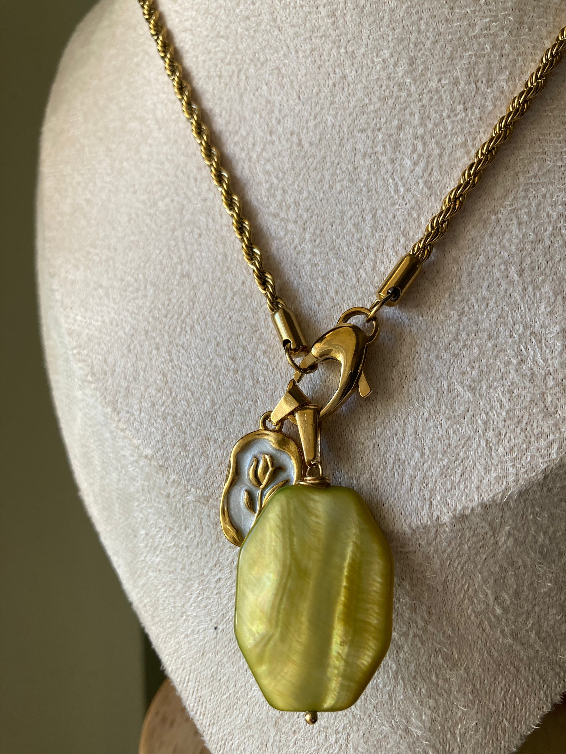 Questo abbinamento mi piace troppo!!! A partire dal colore della madreperla... un mix tra giallo canarino, verde acido...lime....insomma un mix che ci piace!!! La catena è la braid, tra le nostre preferite; alla madrteperla ho abbinato il pendente in acciaio e come chiusura ho deciso di mettere questa grandezza! Molto bella i8ndossata da sola, ma anora di più abbinata ad alre collane! Leri sta bene un po' con tutto quello che trovate qui nello shop, se scorrete nelle foto, vedrete un paio di abbinamenti.. ma potrete sbizzarrirvi come più vi piace!!!!