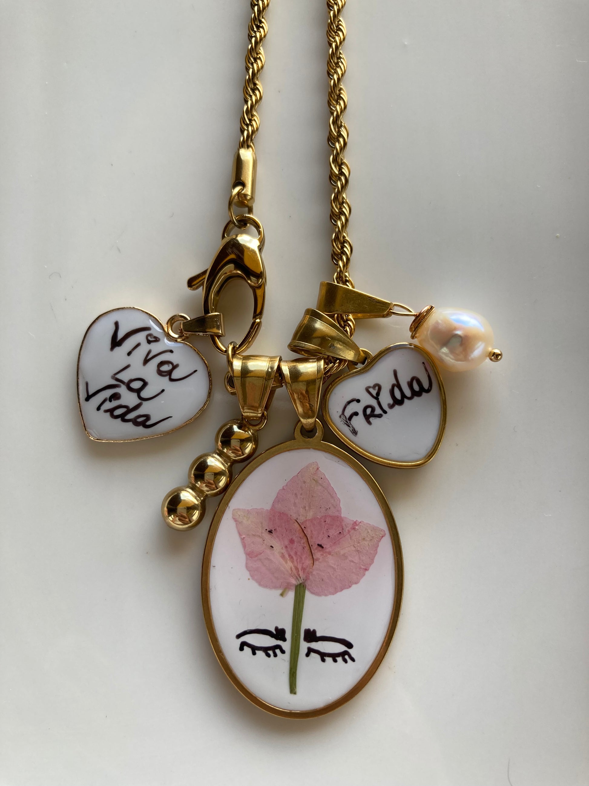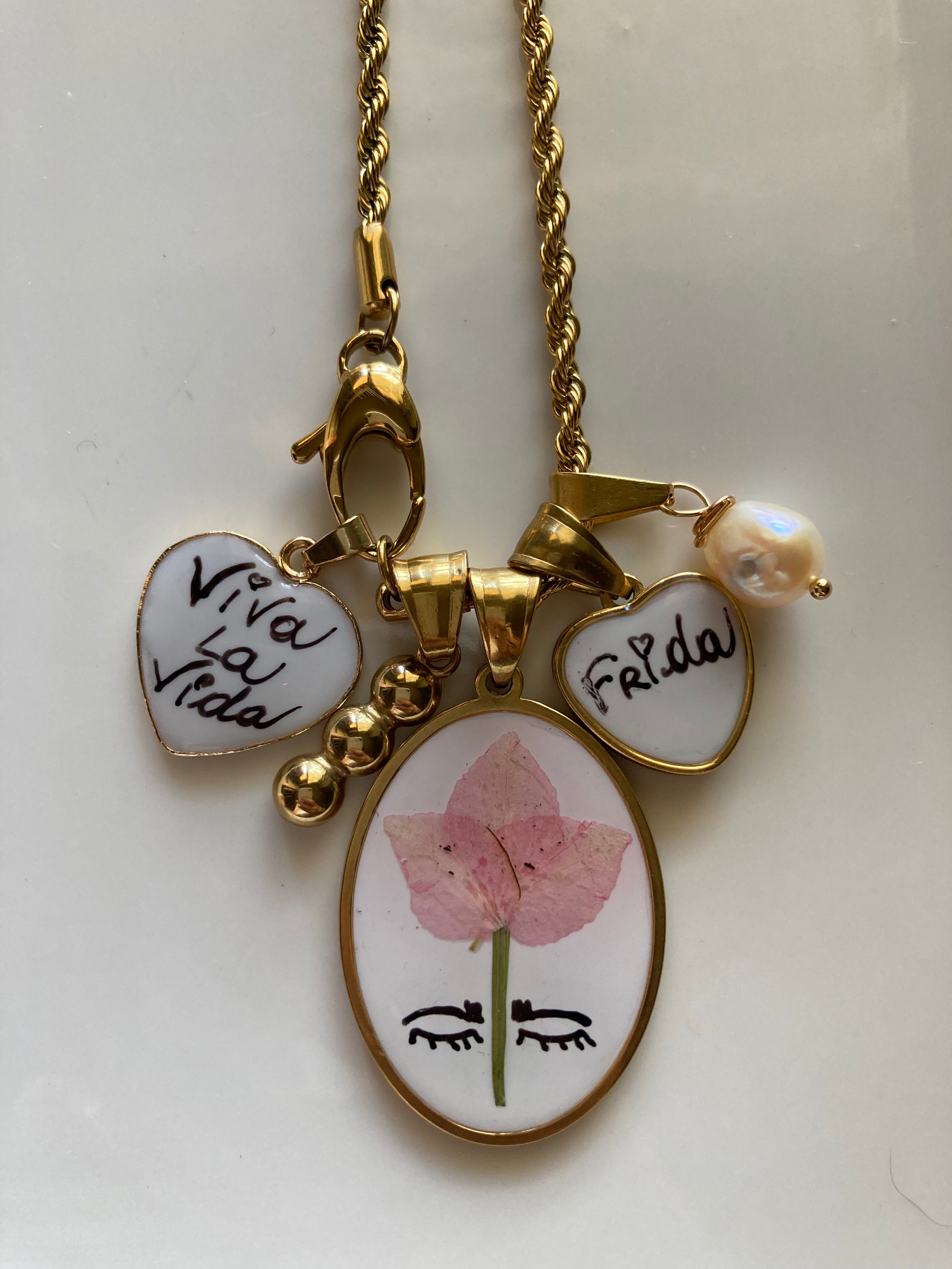 Il pendente con il fiore vuole rappresentare verosimilmente il volto di Frida. I pendenti sono tutti removibili e possono essere messi nell'ordine che più vi piace. La collana è lunga 55cm ed ho abbinato la chiusura grande