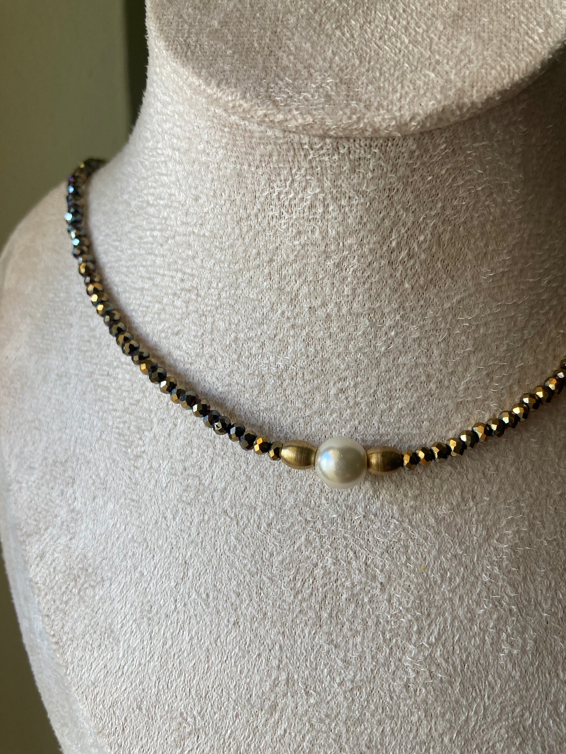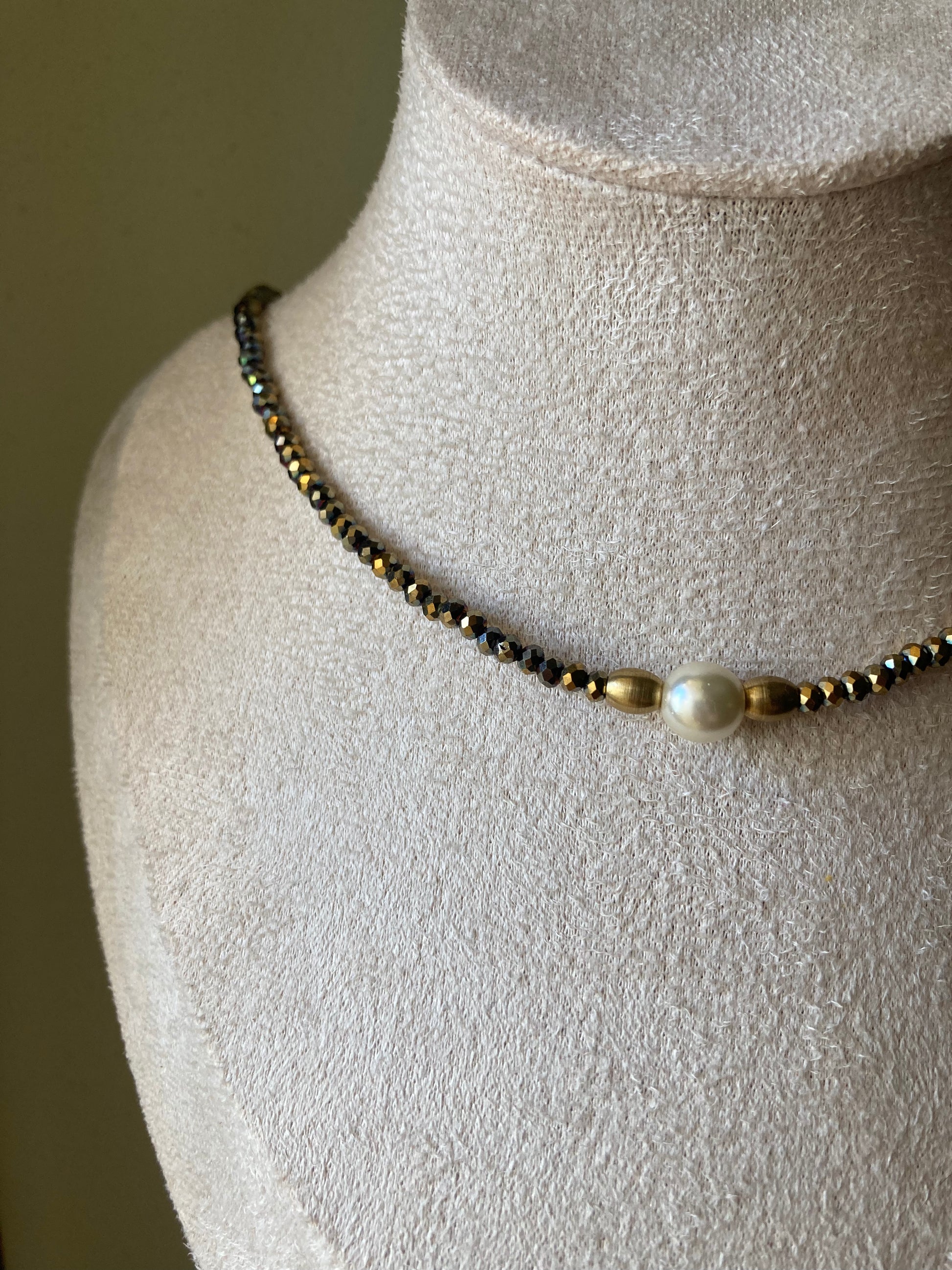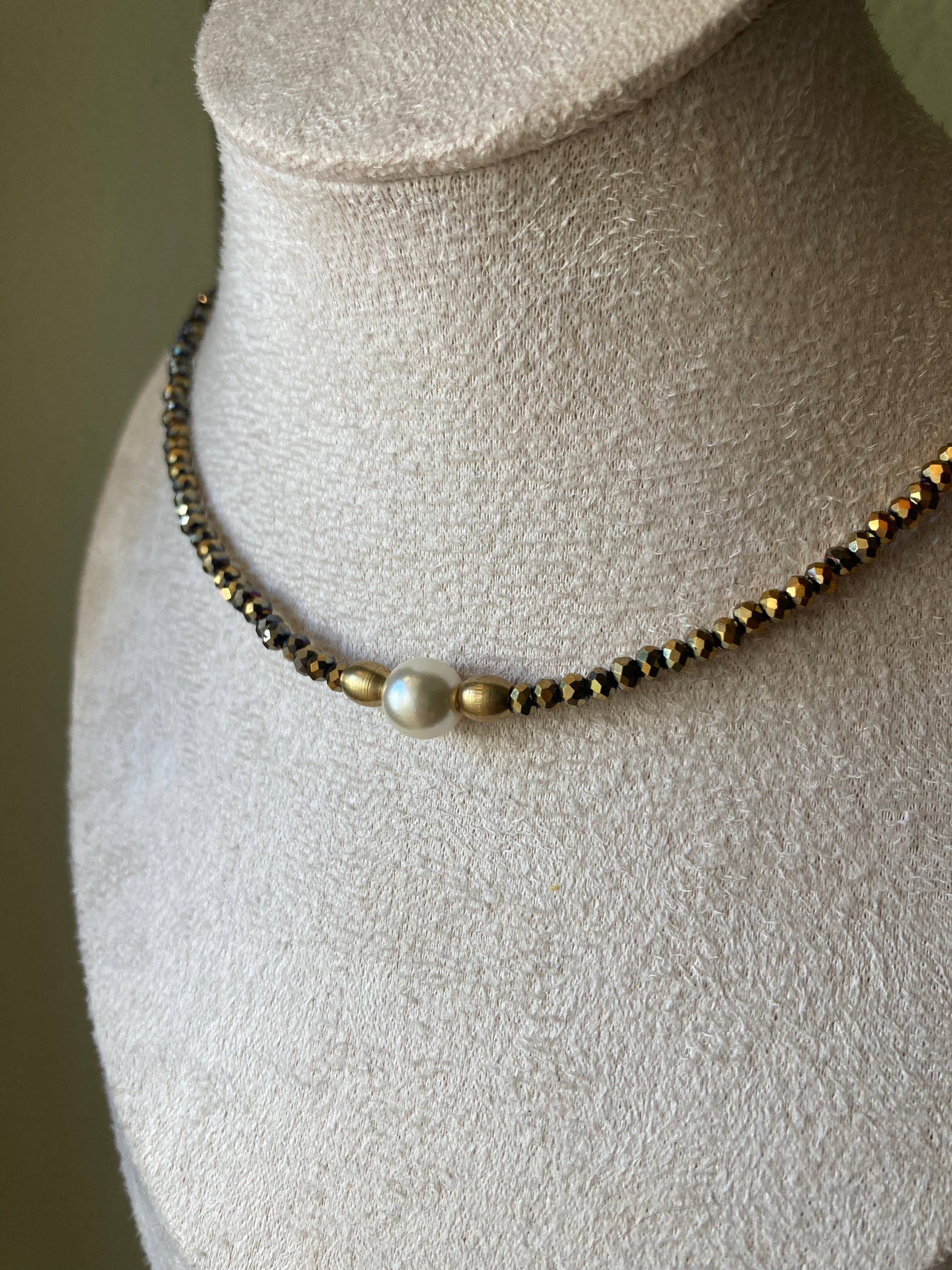 Collana realizzata a mano su cavetto in acciaio, cristalli 2mm, pepite in ottone, perlina sintetica centrale. Lunghezza 43cm, chiusura classica con moschettone in acciaio