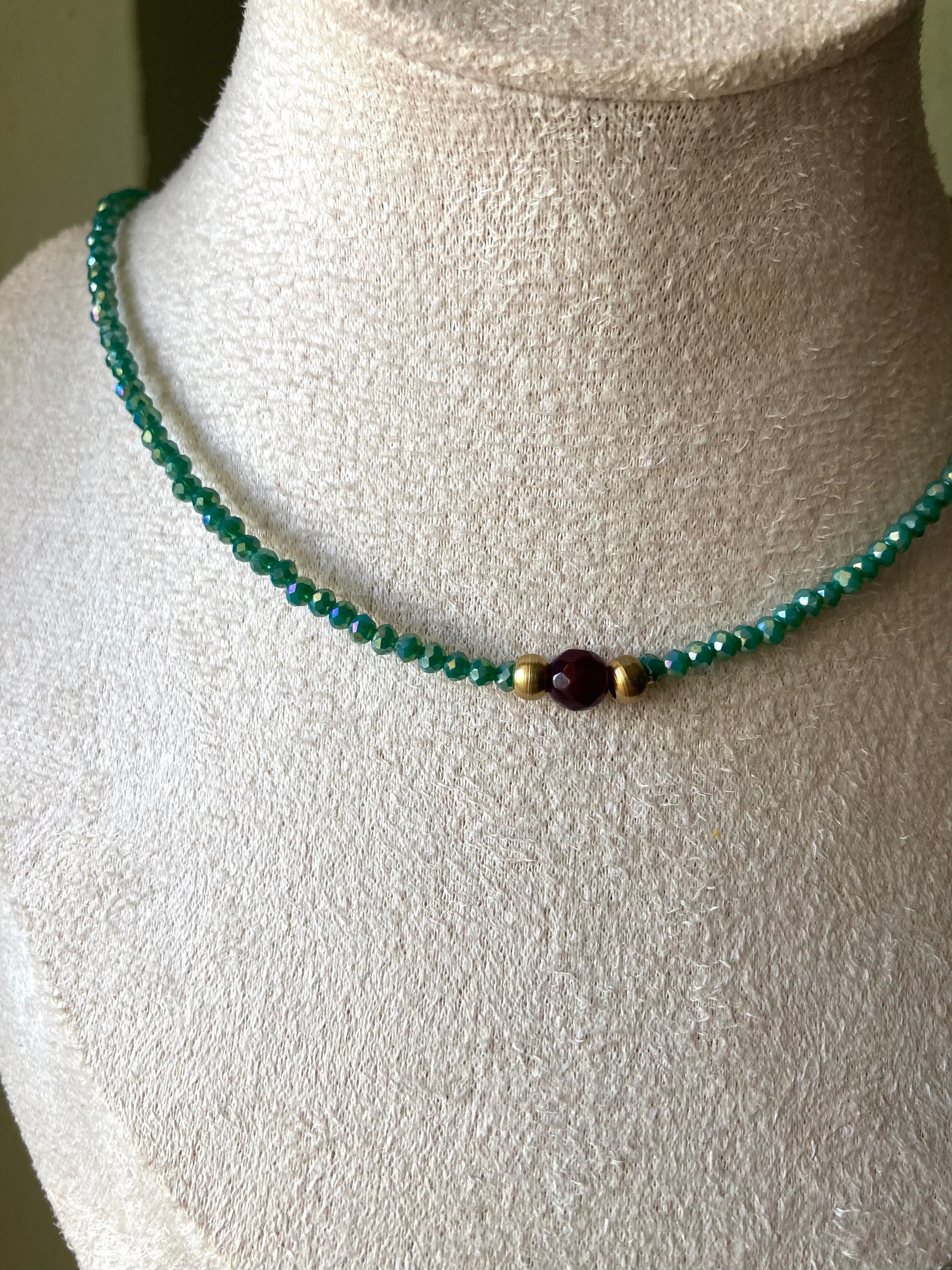 Collana realizzata a mano su cavetto in acciaio, con cristalli 2mm, pepite in ottone e pietra centrale Agata sui toni del prugna. Lunghezza 44cm, chiusura moschettone classico in acciaio dorato
