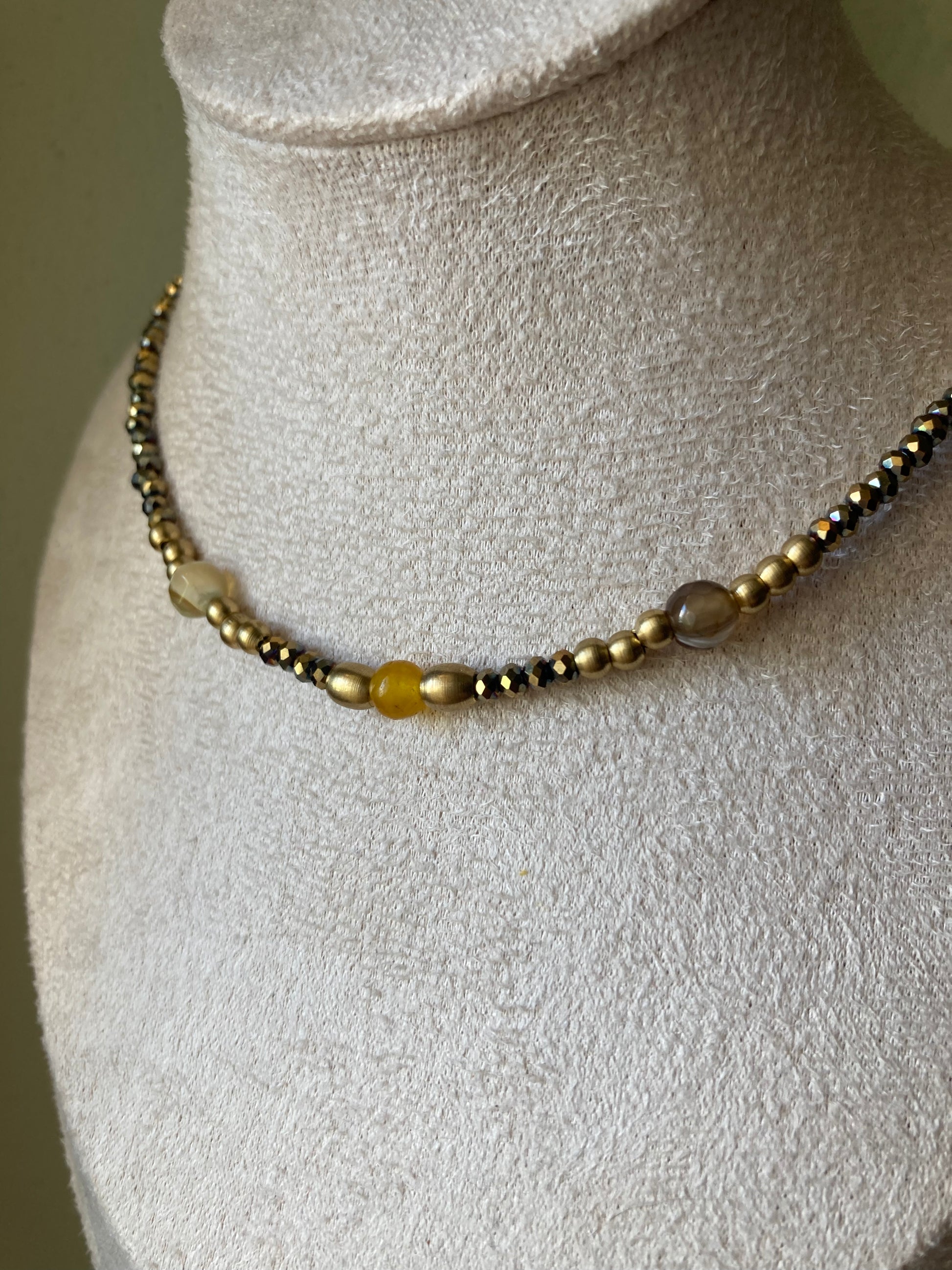 Collana realizzata a mano con cristalli 2mm, su cavetto in acciaio, pepite in ottone, pietre di Agata sui toni del giallo, del grigio.. chiusura moschettone in acciaio. Lunghezza 39cm