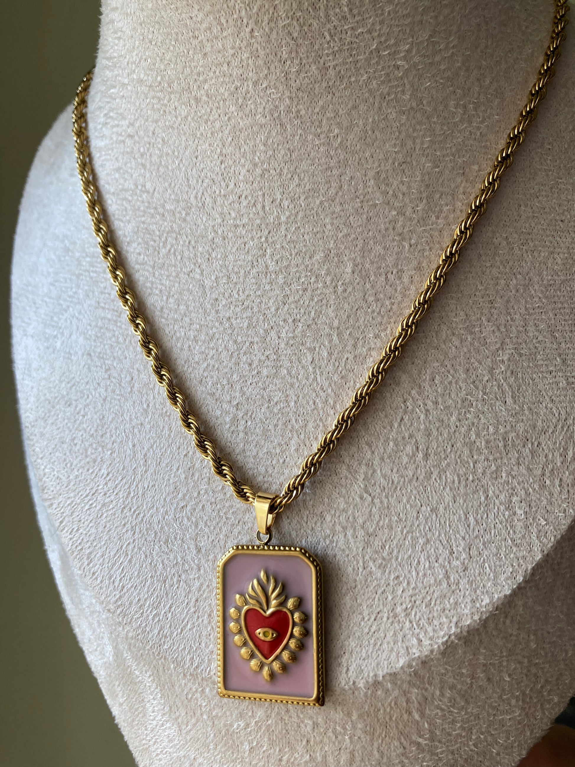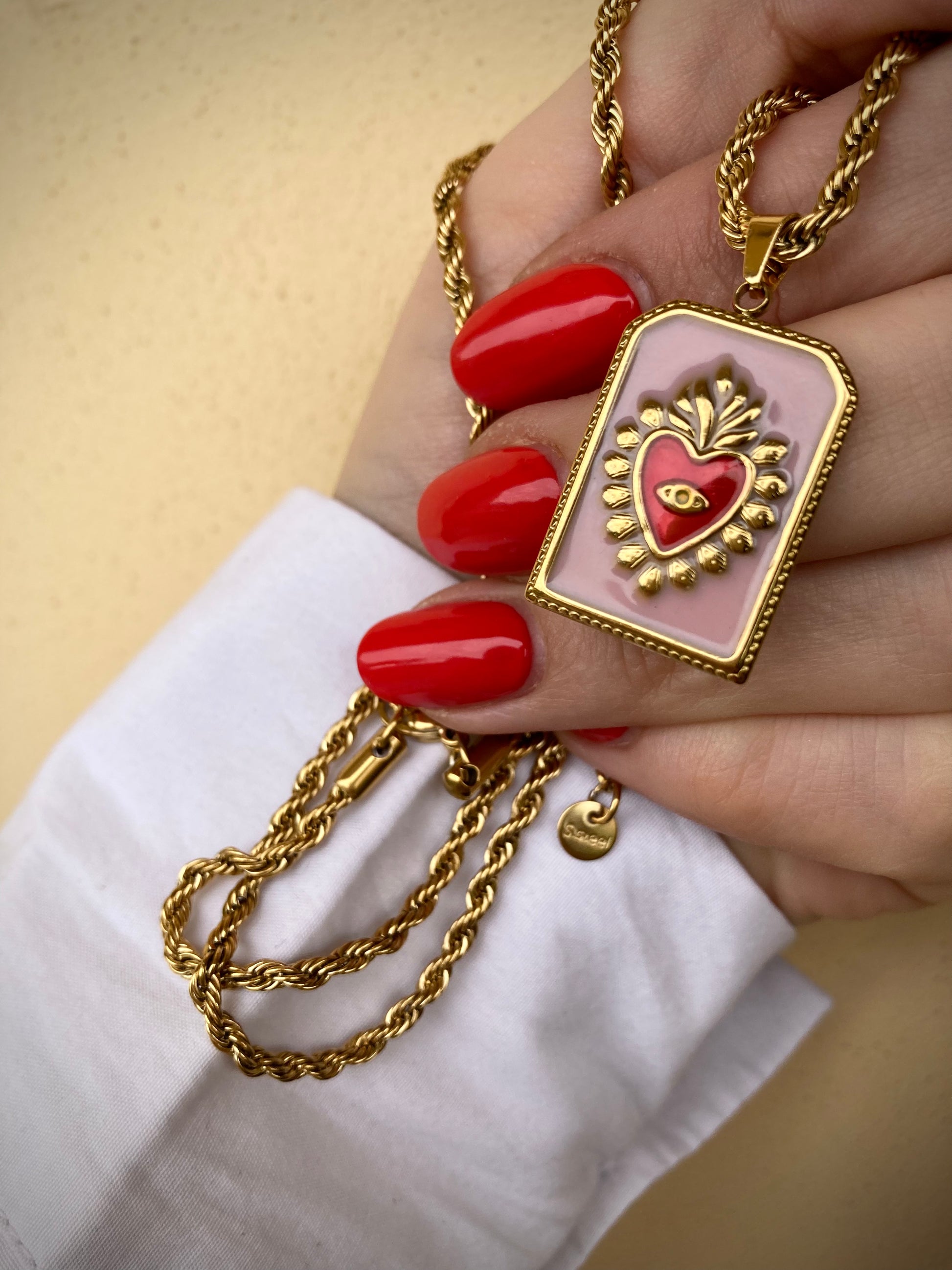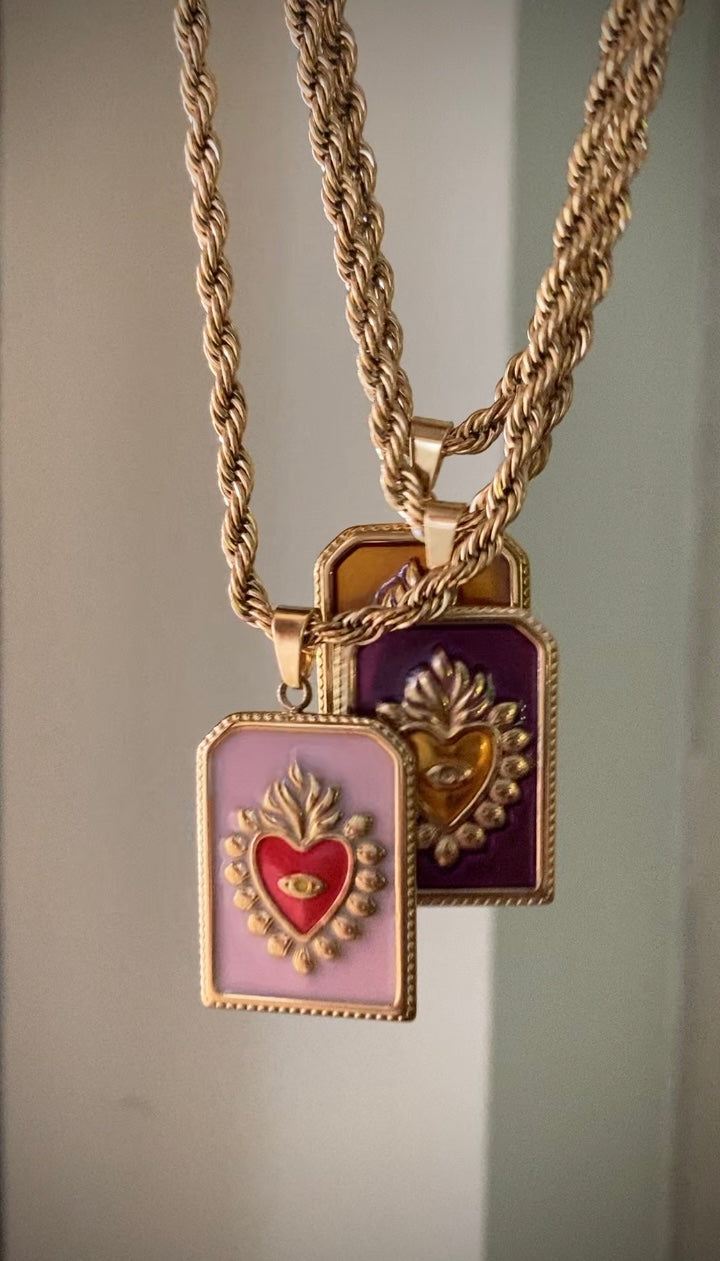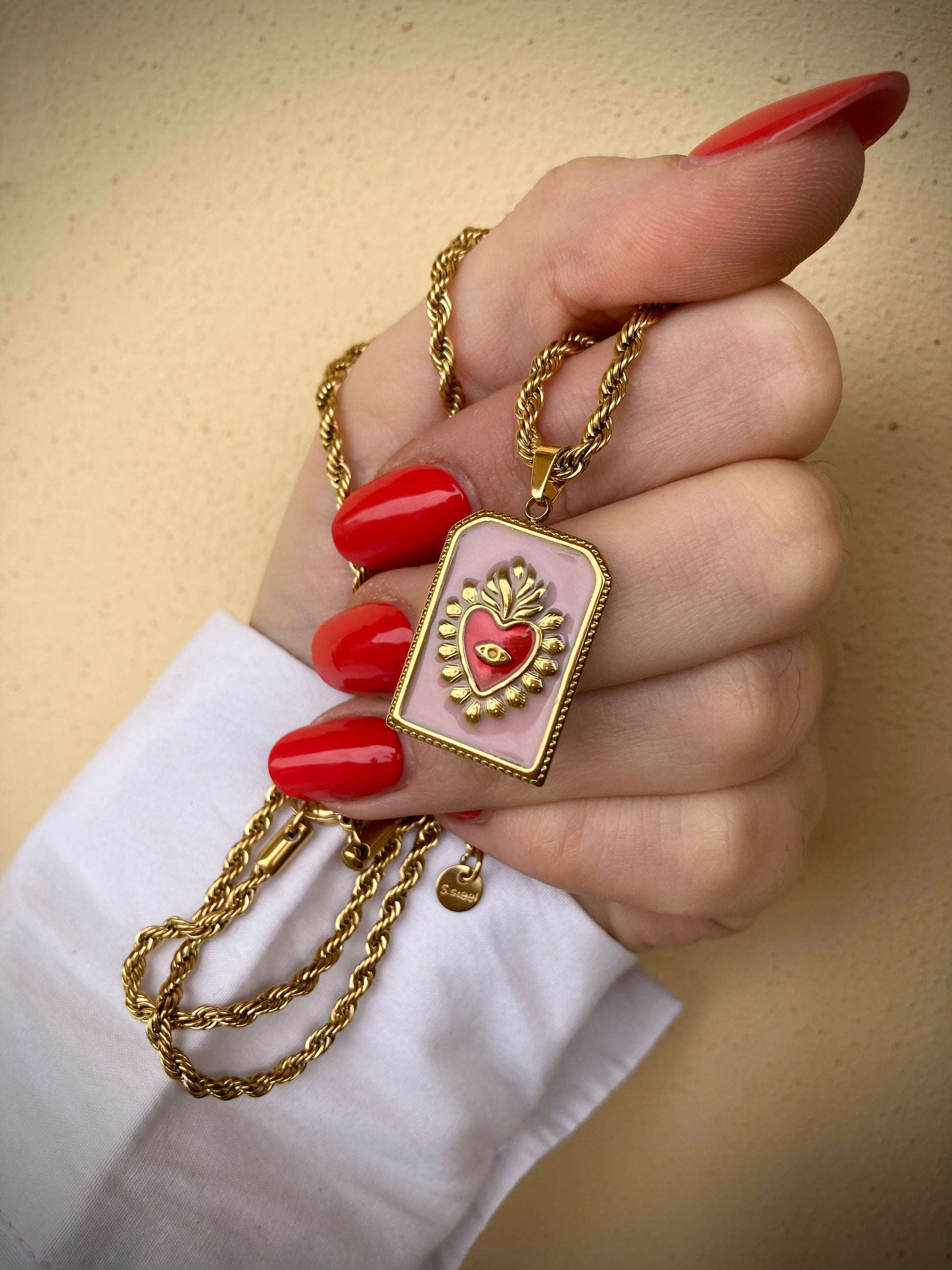 Collana in acciaio dorato con pendente medaglietta Cuore Sacro in acciaio, in tre colori diversi!