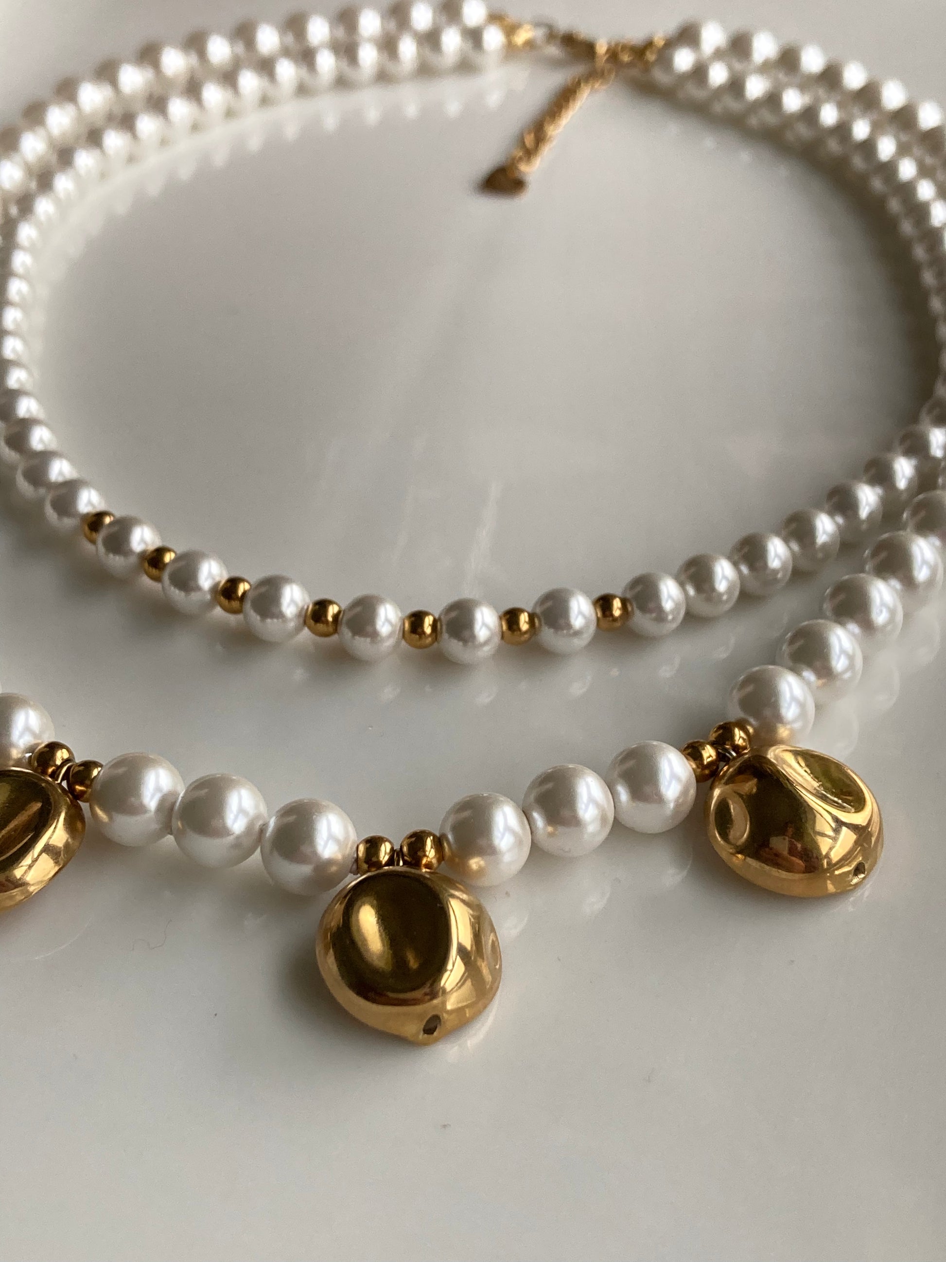 La collana ha un giro di perle, più piccole, interno, che misura 40cm di lunghezza e un filo di perle più grandi con pendenti in acciaio dorato, più lungo!