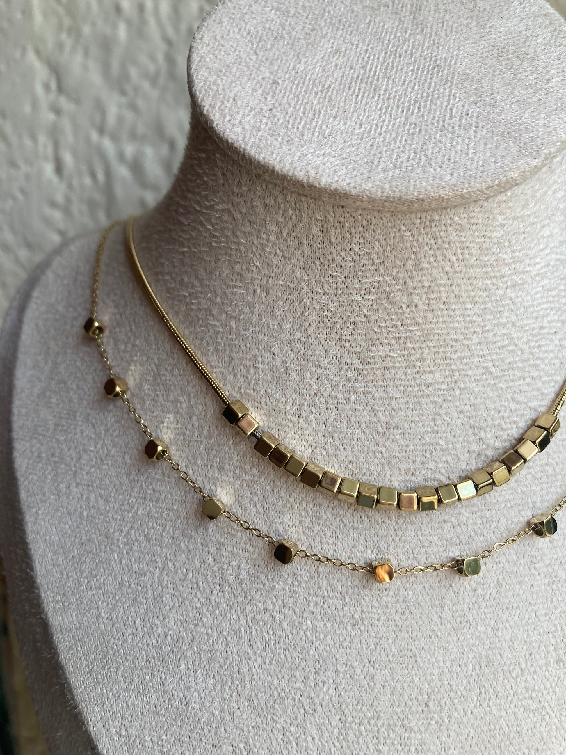 Collana in acciaio inossidabile con maglia sottile e con piccoli cubi alternati, fissi.