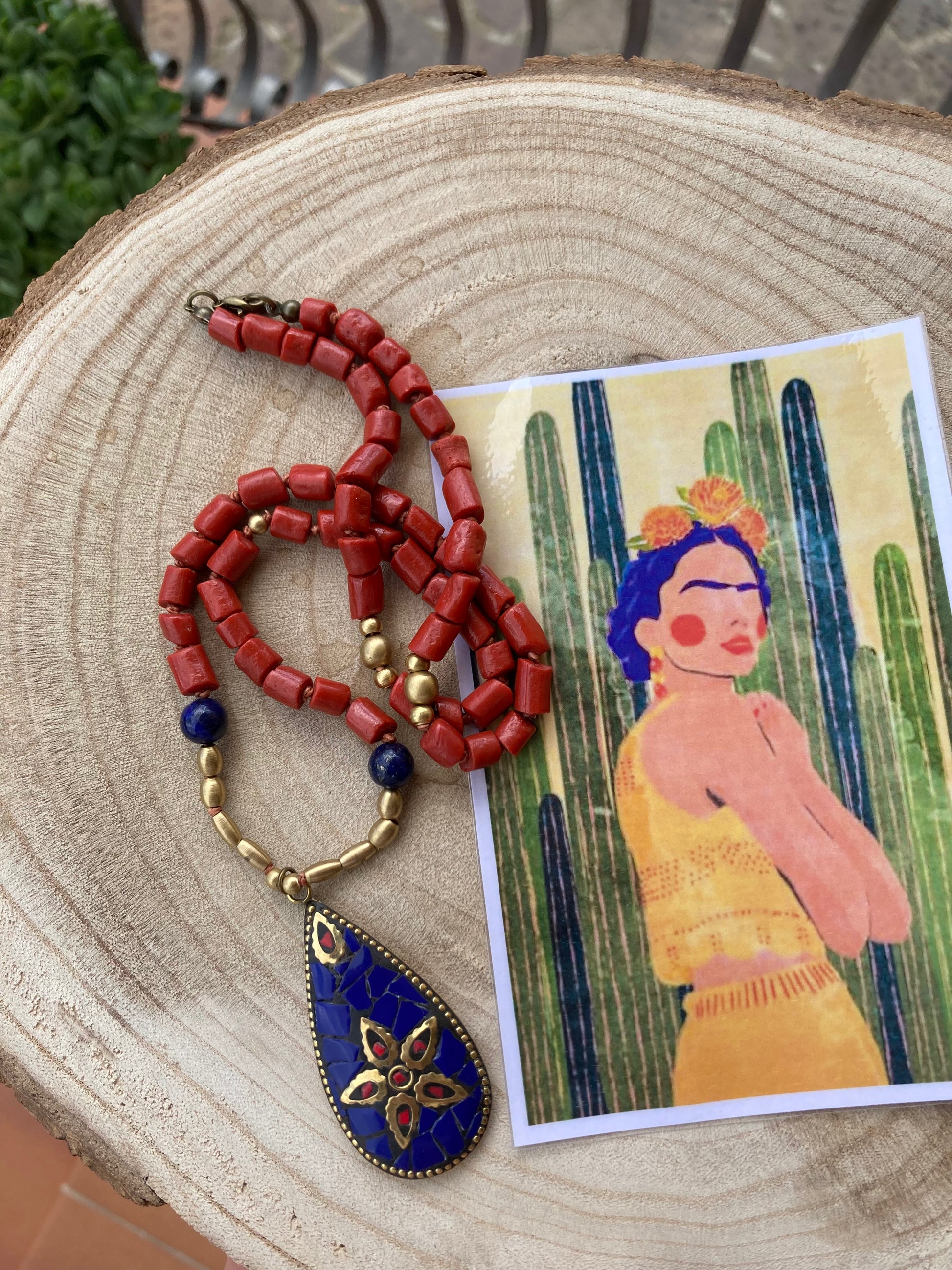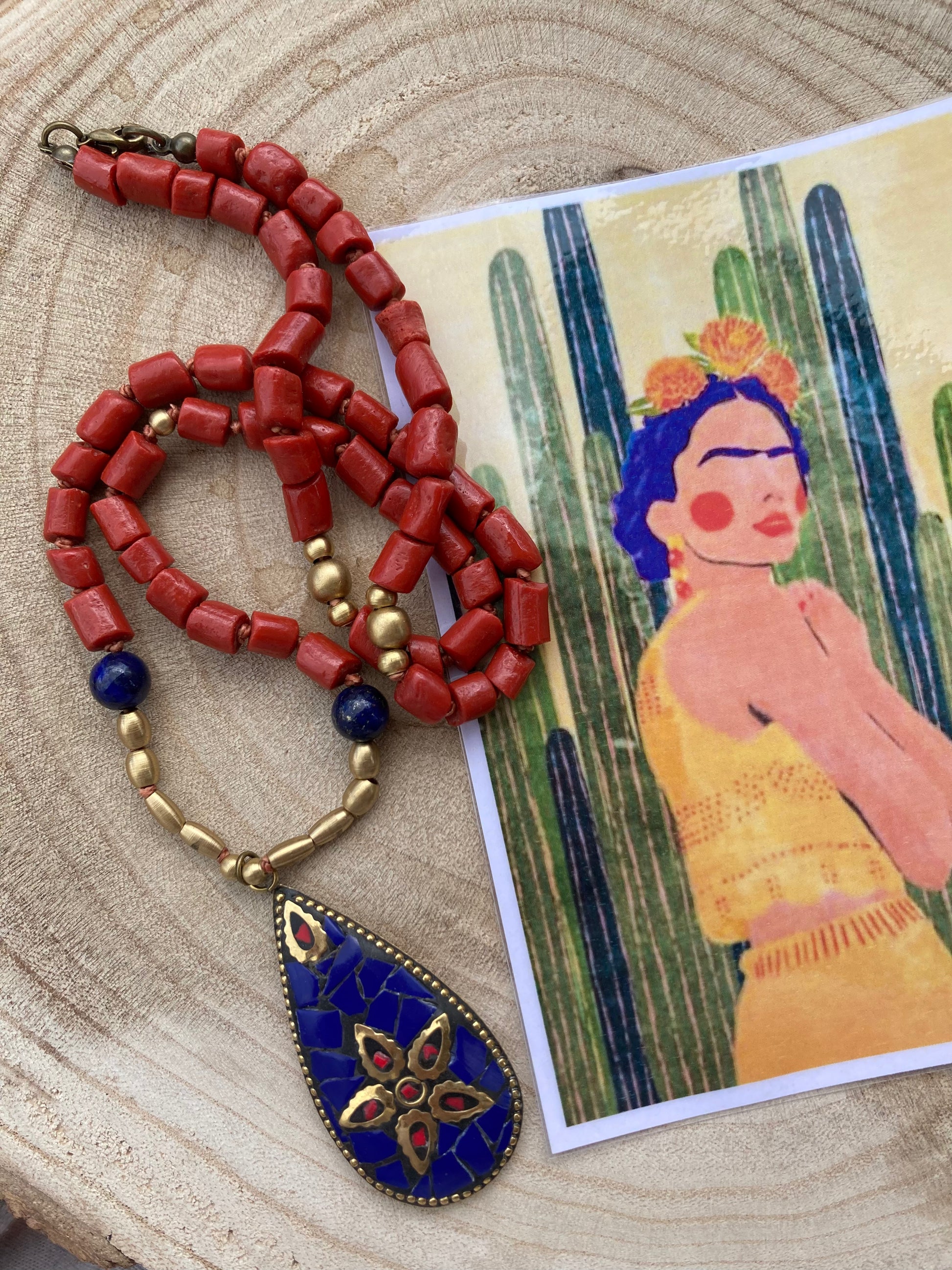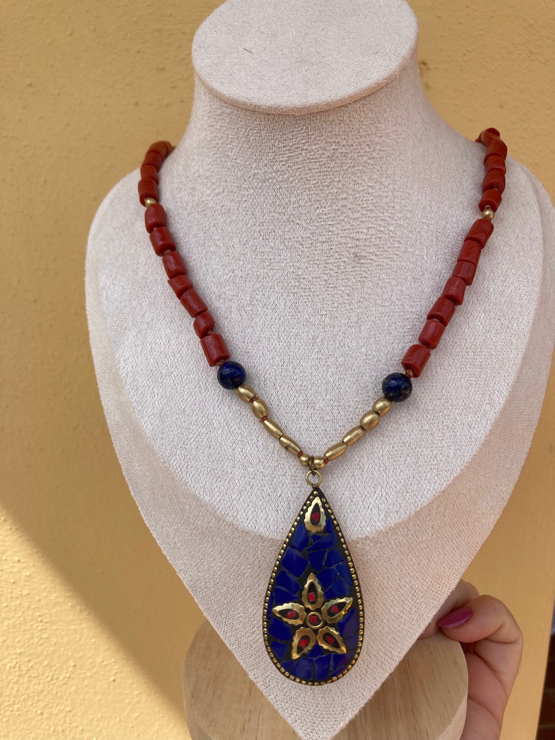 Corallo bambù più pendente etnico: combo perfetta per chi ama distinguersi. Ogni collana è un piccolo viaggio tra colori, culture e good vibes!!! Perfetta per dare carattere ad un look semplice o per completare uno stile più colorato e personale! Realizzata a mano con tanti poccoli nodi, pepite in ottone e Lapislazzuli ha una lunghezza di 56cm più la lunghezza del pendente che misura 5cm! Pezzo unico!