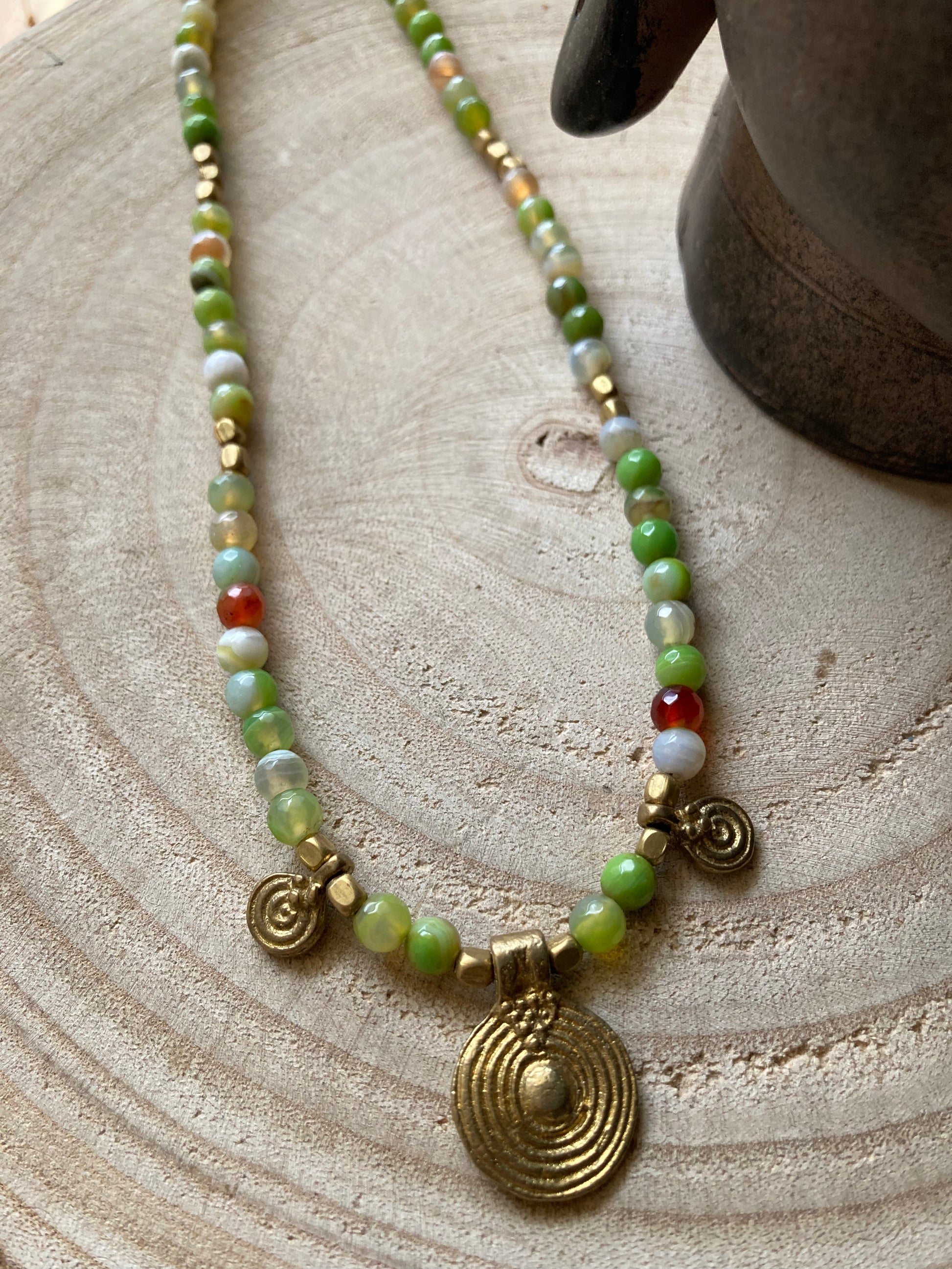 Collana etnica con pietre dure e pendenti in ottone naturale