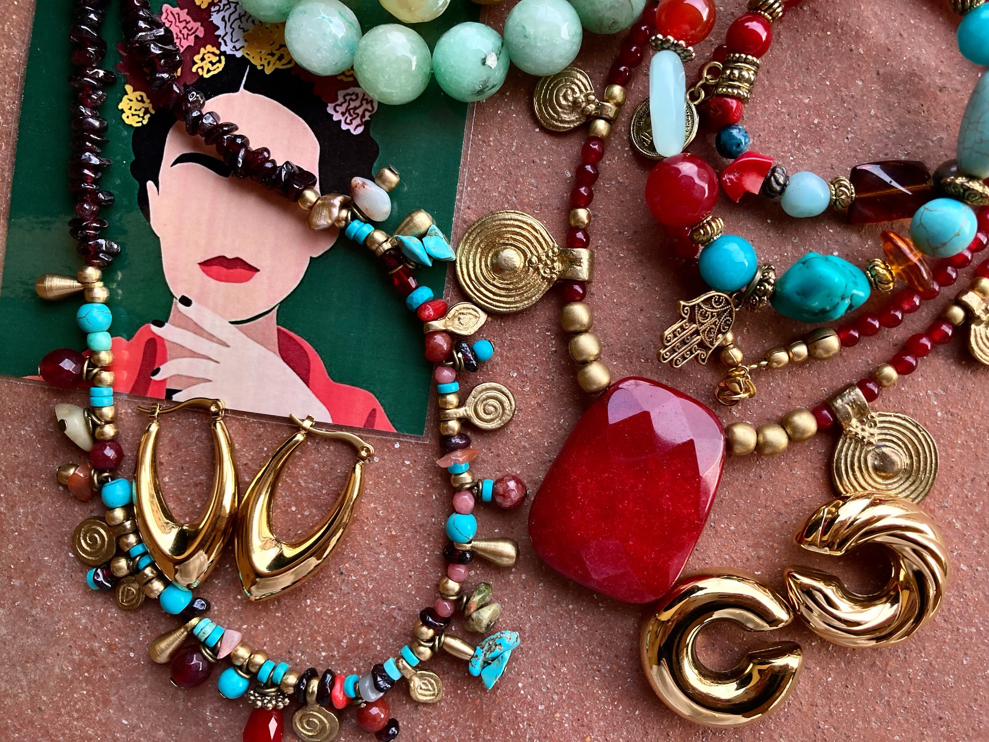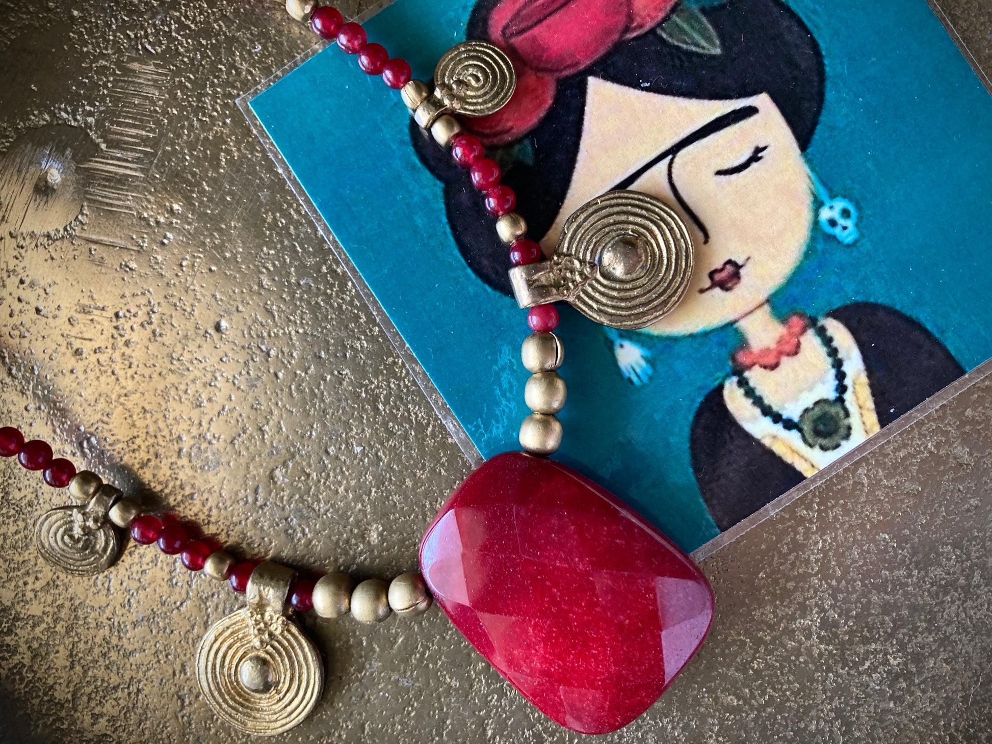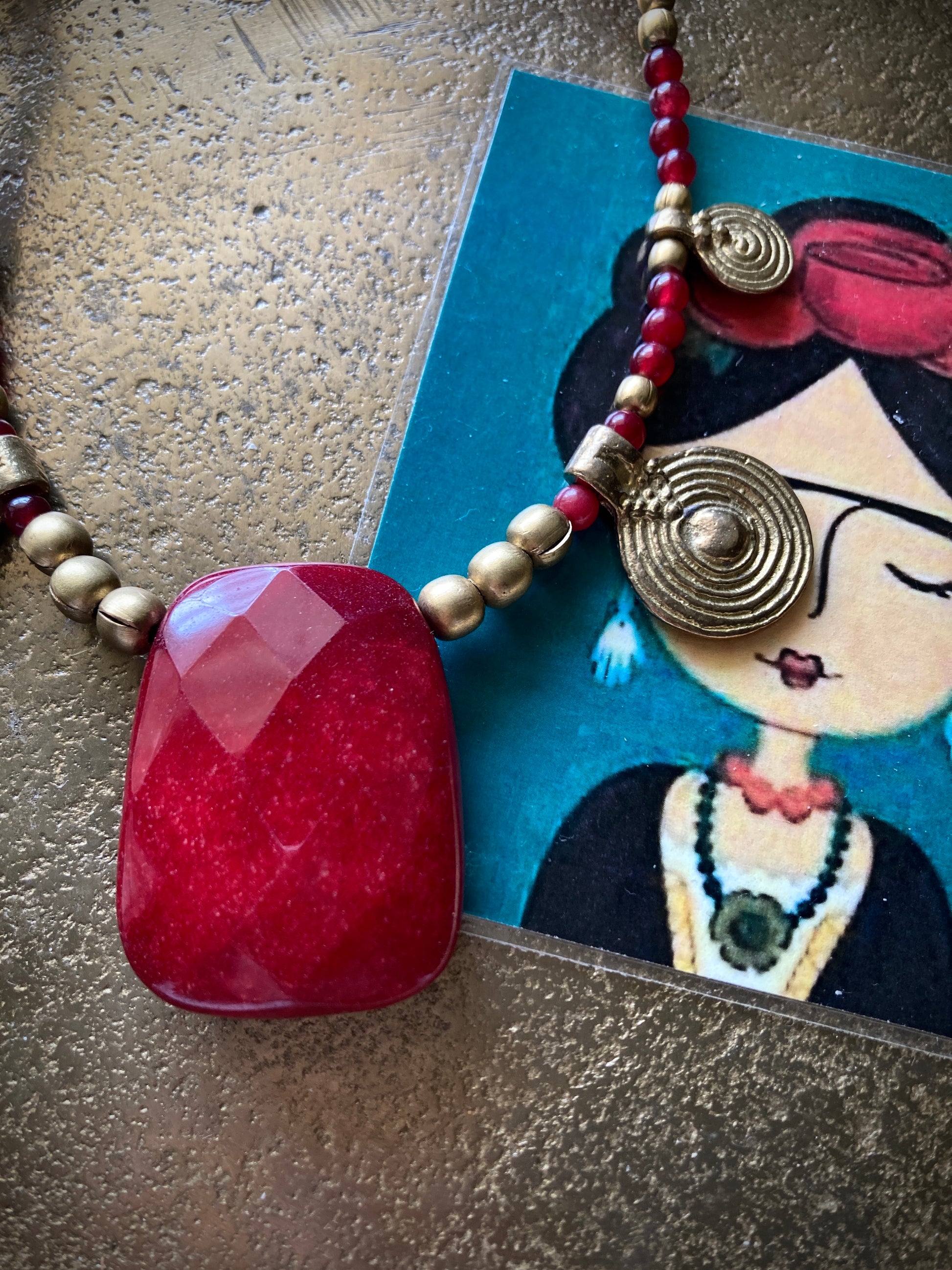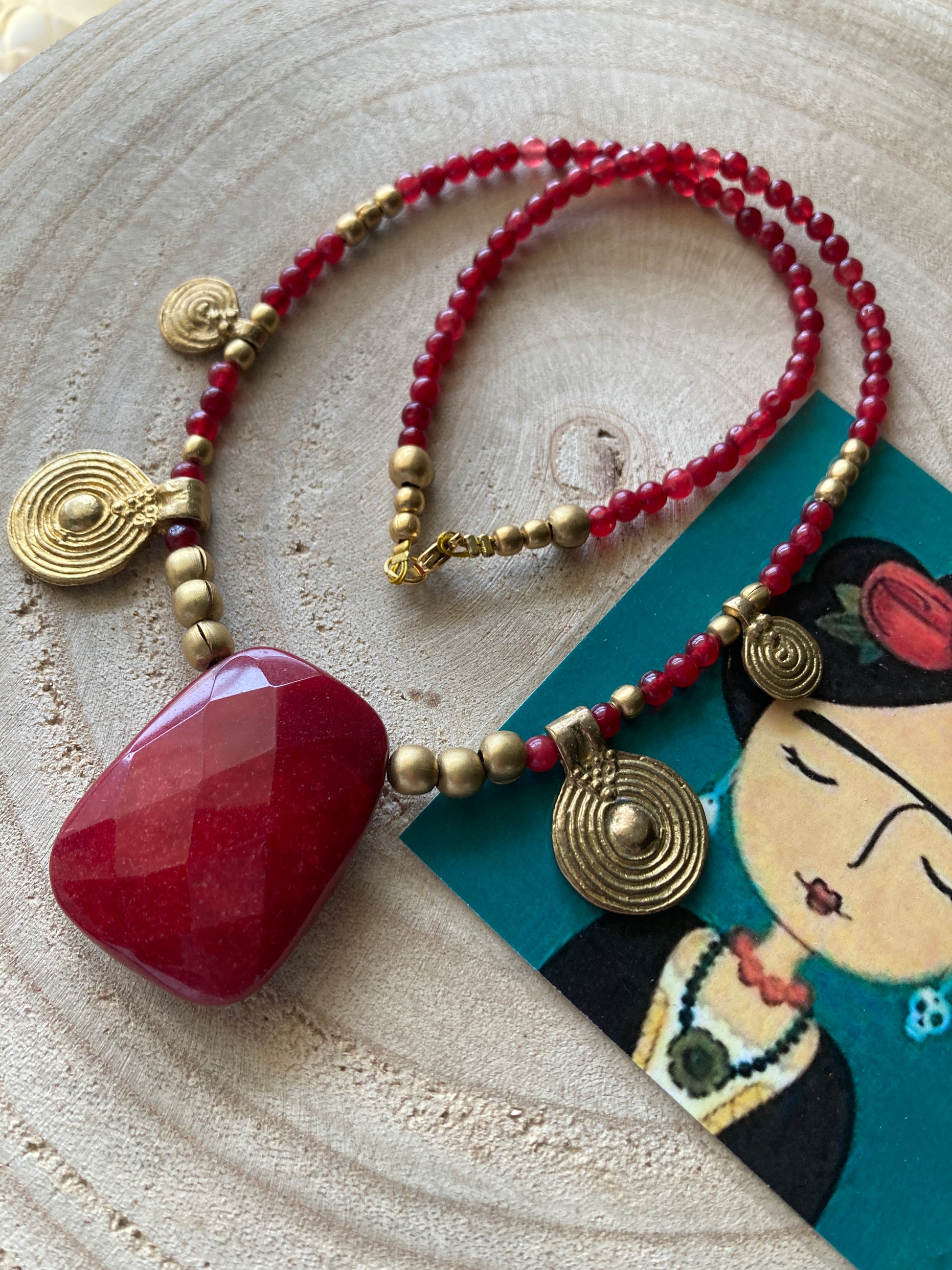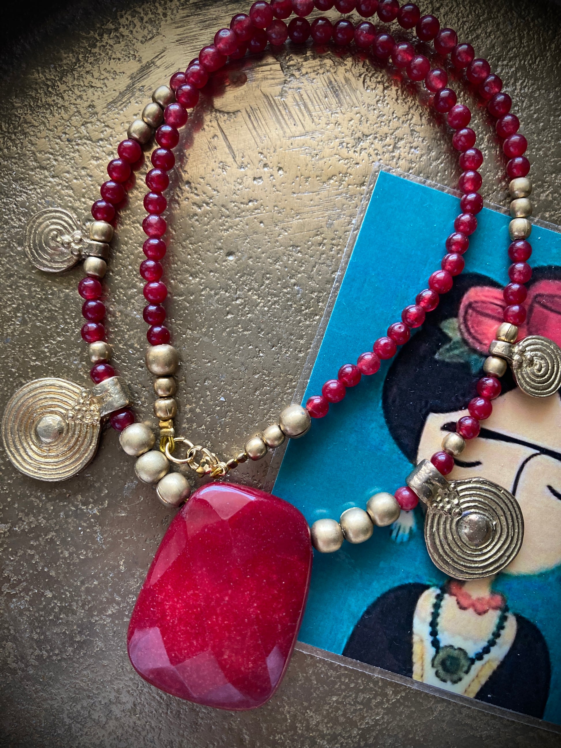Collana etnica unica, originale fatta a mano con agata rossa, pepite e pendenti in ottone e una meravigliosa pietra di giada rossa al centro! Tutto infilato con cura su cavetto in acciaio per un look unico e pieno di stile! La collana è lunga 52cm, mentre il pendente centrale 4cm