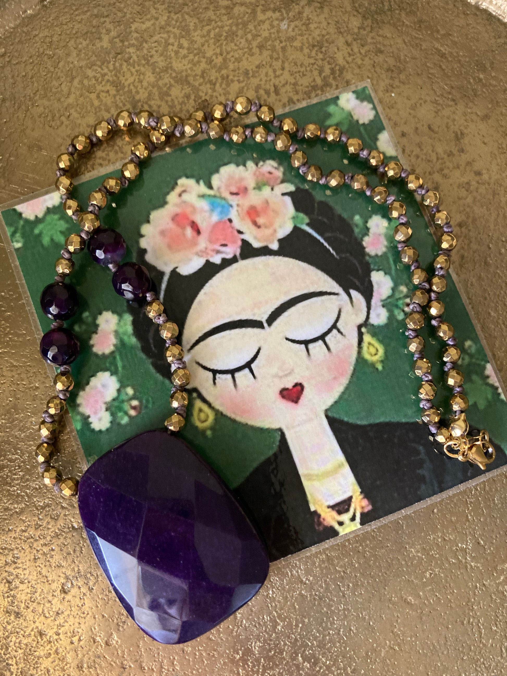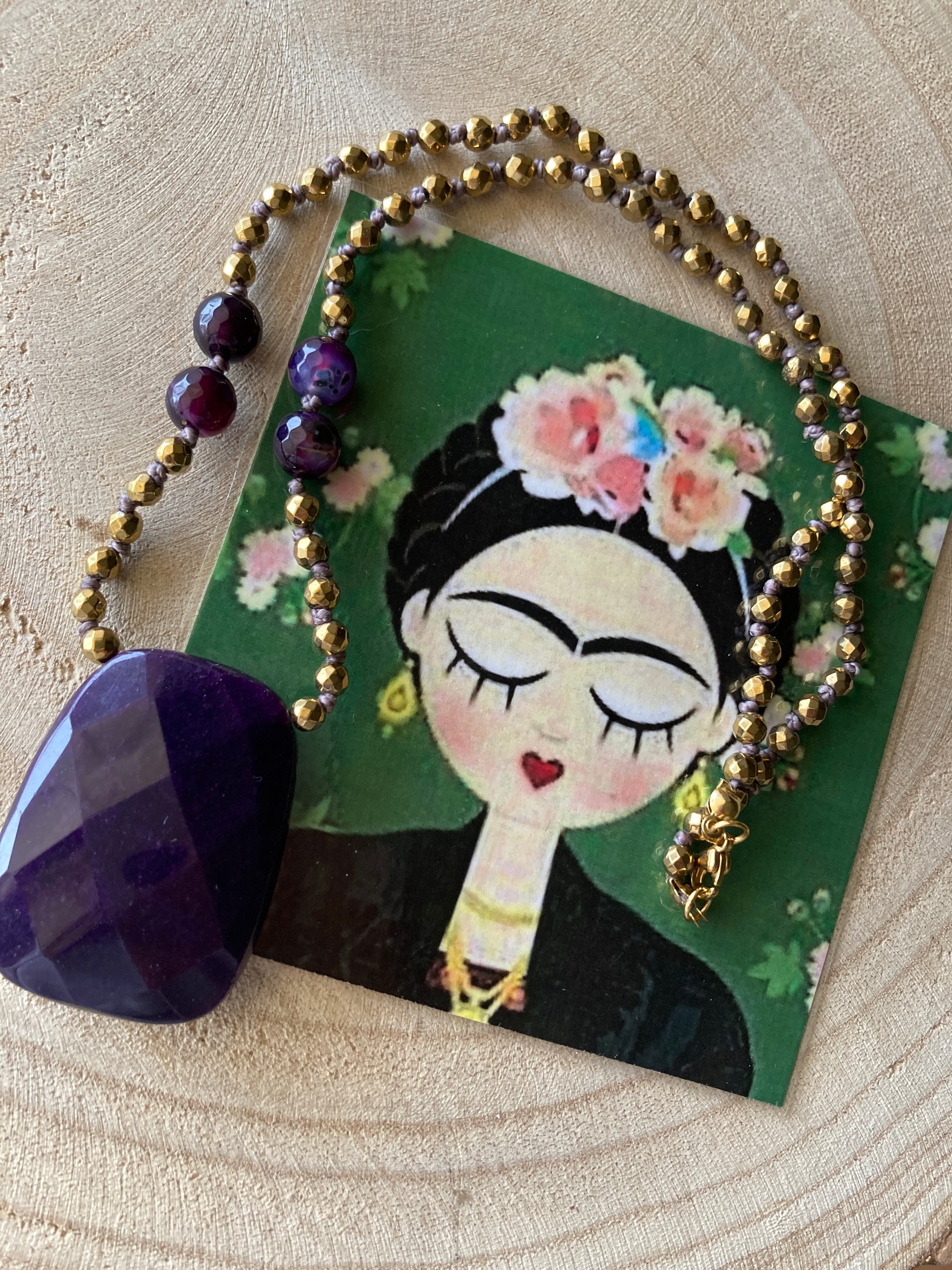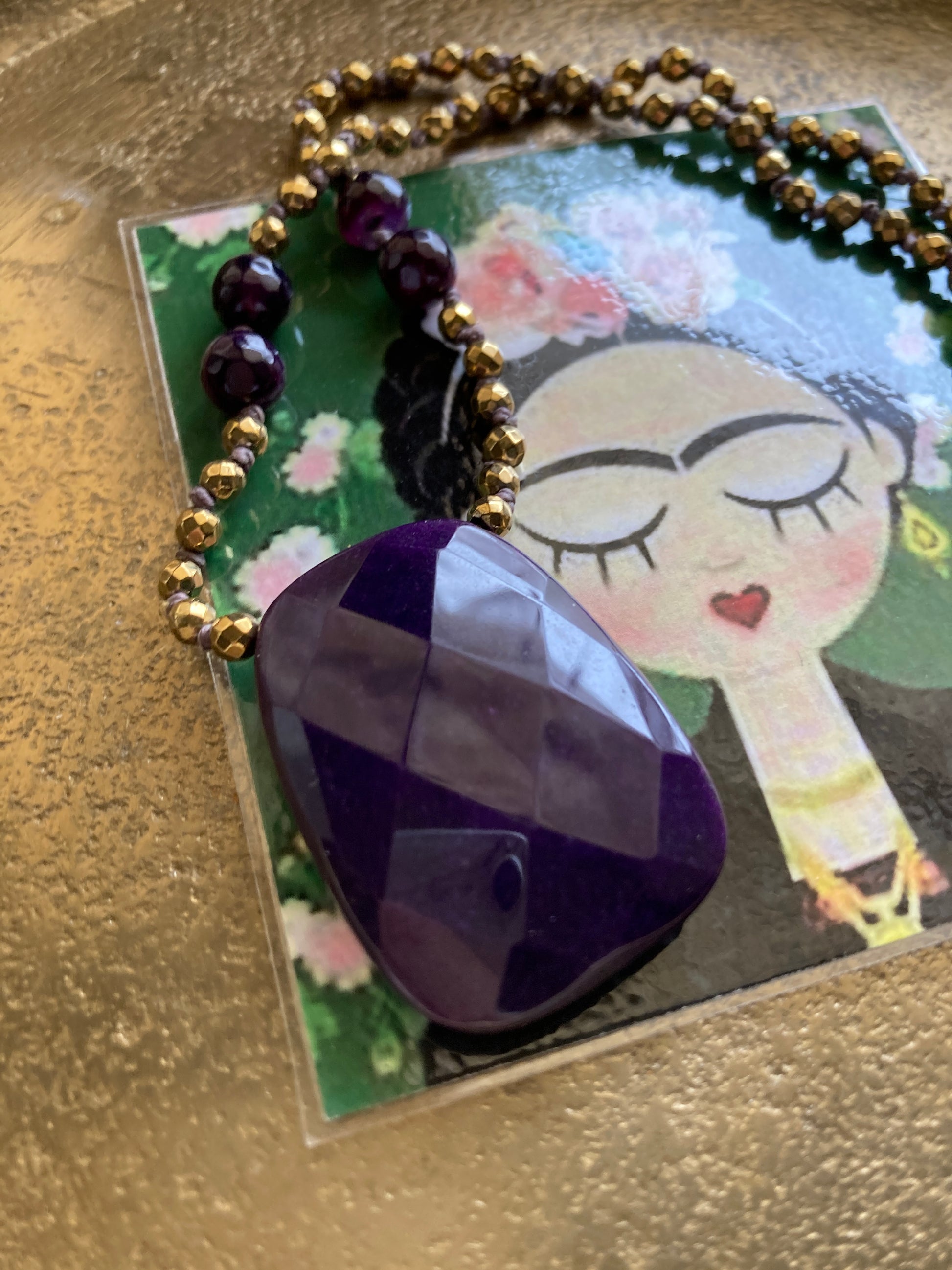 Questa collana fatta a mano è un mix di originalità e bellezza, con ematite dorata,pietre di agata viola e una meravigliosa pietre di giada viola al centro. Ogni dettaglio è curato con filo infilaperle per un risultato unico. Un accessorio perfetto per aggiungere un tocco di stile al tuo look! La collana ha una lunghezza di 47cm, mentre il pendente 4cm.