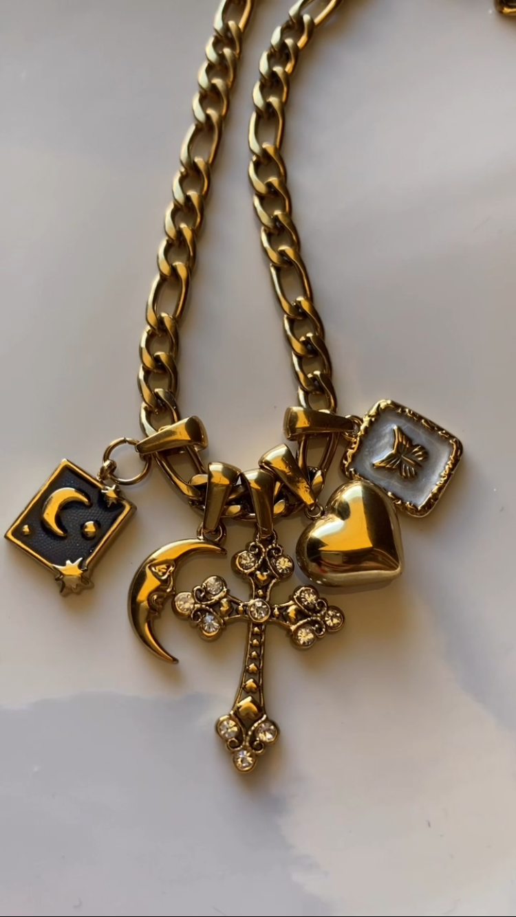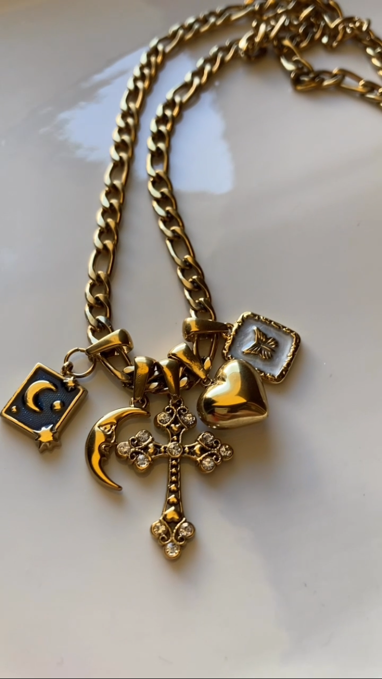 Collana in accaiio, finitura dorata, con 5 pendenti in acciaio! La bellezza della maglia, che riporta anche un po' indietro nel tempo, abbinata a 5 charms in acciaio, una sequenza che ho pensato di realizzare, scegliendo tra i ciondoli che ho disponibili! Questo significa che non si trova in altri shop!!!
