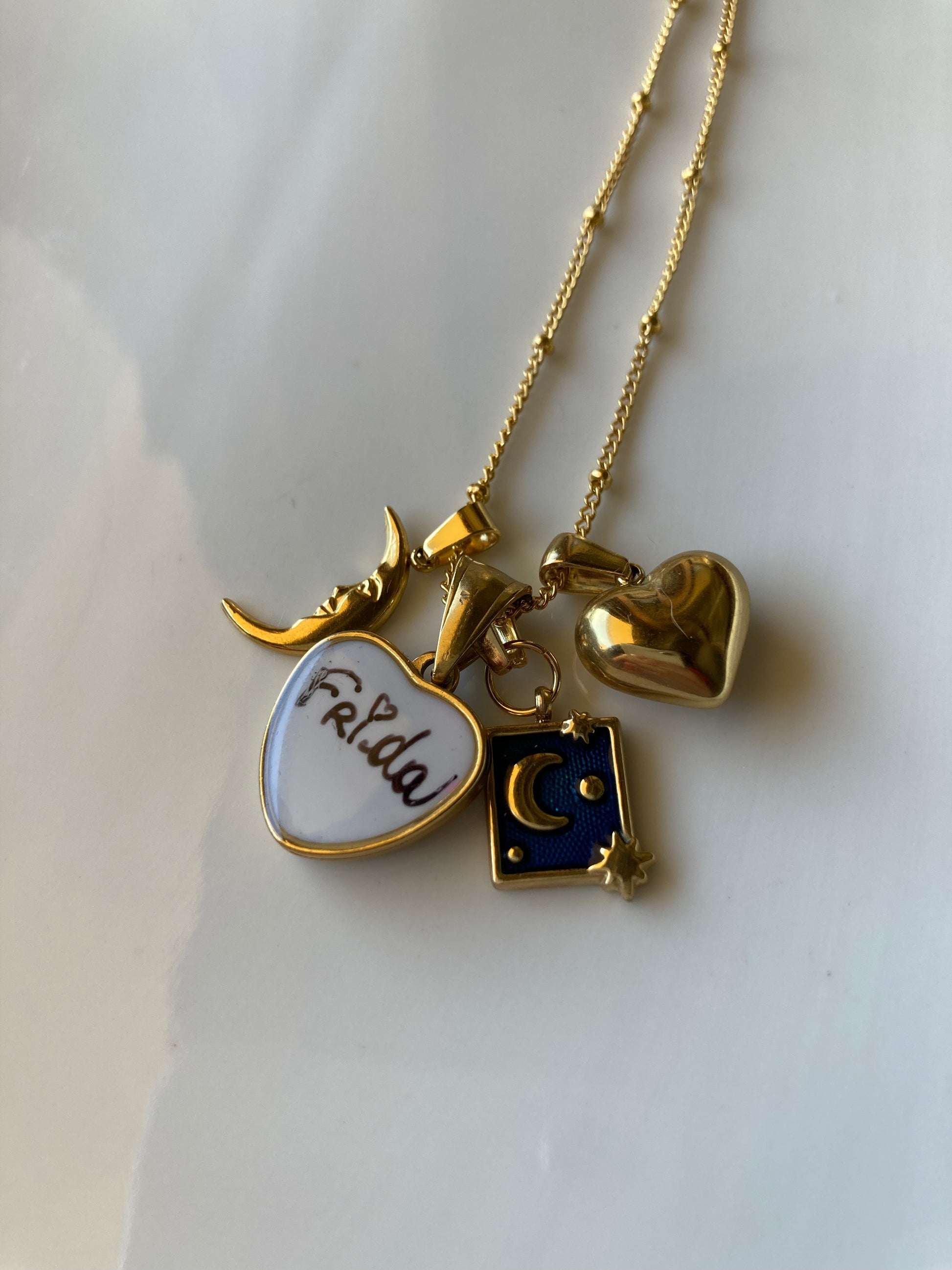 Il pendente con la scritta "Frida" è realizzato a mano, in resina.