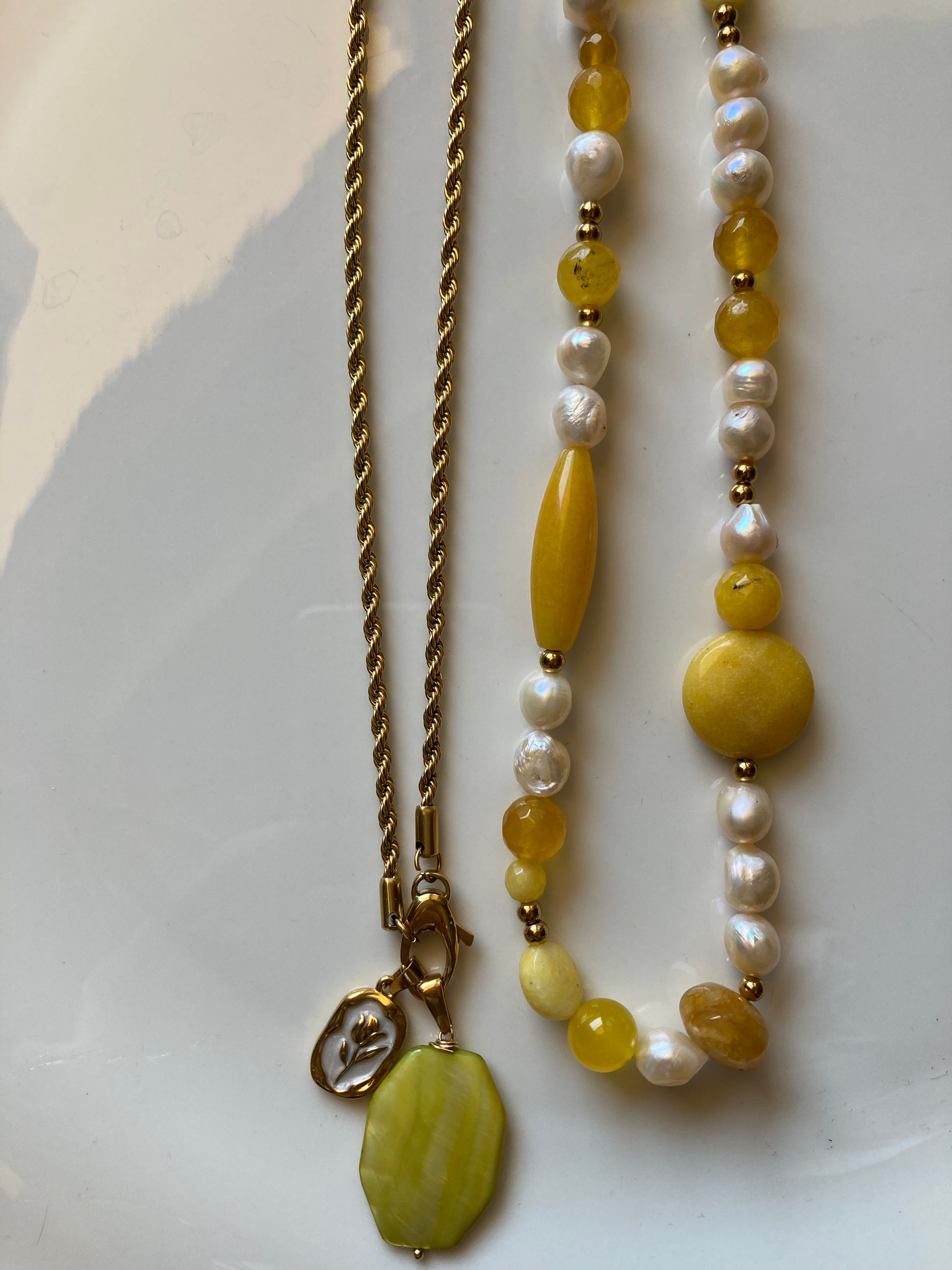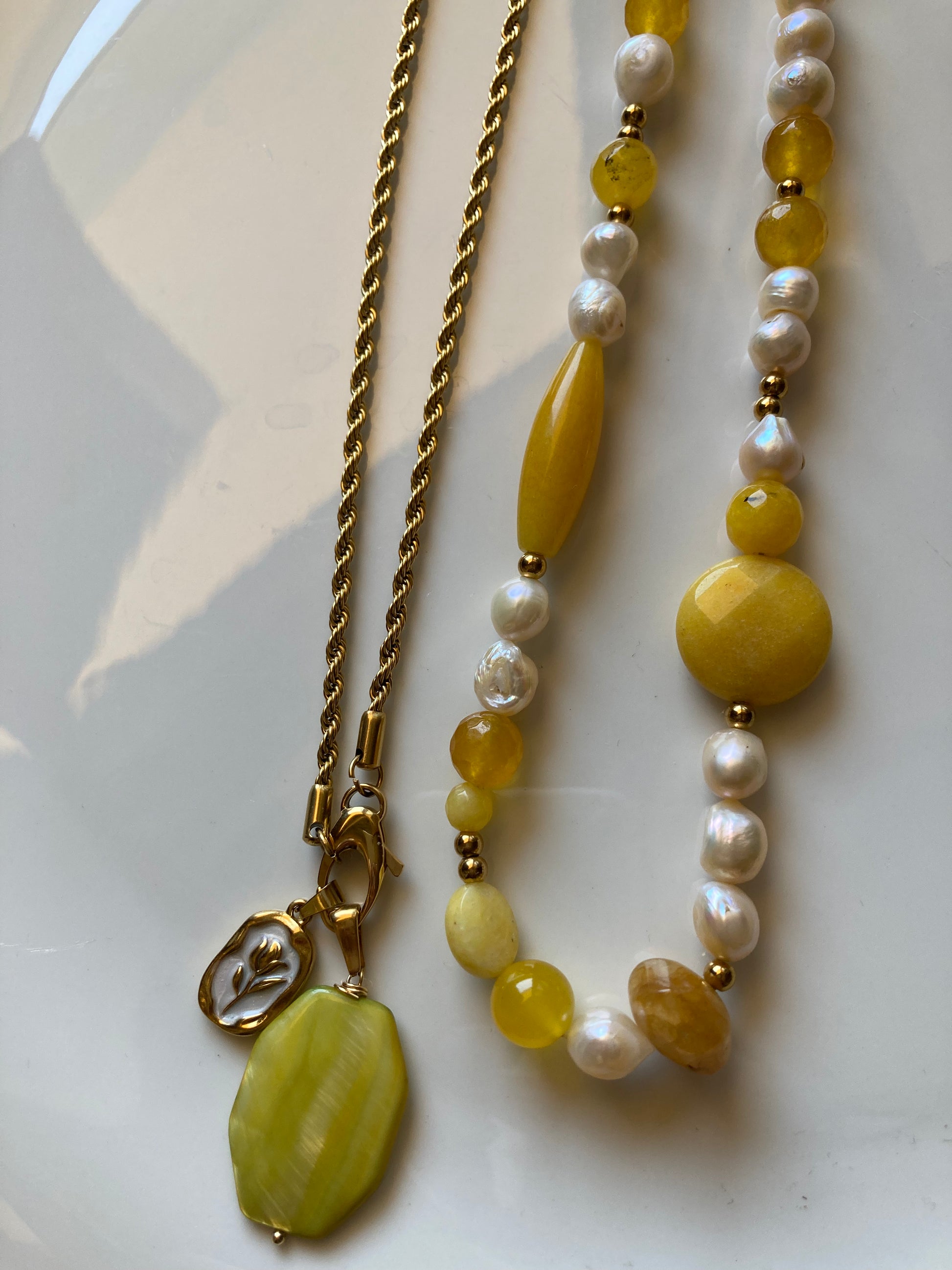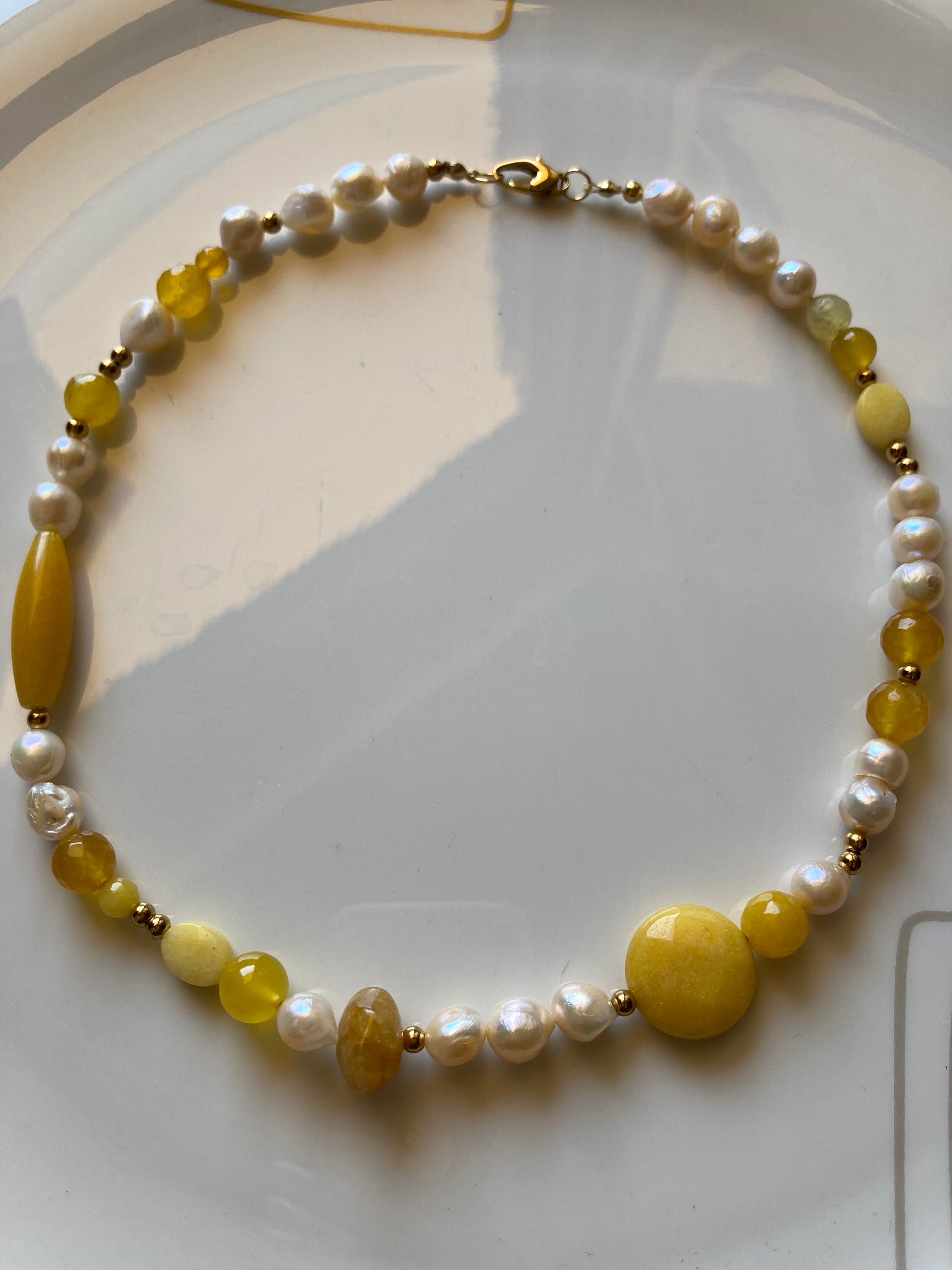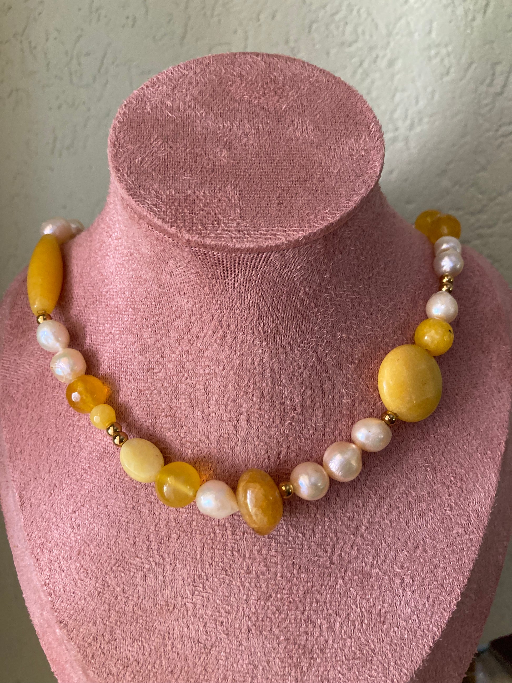 Un girocollo un po' fuori dal comune, un mix tra perle di fiume, pietre dure come Agata e Giada gialla