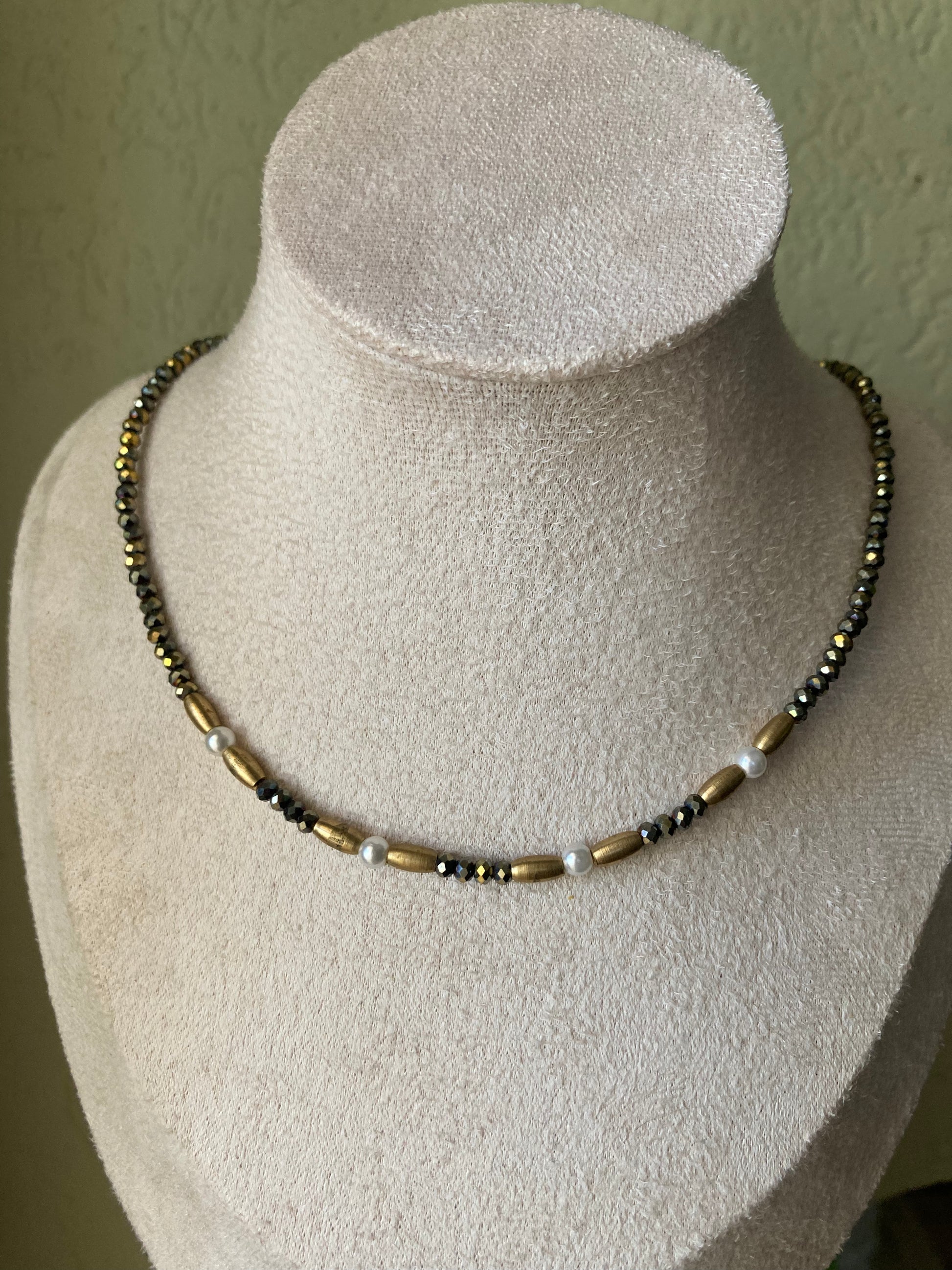 Collana realizzata a mano su cavetto in acciaio, cristalli 2mm, pepite in ottone e piccole perle. Lunghezza 40,5cm, chiusura classica con moschettone in acciaio