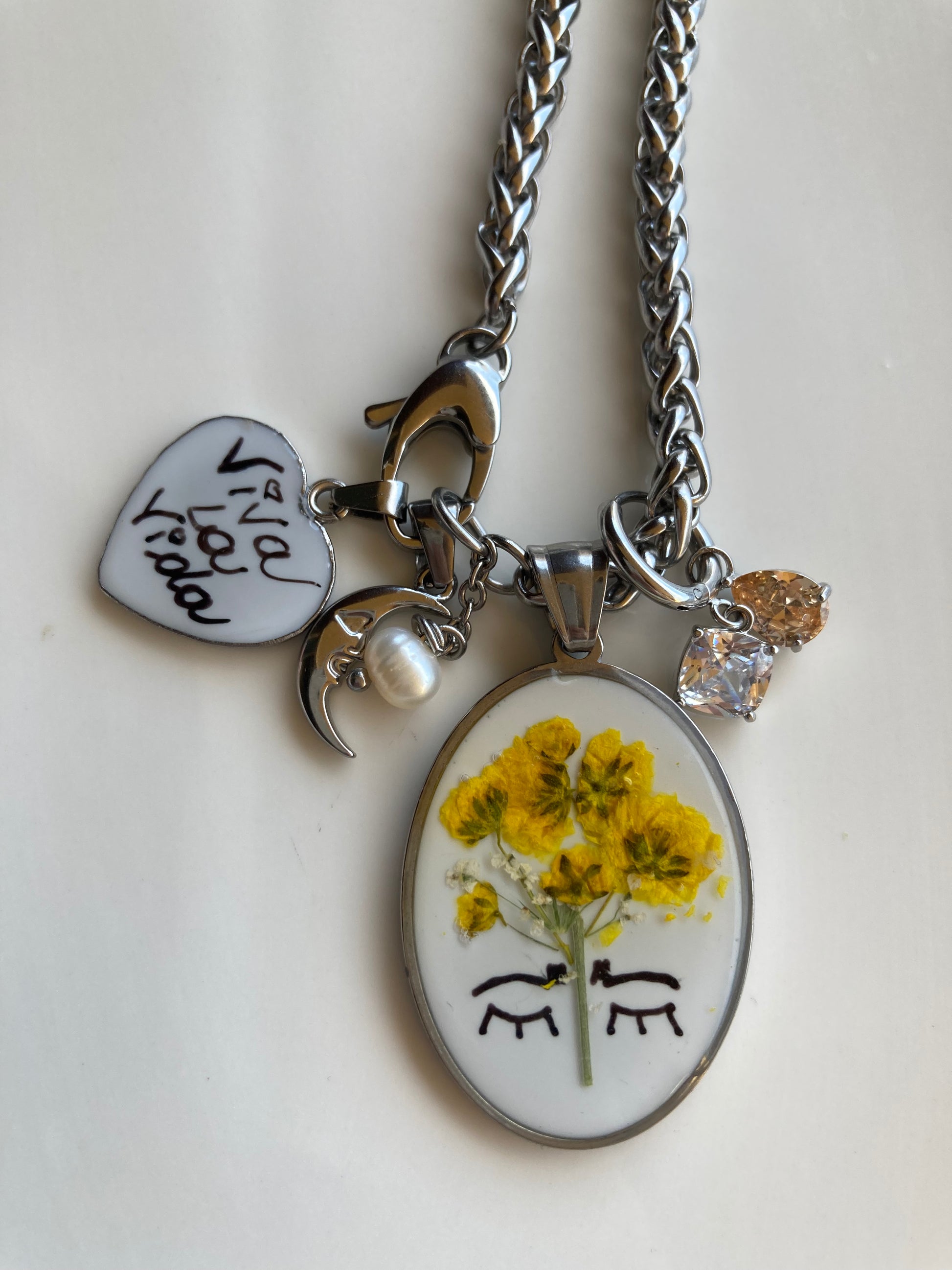 Il pendente con il fiore vuole rappresentare verosimilmente il volto di Frida. I pendenti sono tutti removibili e possono essere messi nell'ordine che più vi piace. La collana è lunga 55cm ed ho abbinato la chiusura grande