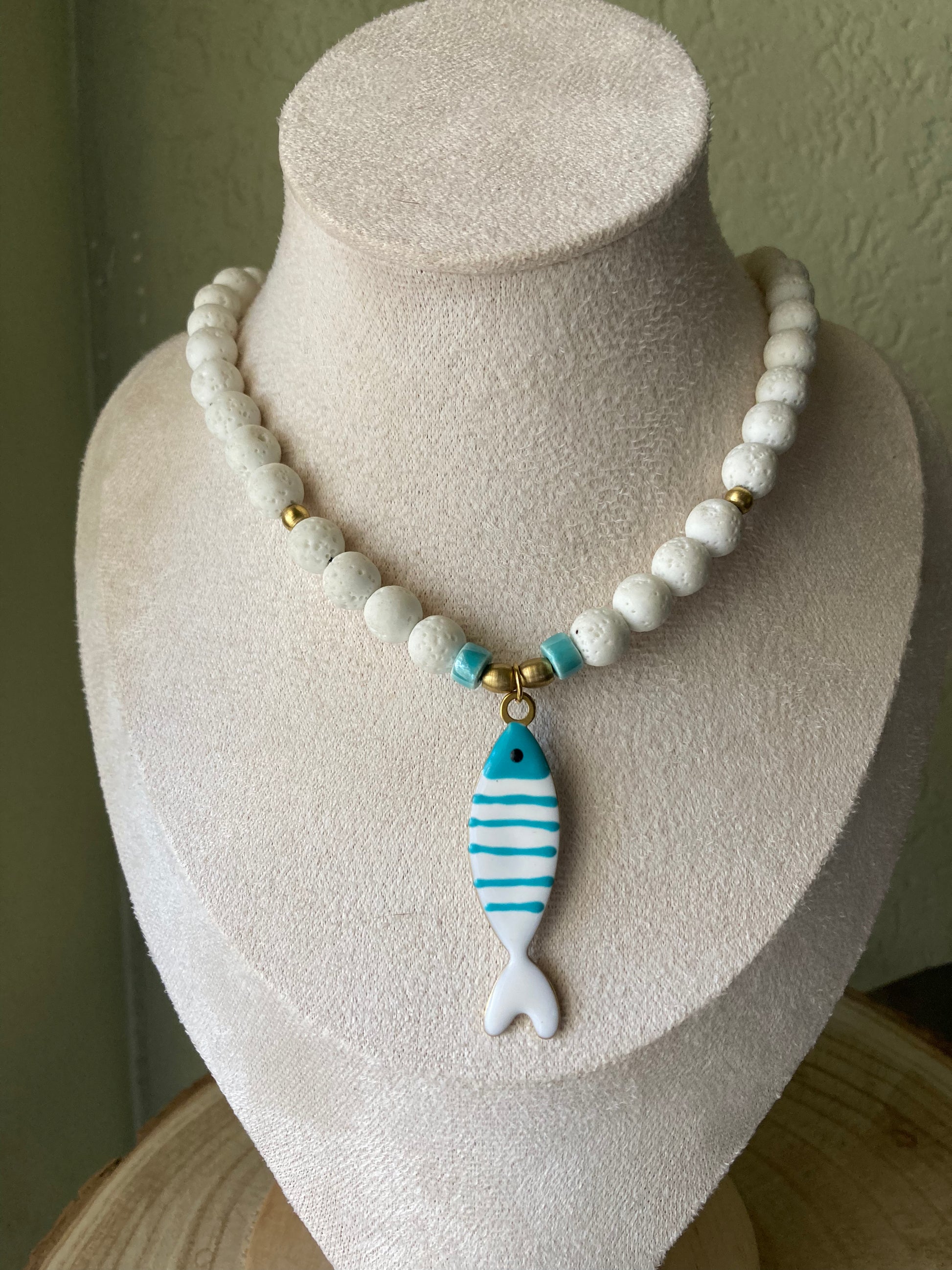 Un'altra bellissima creazione dalle vibrazioni estive!!! Una collana realizzata a mano con pietra lavica bianca, pepite in ottone, elementi in ceramica e ciondolo pesce in acciaio turchese