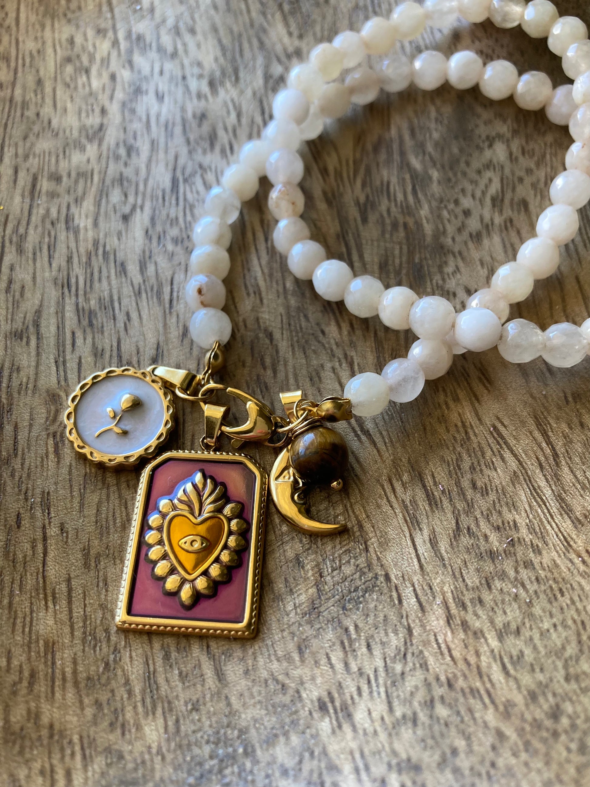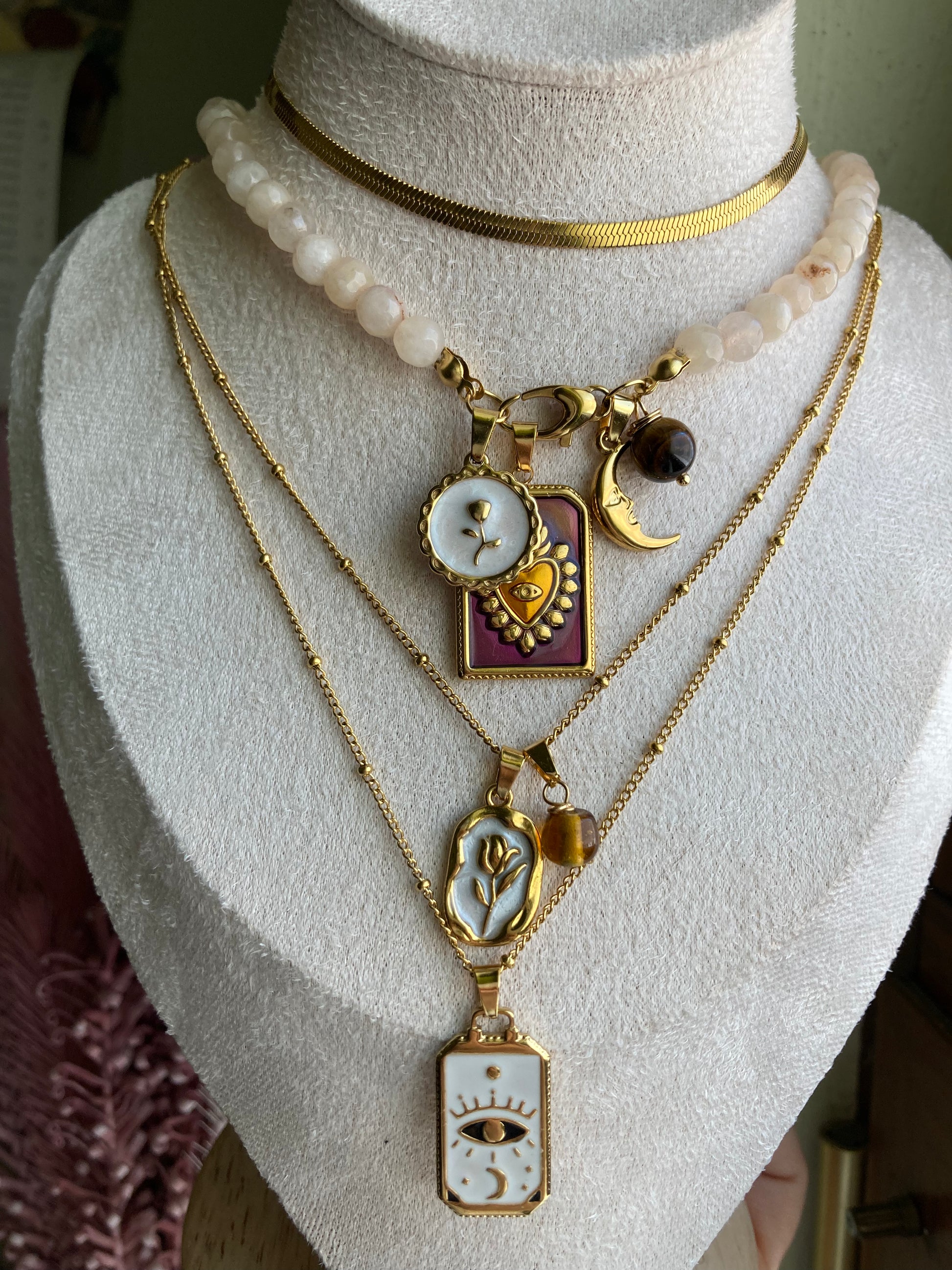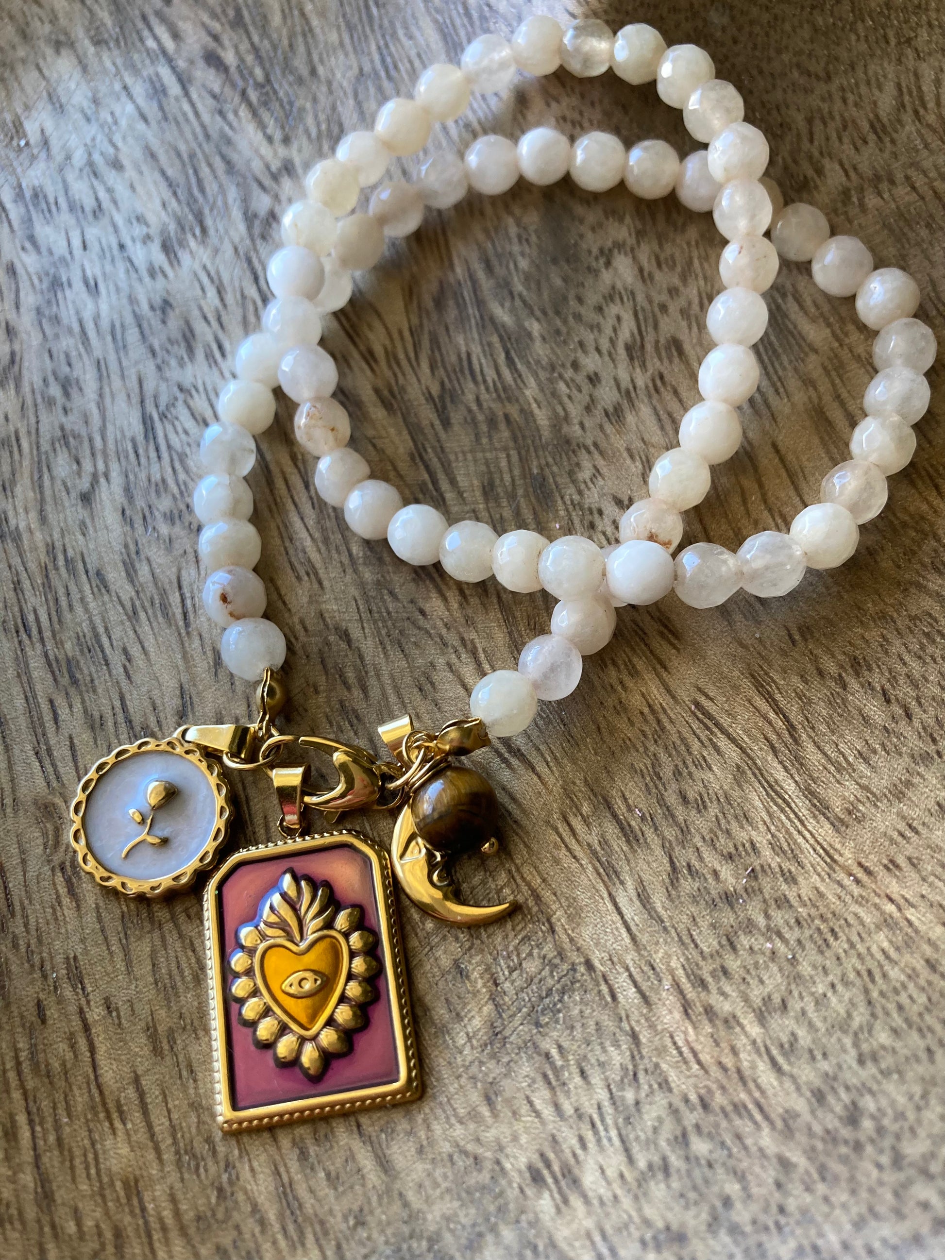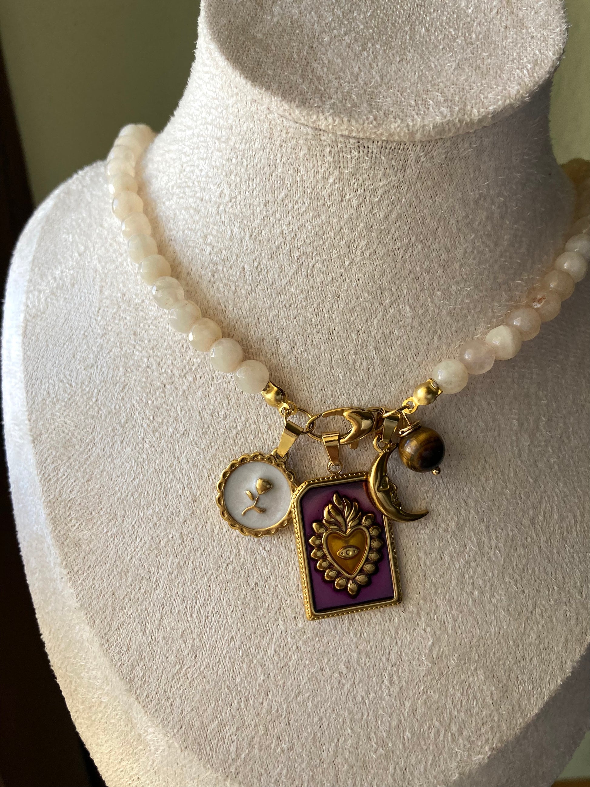 Collana realizzata a mano. Le pietre di Agata sono state infilate una ad una nel filo infilaperle e rifinita con elementi in acciaio. I pendenti consistono in tre ciondoli in acciaio e una pietra Occhio di Tigre.