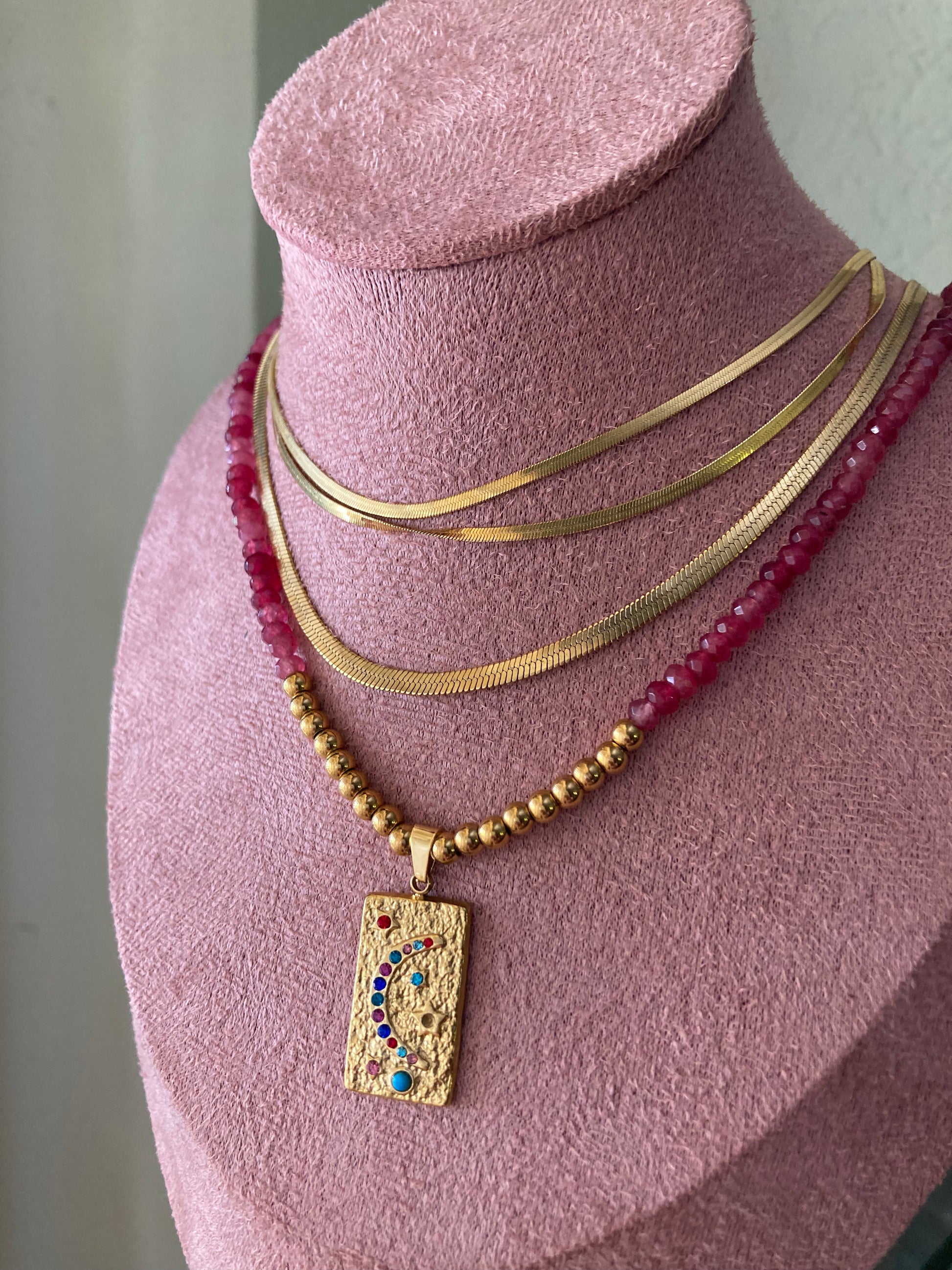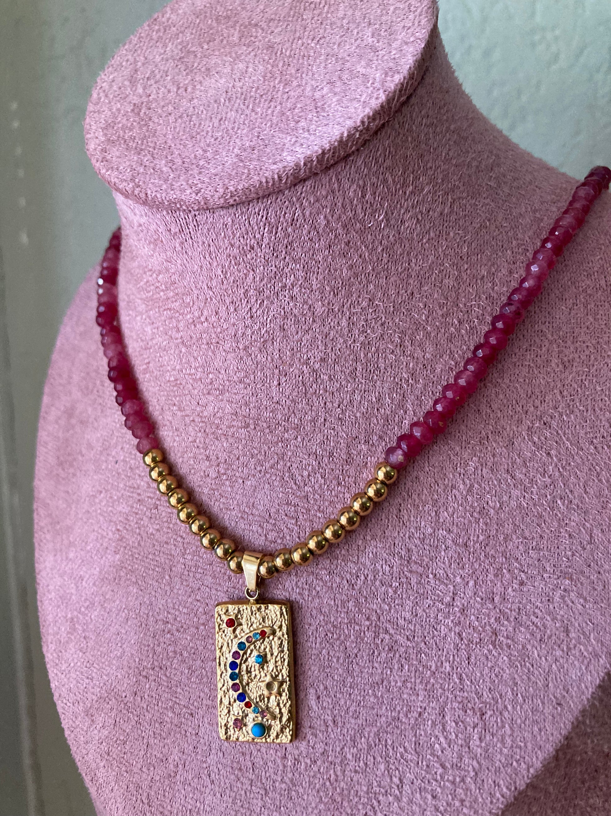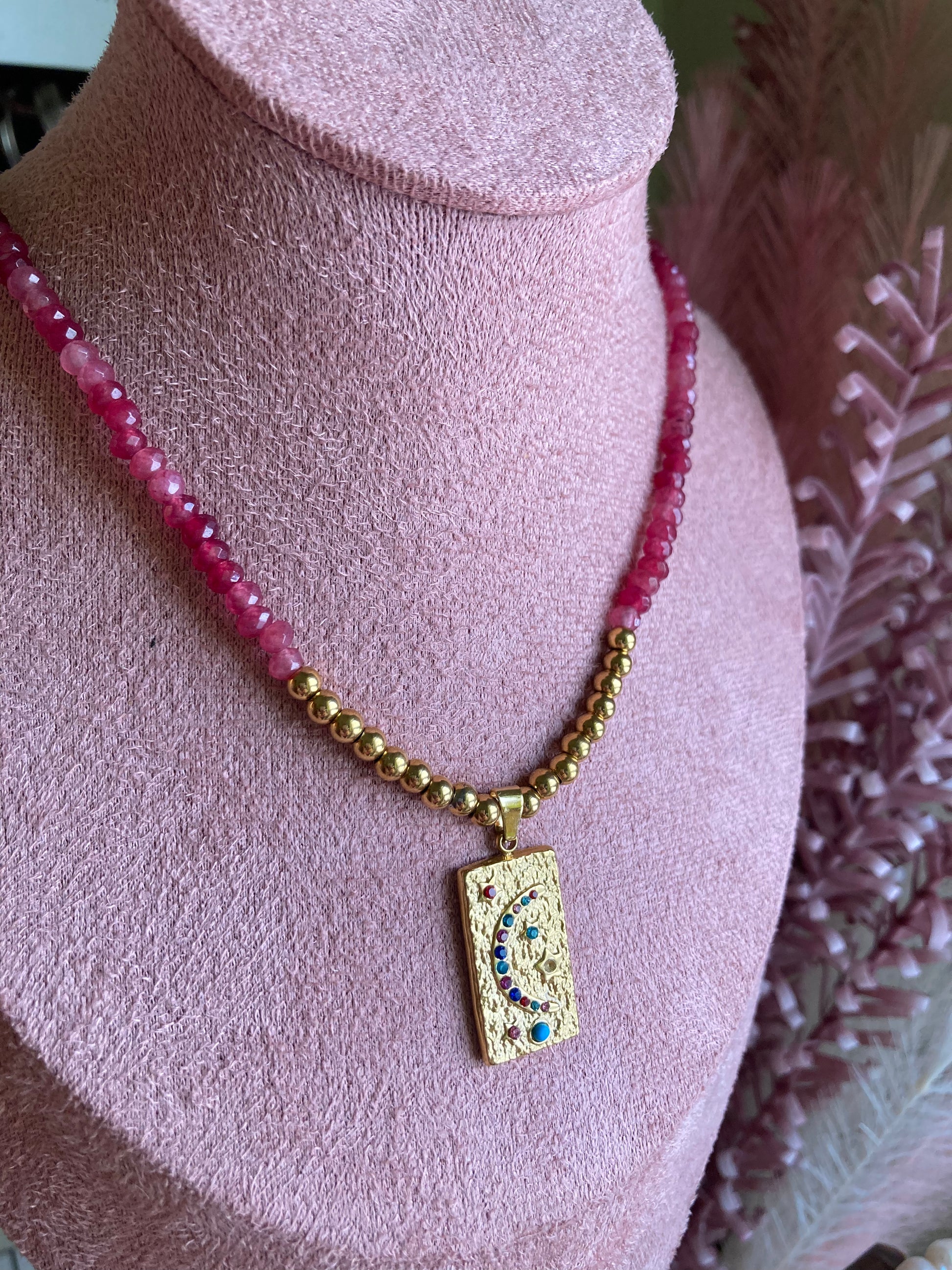 Collana realizzata a mano con pietre di Agata rosso fragola e centrale realizzato con pepite e ciondolo in acciaio dorato! Bella, elegante, delicata... Le pietre sono sui 3/4 mm, la lunghezza della collana è di 44cm.