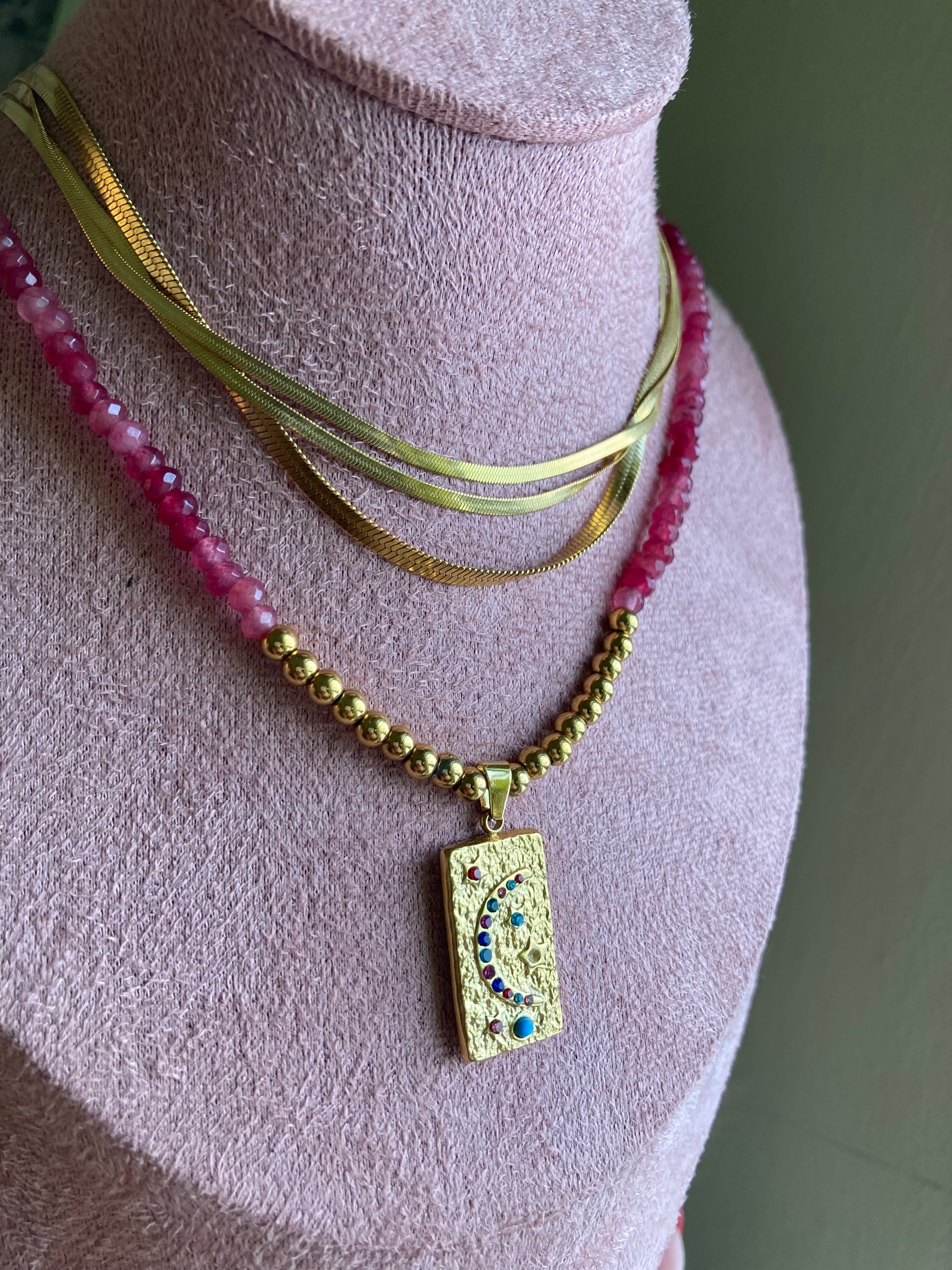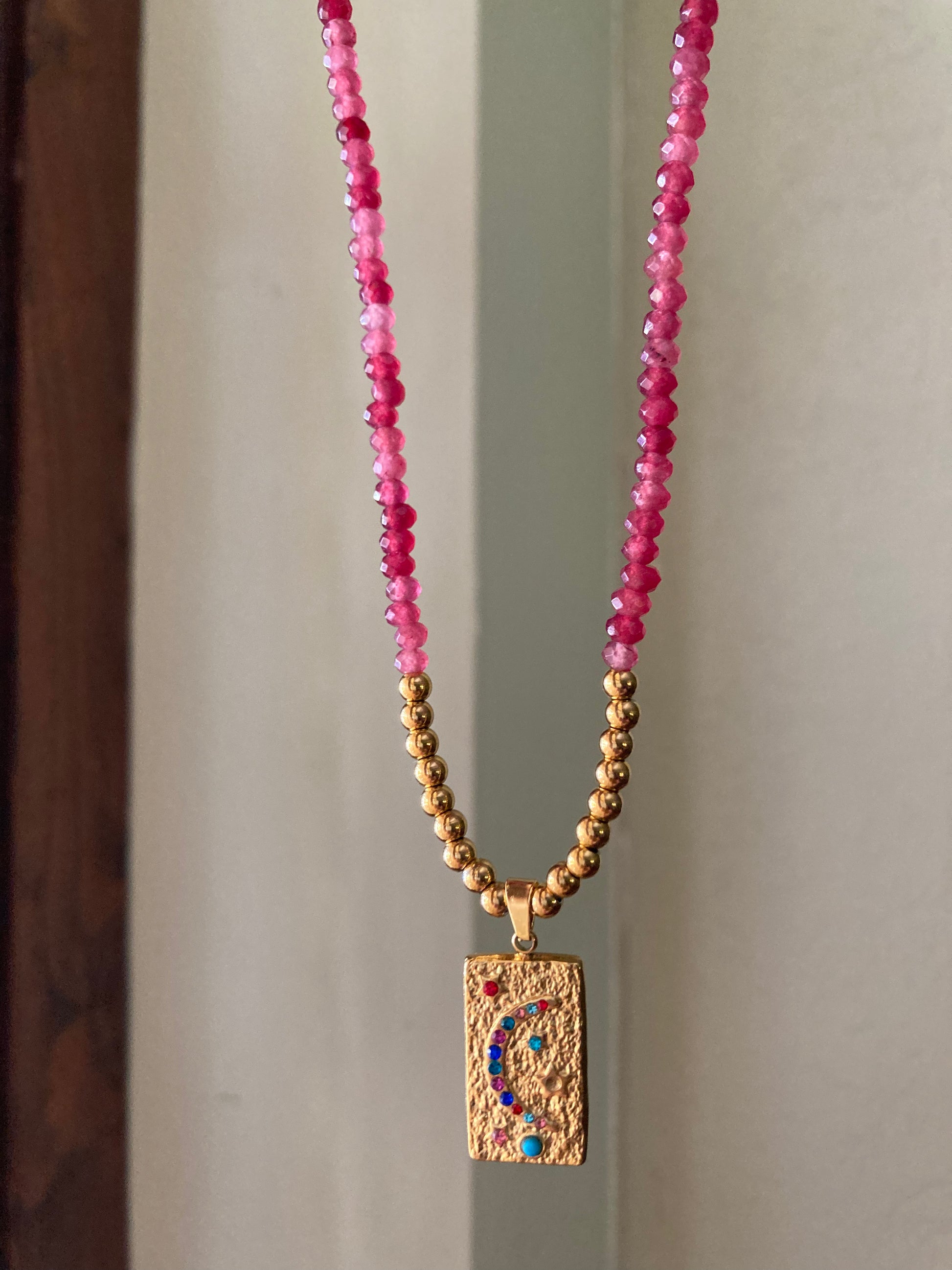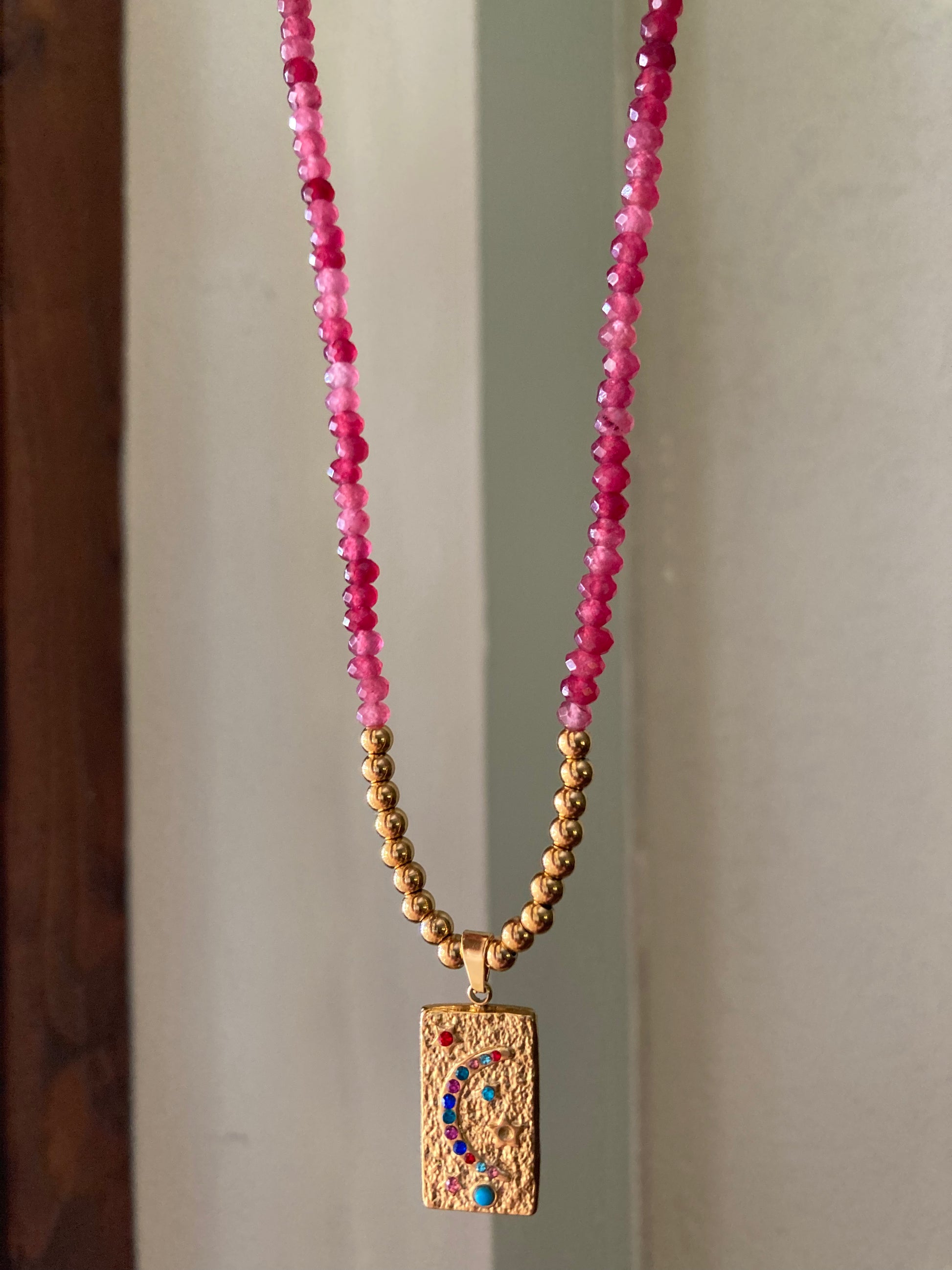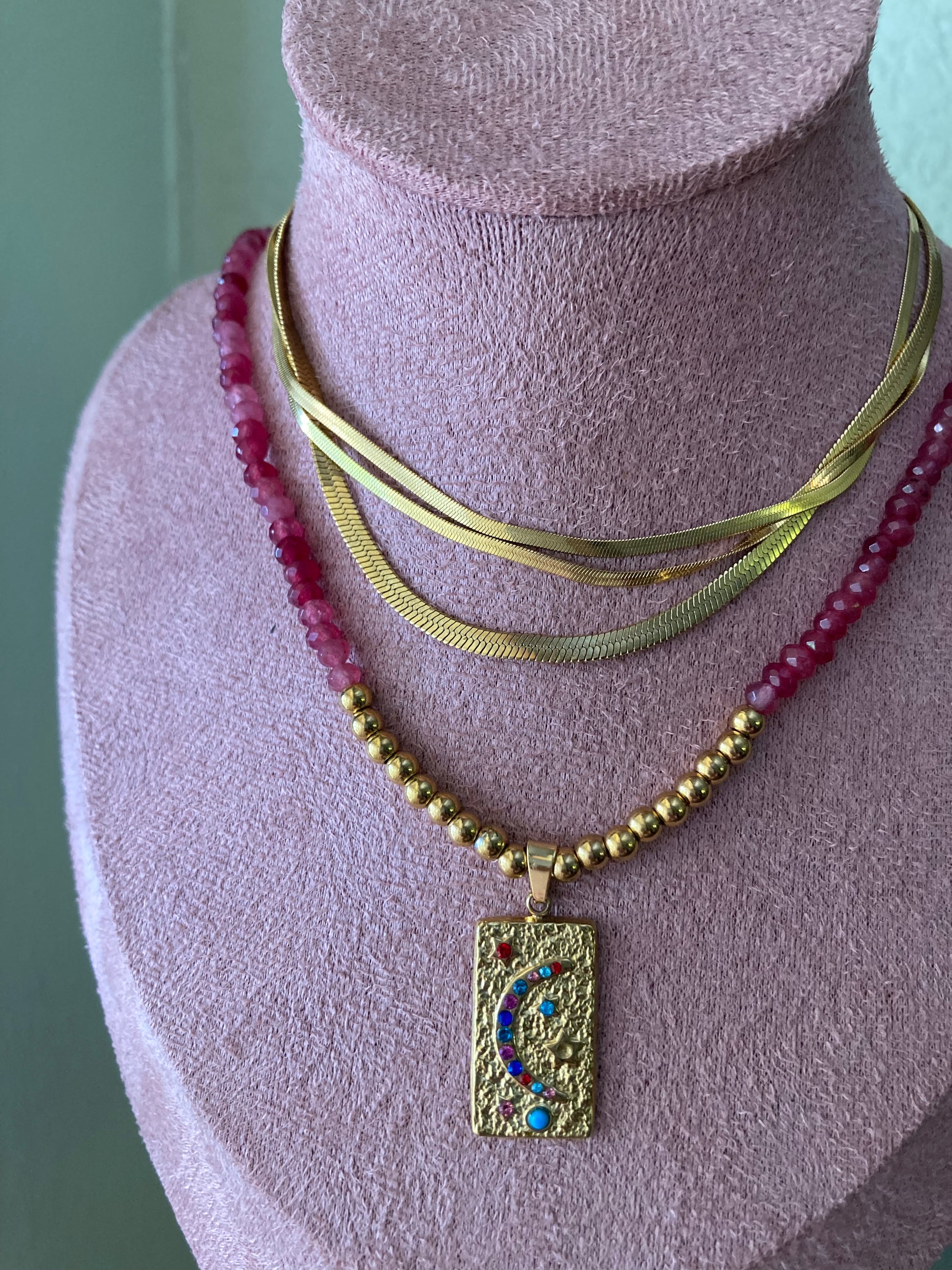 Collana realizzata a mano con pietre di Agata rosso fragola e centrale realizzato con pepite e ciondolo in acciaio dorato! Bella, elegante, delicata... Le pietre sono sui 3/4 mm, la lunghezza della collana è di 44cm.