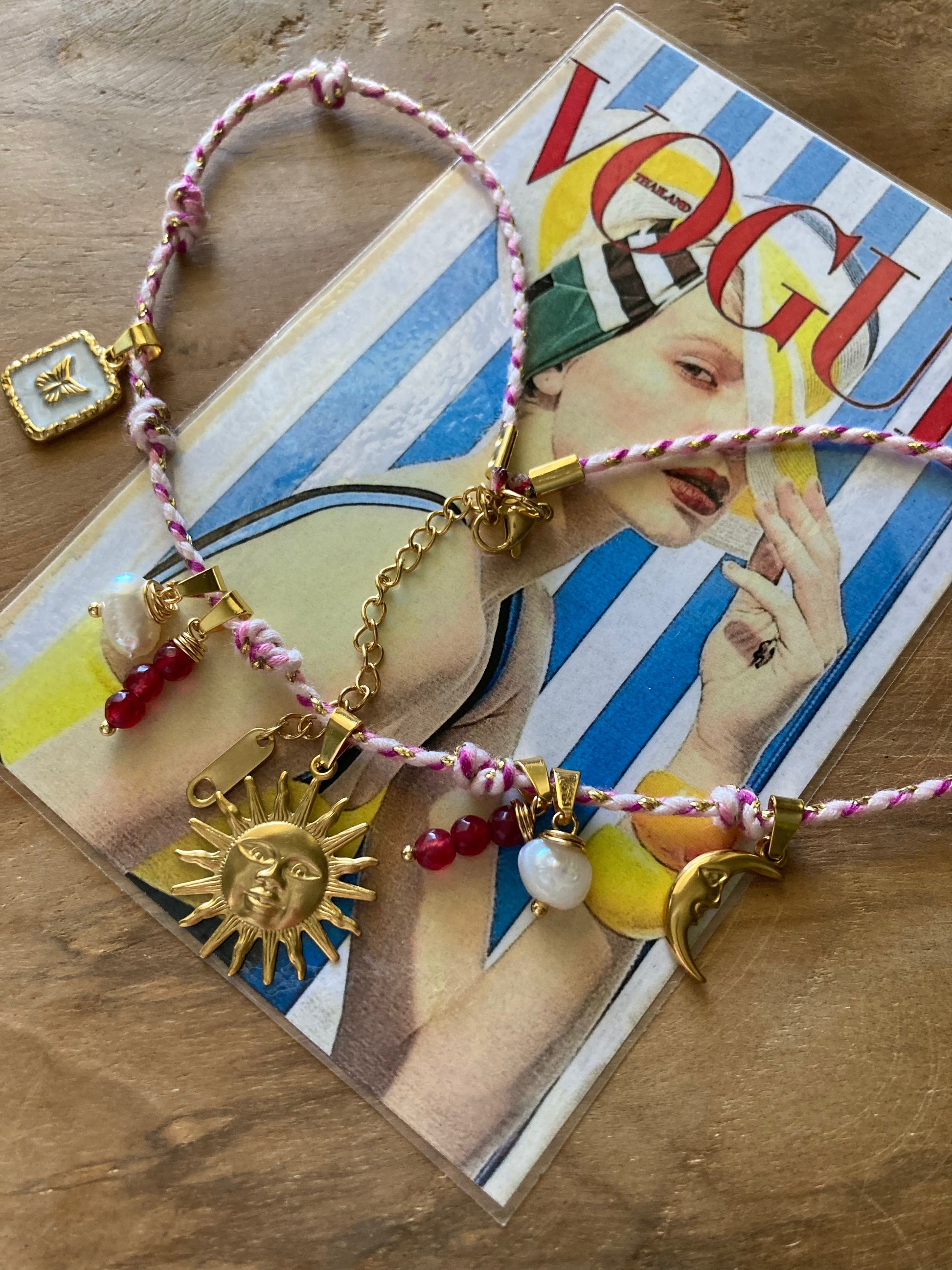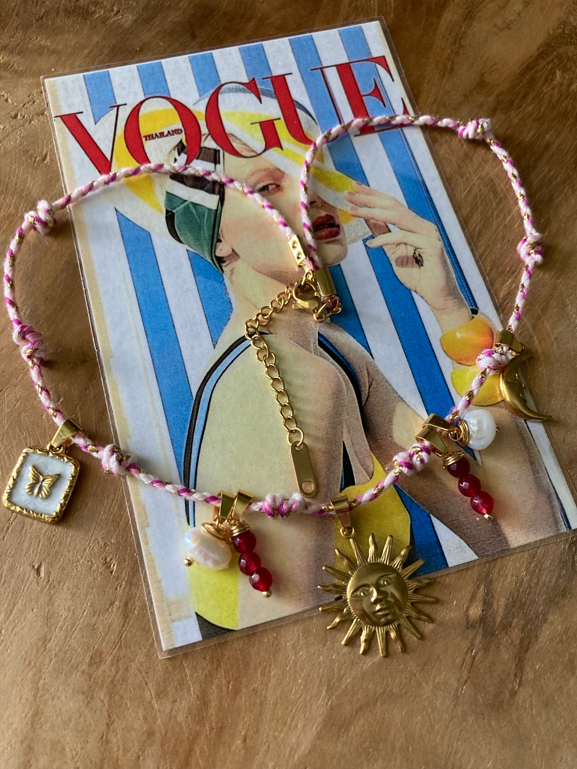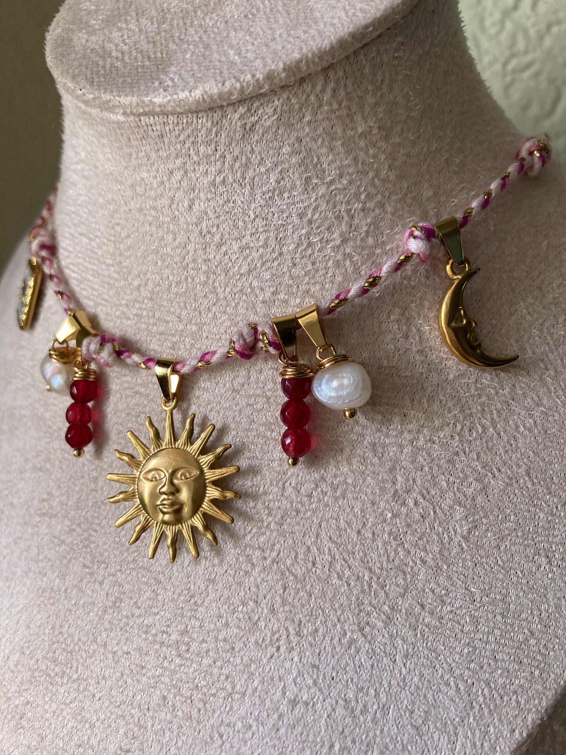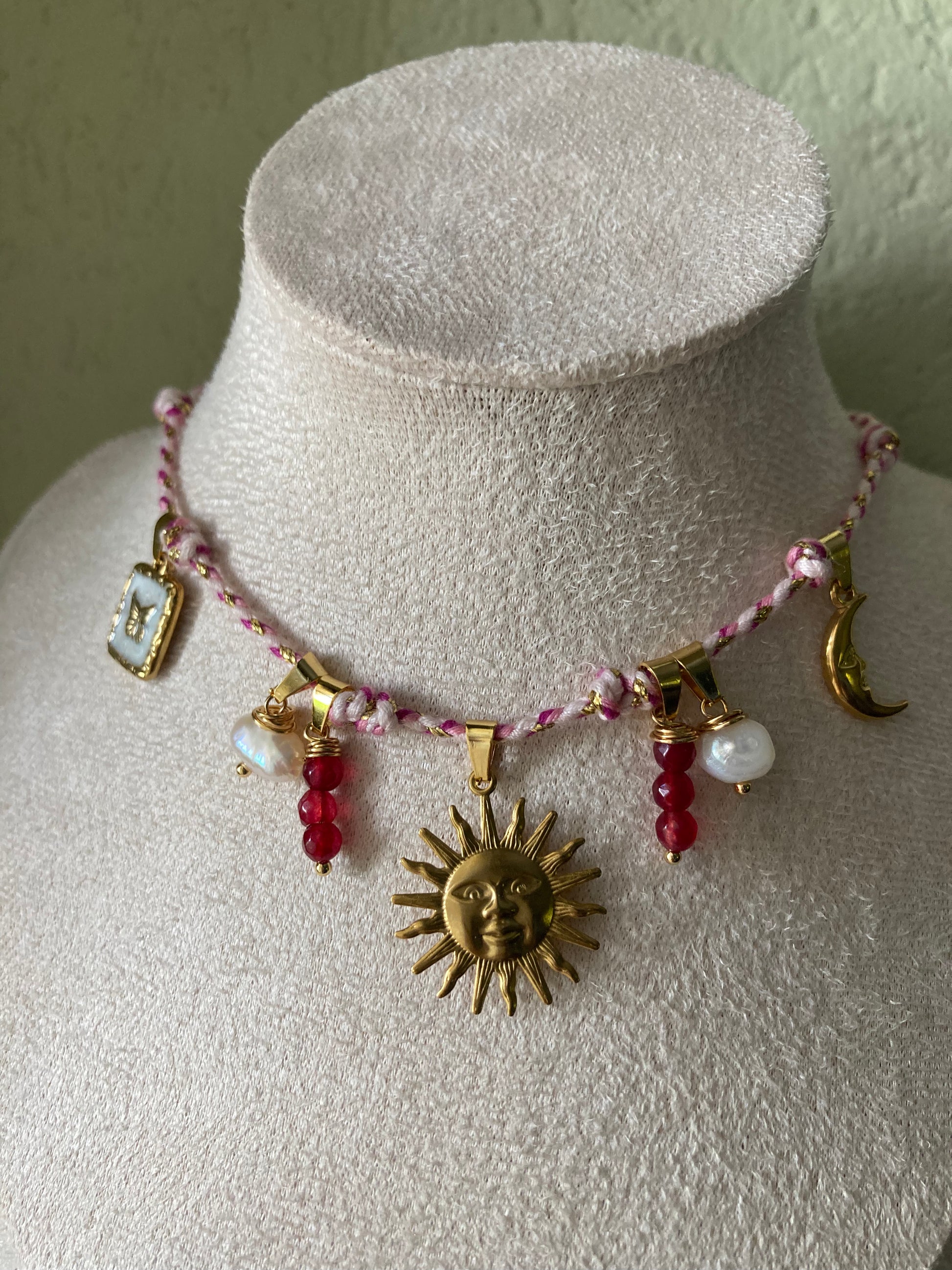 Un nuovo modello per quanto riguarda le colloanine Kora!!! Realizzato a mano con cordino in cotone sui toni del rosa mixato al lurex, cosi da renderlo molto luminoso! Insieme ai pendenti in acciaio ho abbinato anche pietre di Agata e perle di fiume! La lunghezza è sui 38/39 cm più 5 cm di allungo!