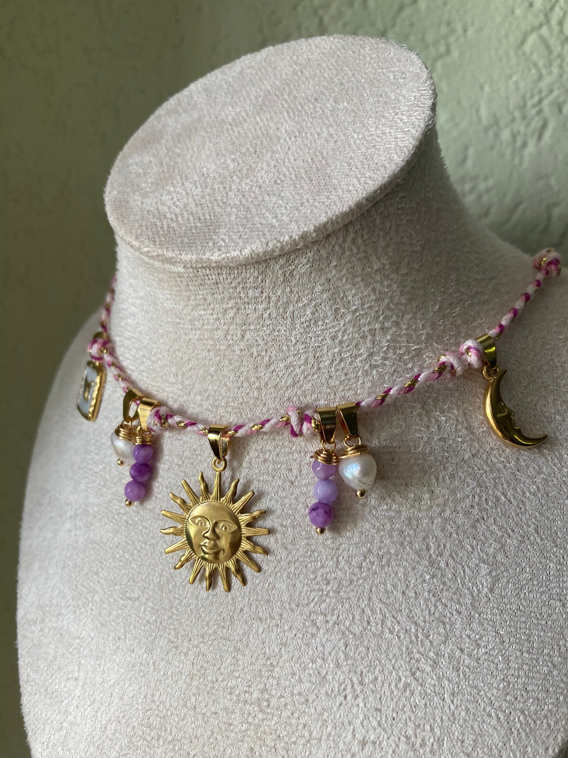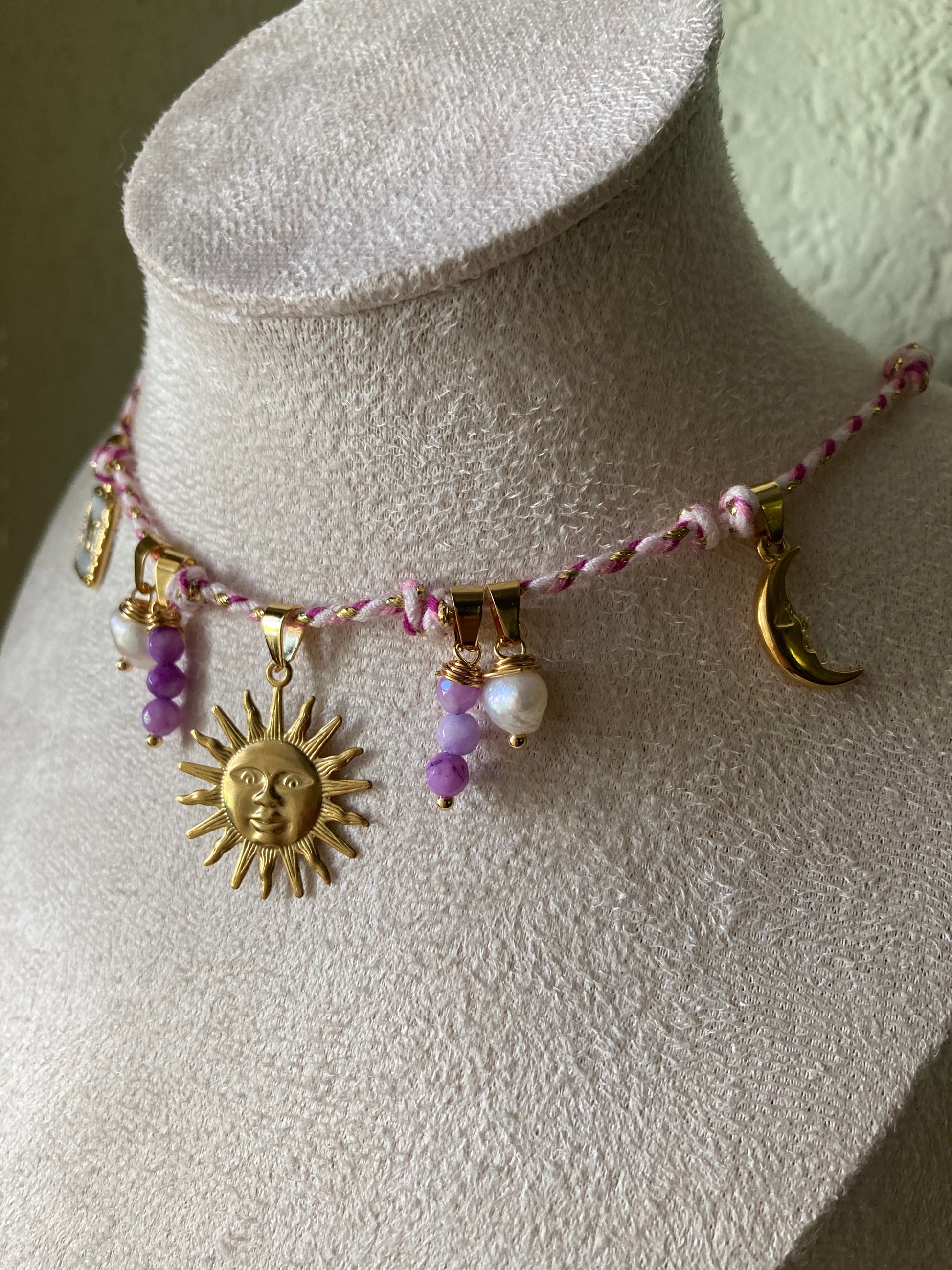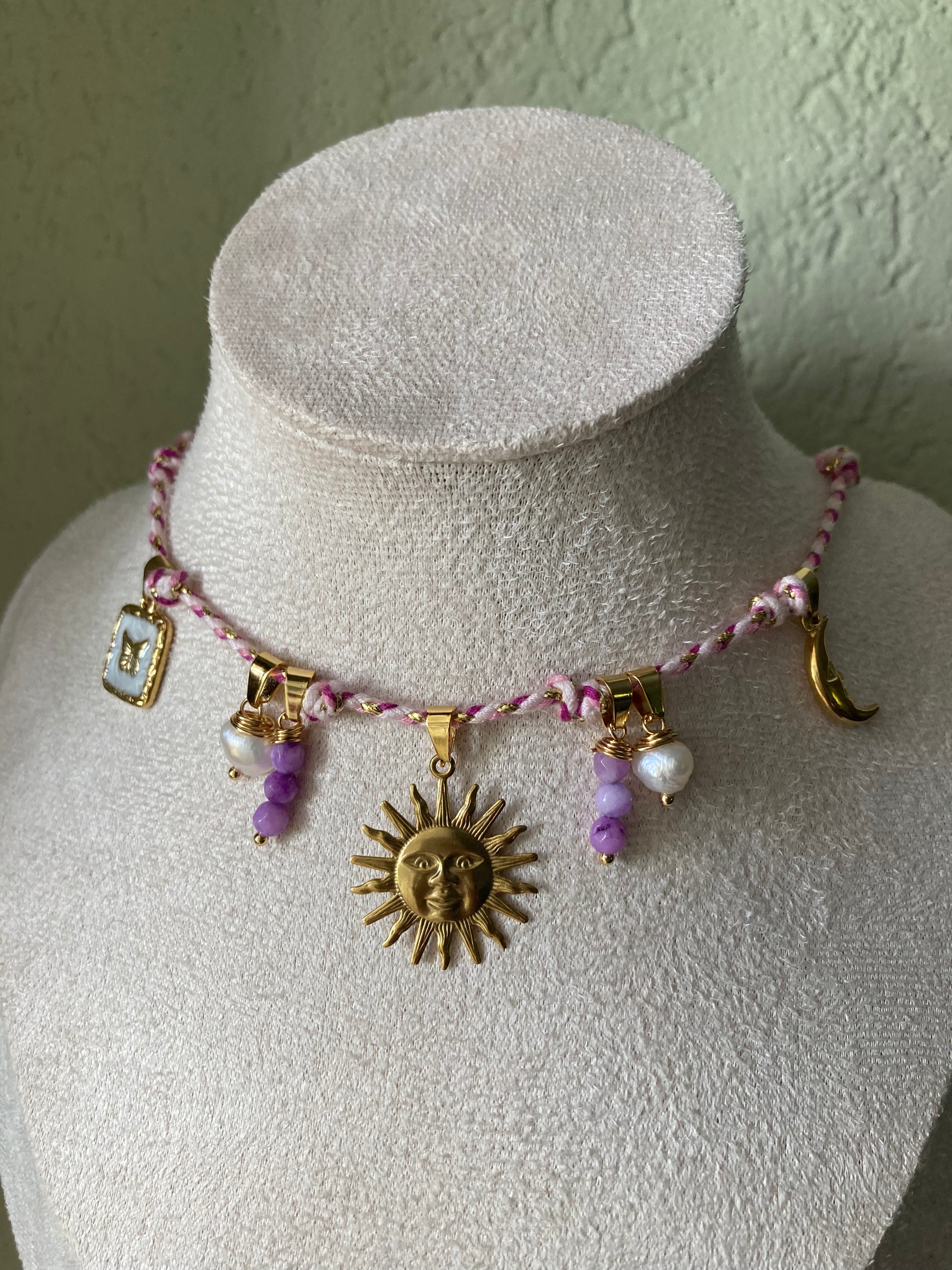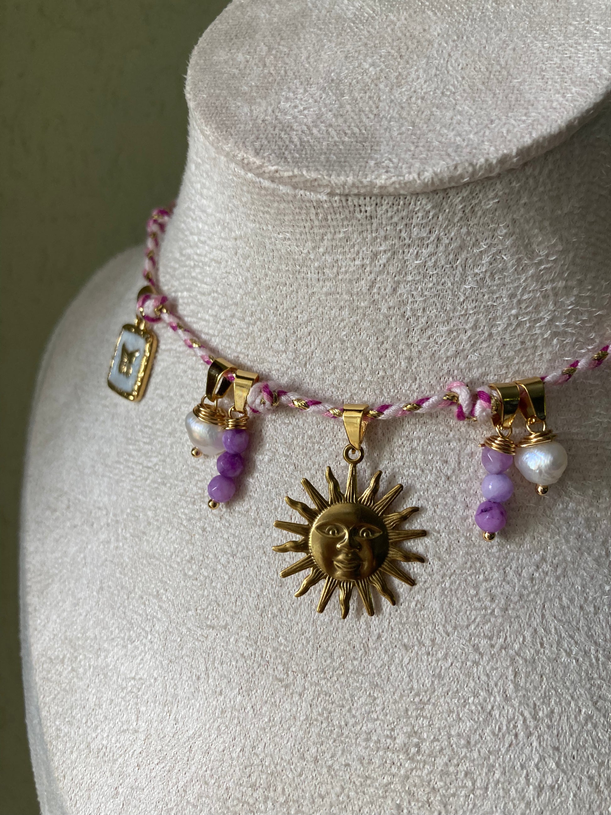 Un nuovo modello per quanto riguarda le colloanine Kora!!! Realizzato a mano con cordino in cotone sui toni del rosa mixato al lurex, cosi da renderlo molto luminoso! Insieme ai pendenti in acciaio ho abbinato anche pietre di Agata e perle di fiume! La lunghezza è sui 38/39 cm più 5 cm di allungo!