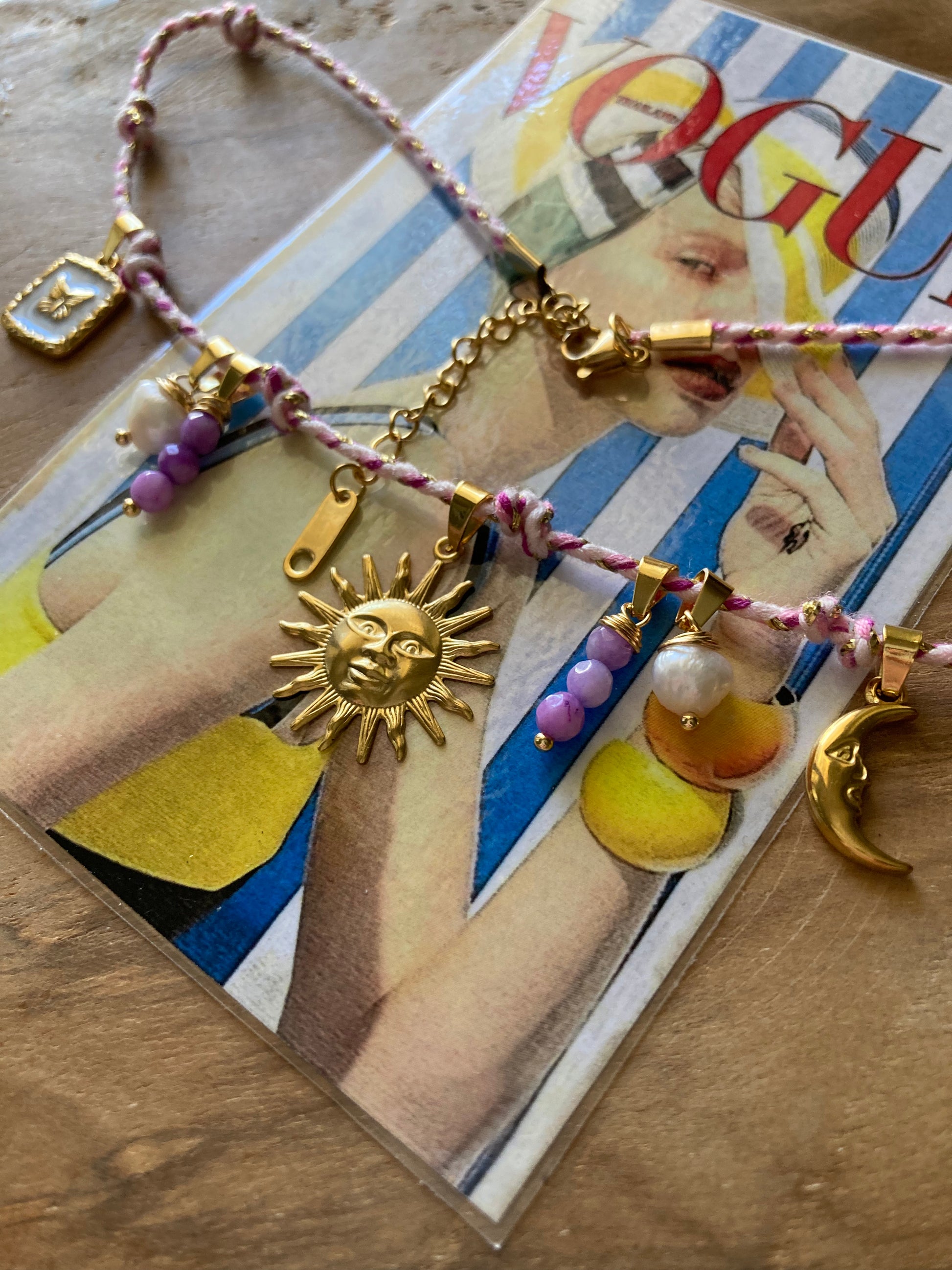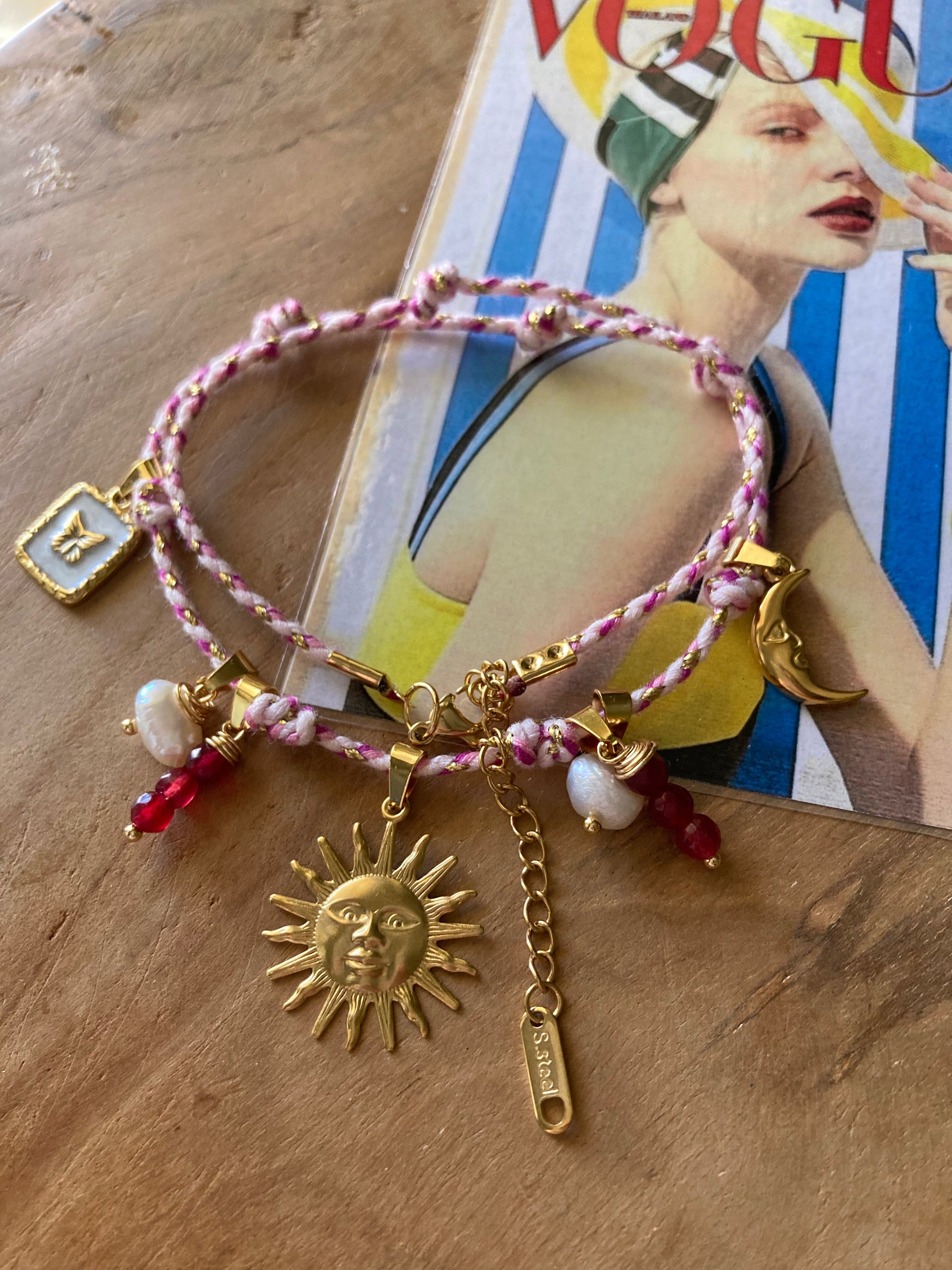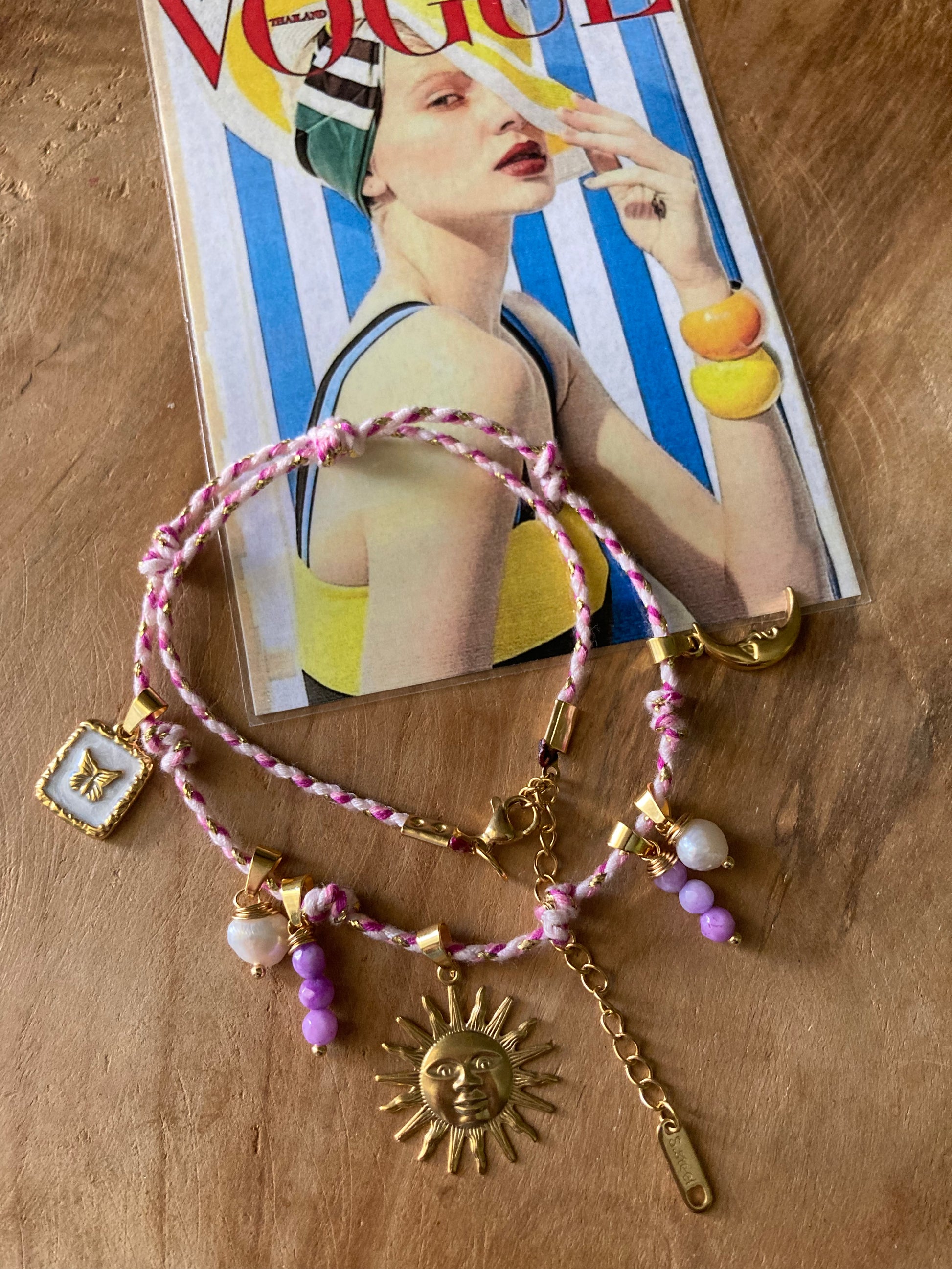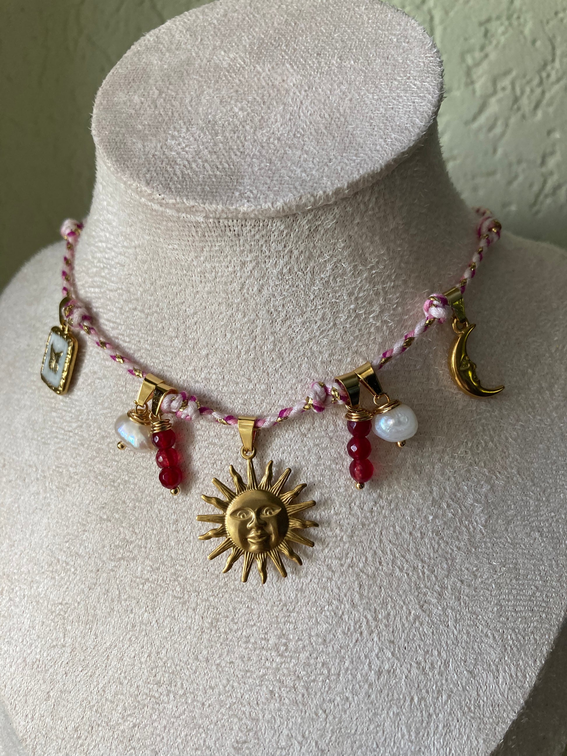 Un nuovo modello per quanto riguarda le colloanine Kora!!! Realizzato a mano con cordino in cotone sui toni del rosa mixato al lurex, cosi da renderlo molto luminoso! Insieme ai pendenti in acciaio ho abbinato anche pietre di Agata e perle di fiume! La lunghezza è sui 38/39 cm più 5 cm di allungo!