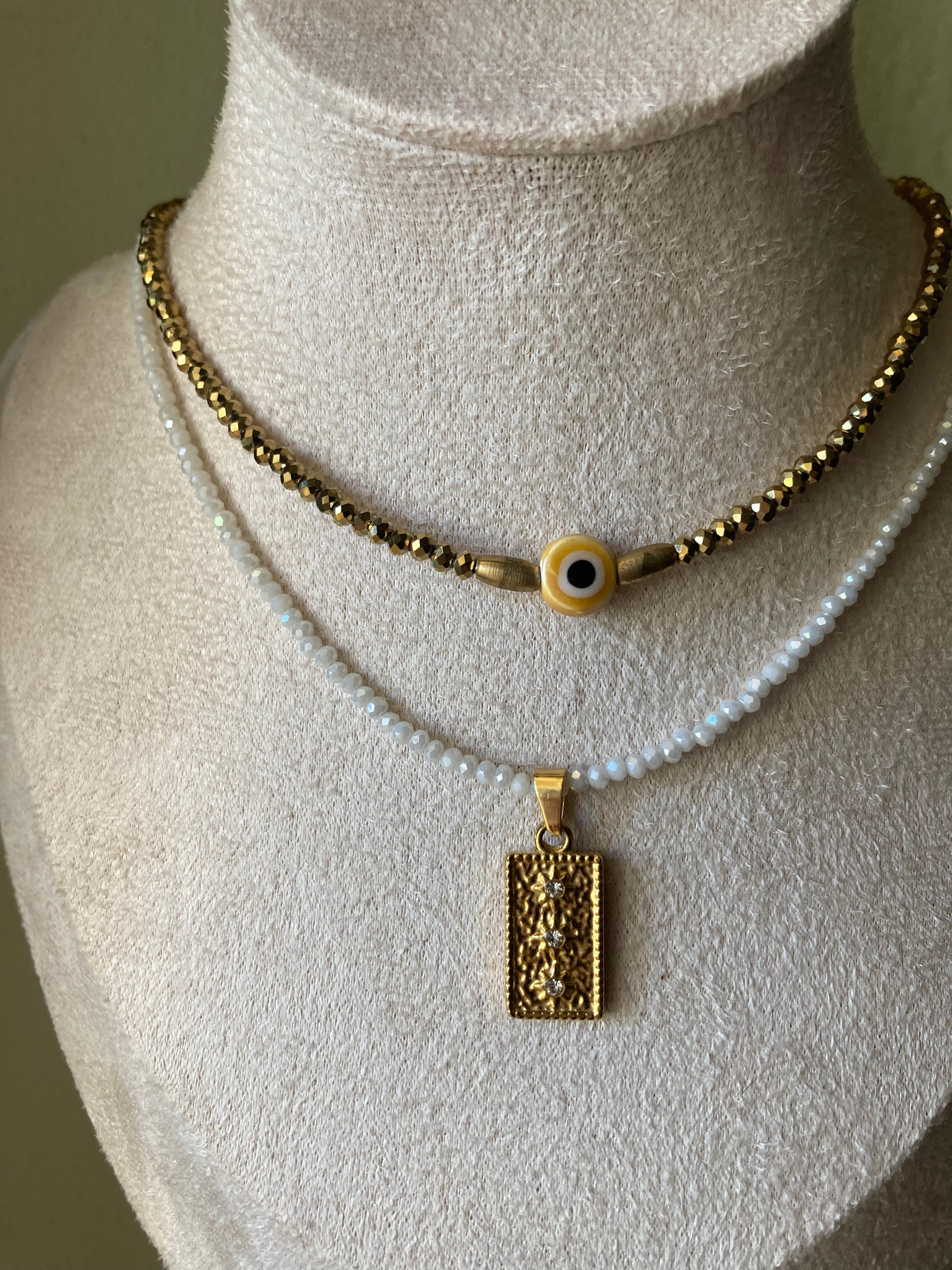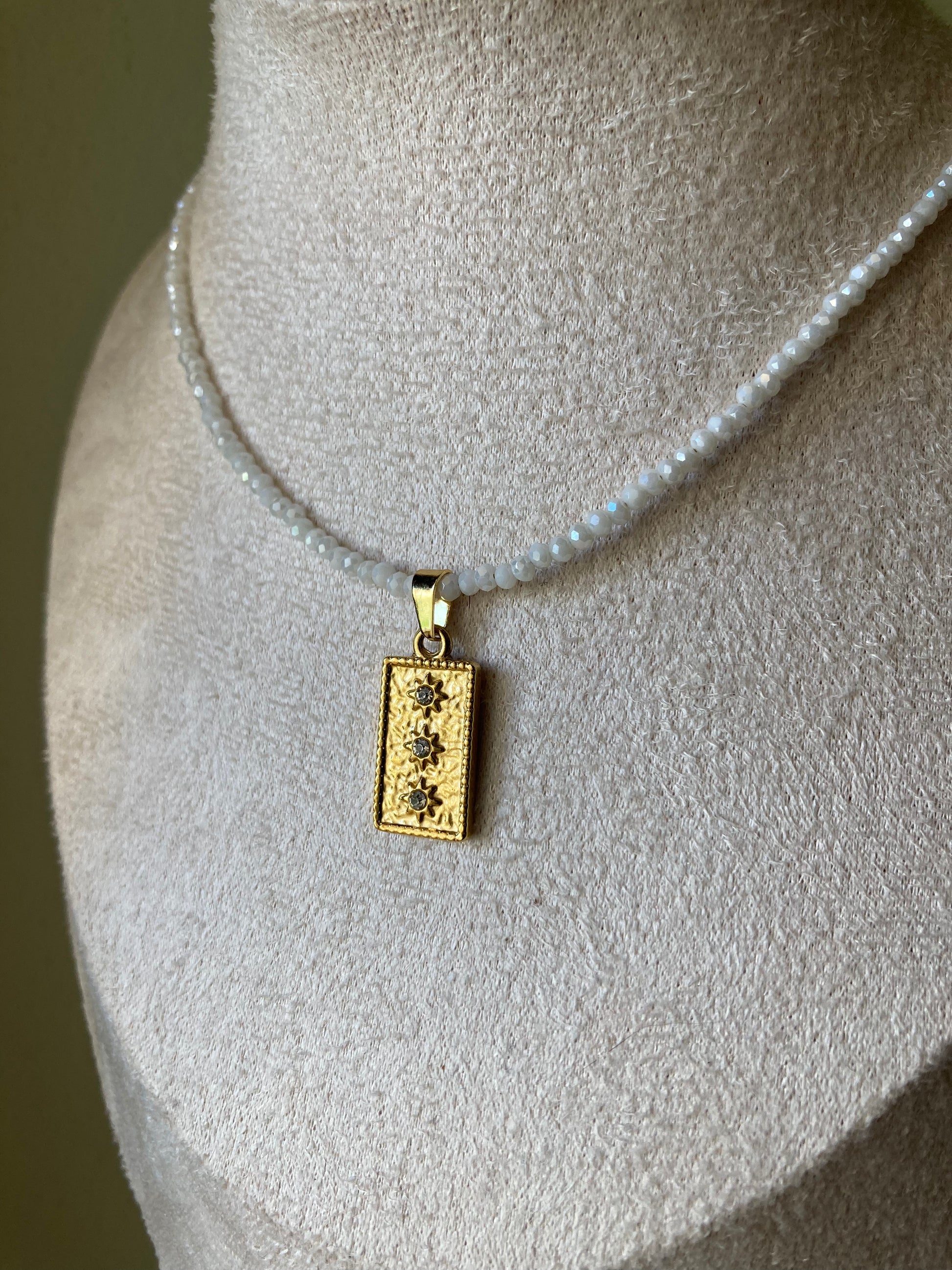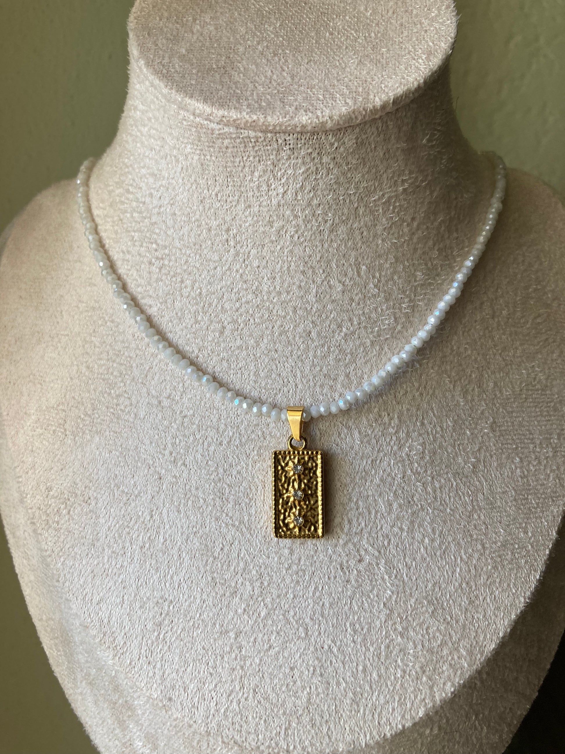 Girocollo realizzato a mano con cristallini 2mm bianchi e pendente medaglietta 3 punti luce in acciaio ( non cambia colore)