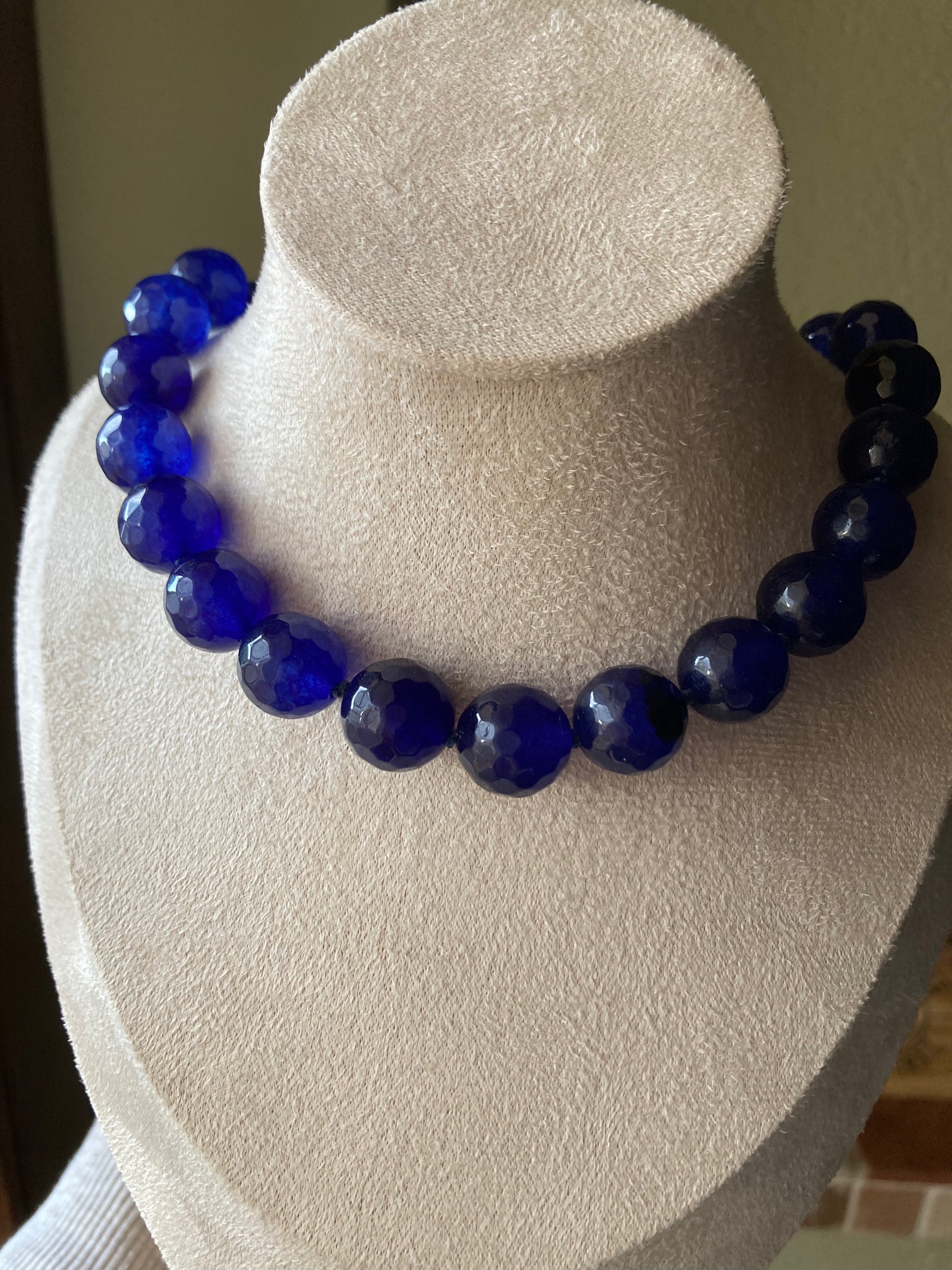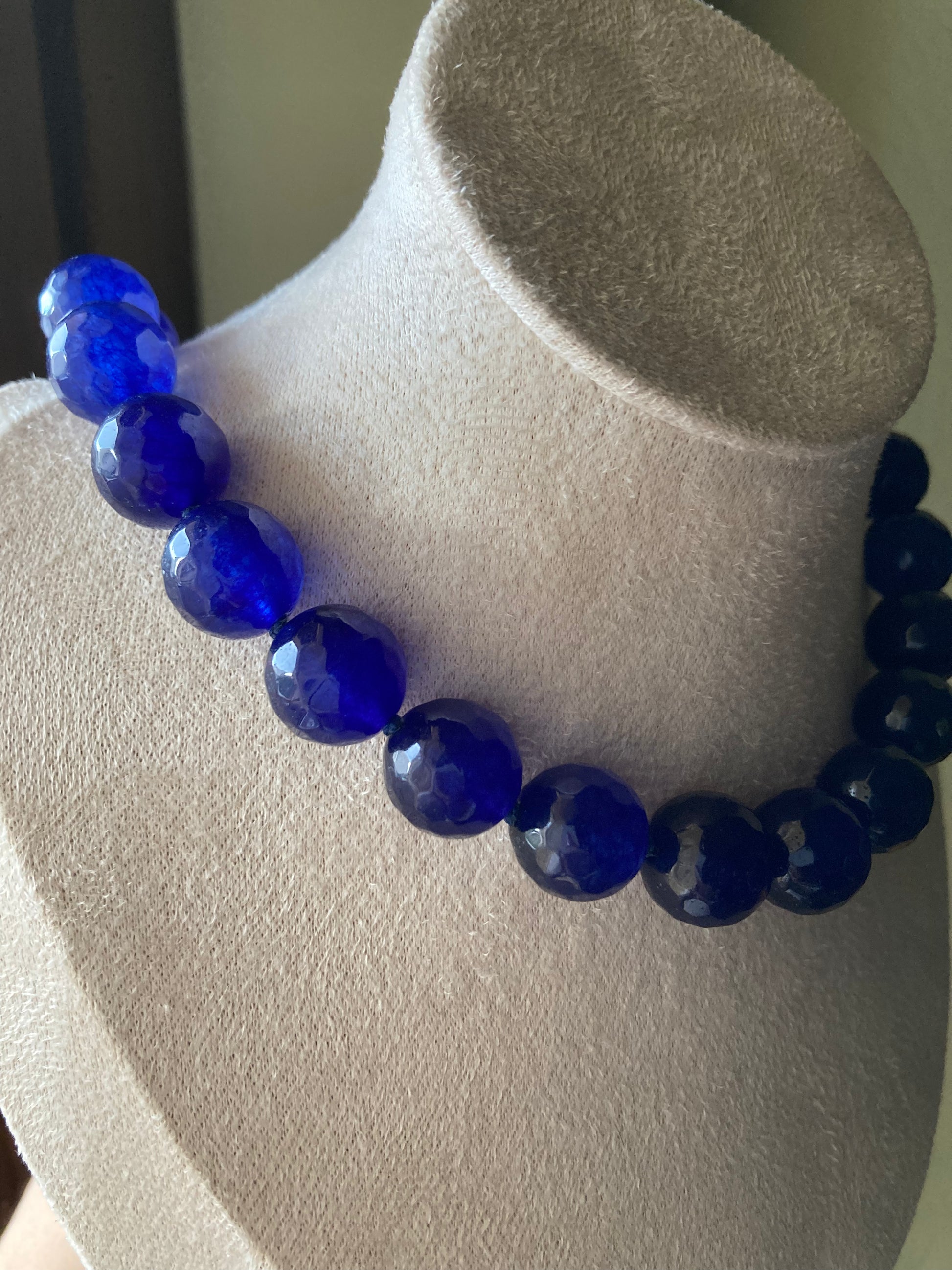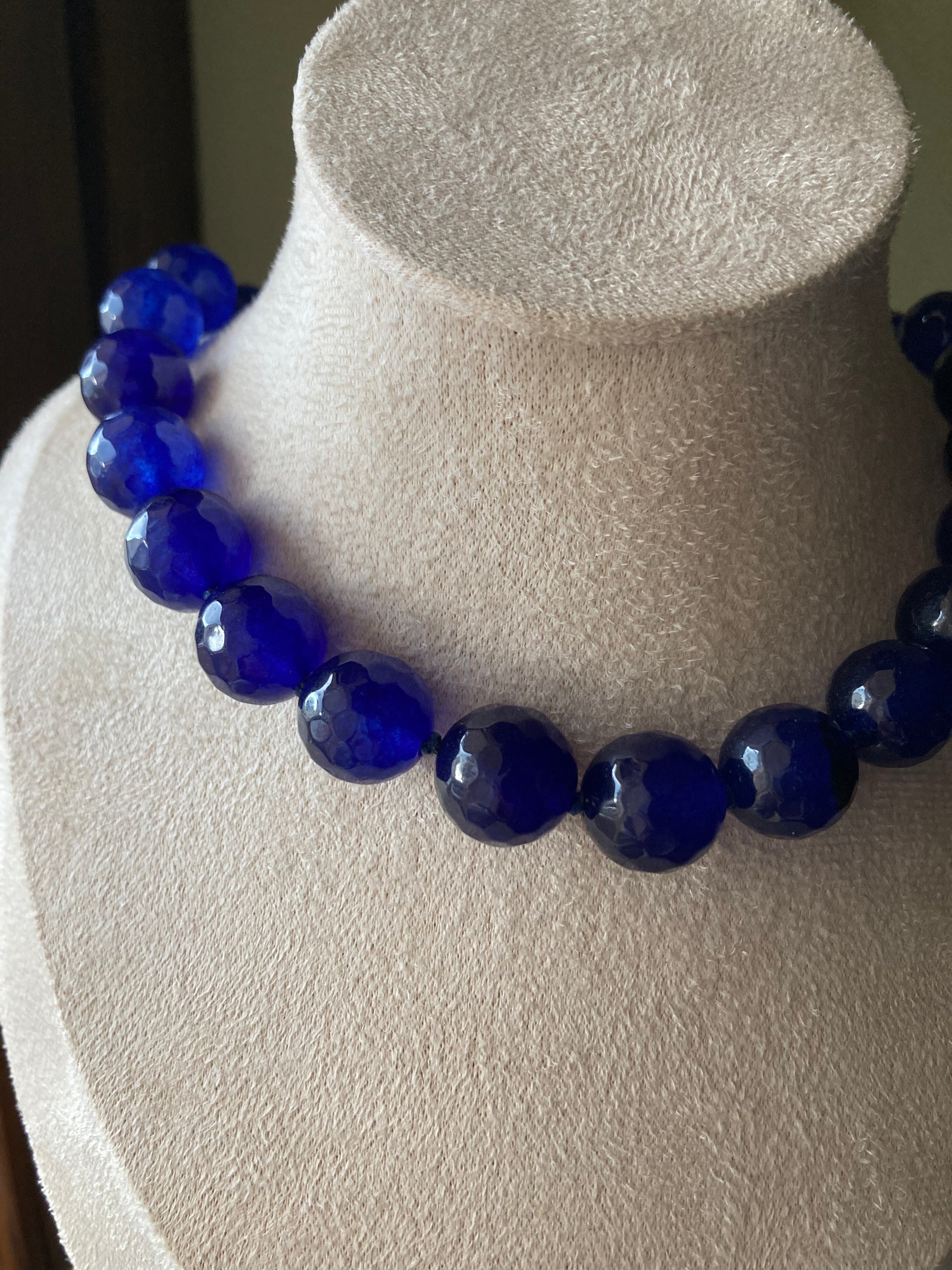 Un pezzo unico strepitoso realizzato a mano con pietre di Giada Blu, filo blu per realizzare i nodi che tengono insieme queste pietre meravigliose, per una lunghezza di 45cm