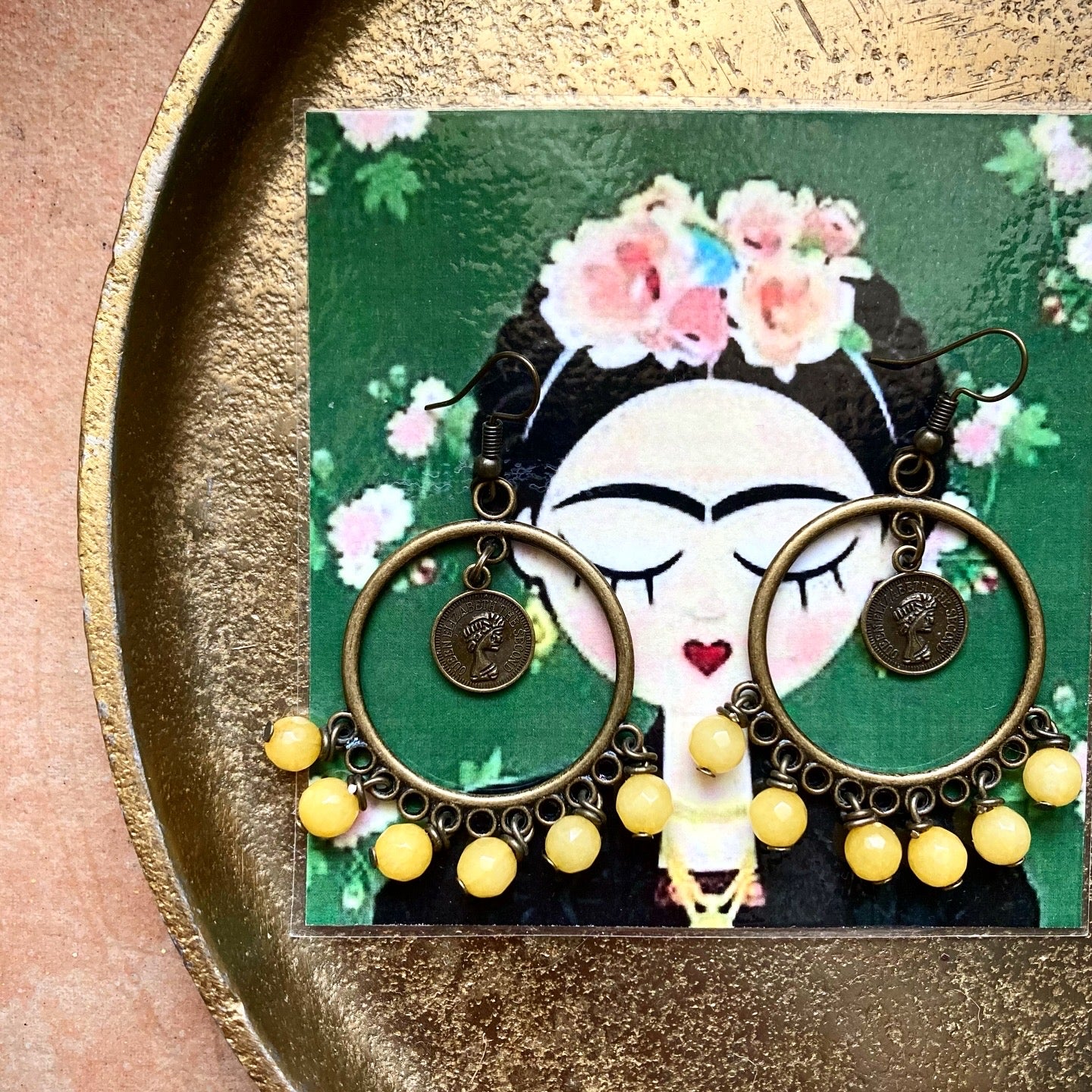 Orecchini realizzati a mano con pendente color bronzo e pietre di giada gialla