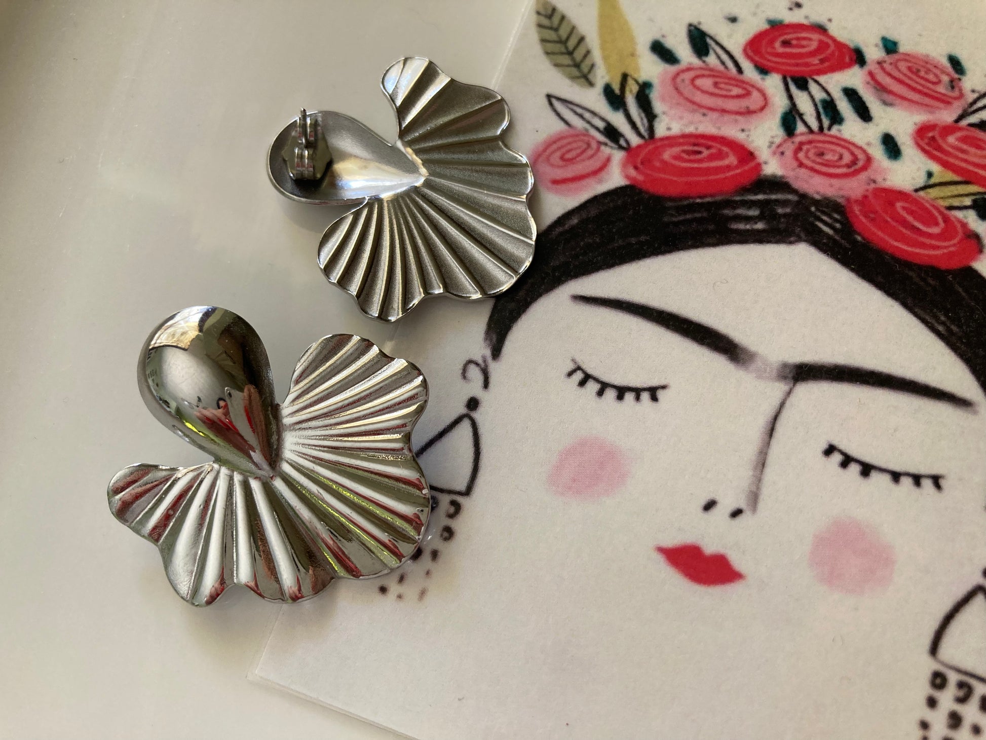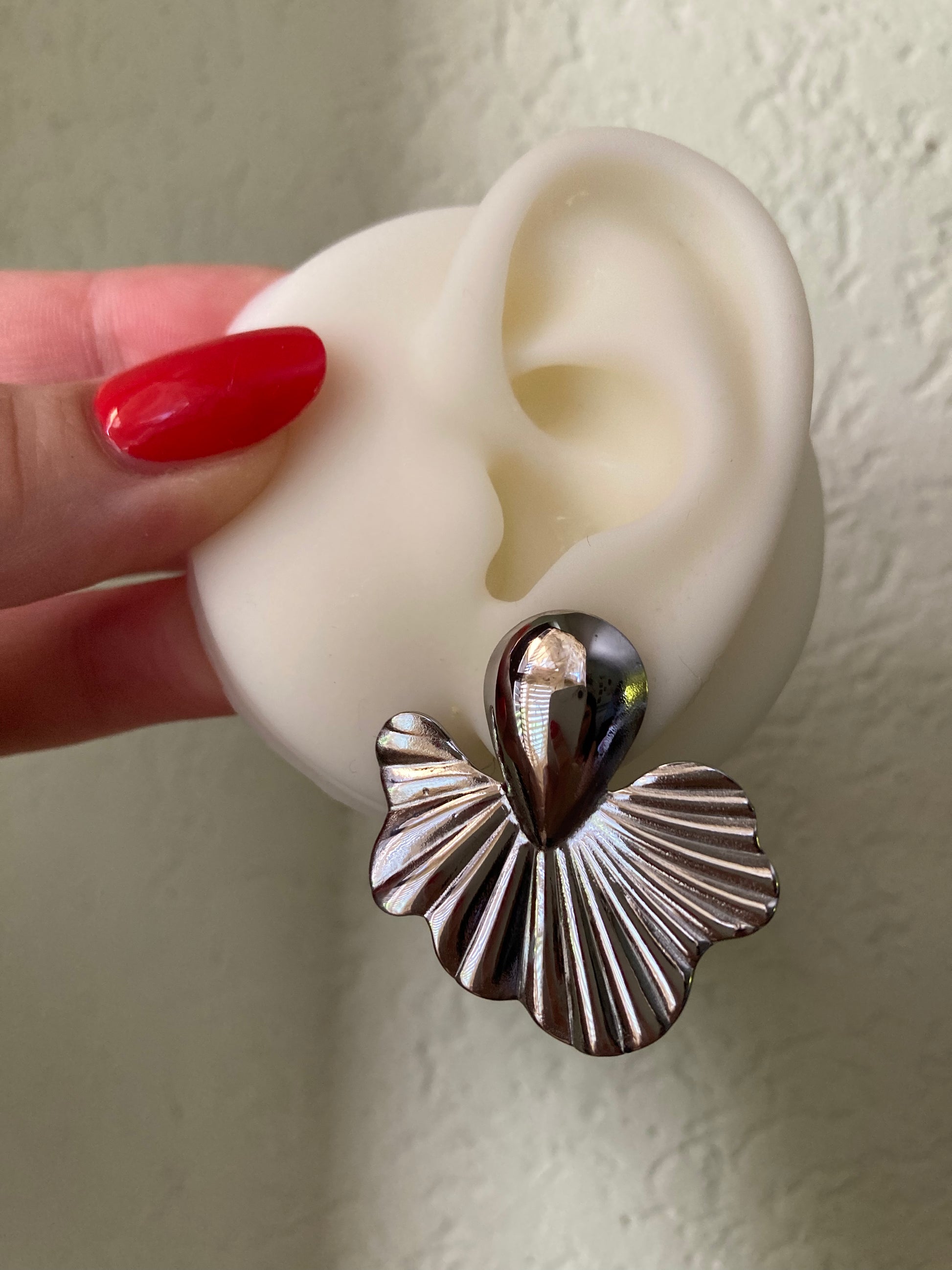 Disponibili solo nella versione argento, questo modello realizzato in acciaio con questa forma che ricorda molto il fiore di loto...sono orecchini ultra leggeri, taglio laser, molto partcolari, che si portano benissimo per tutto il giorno!