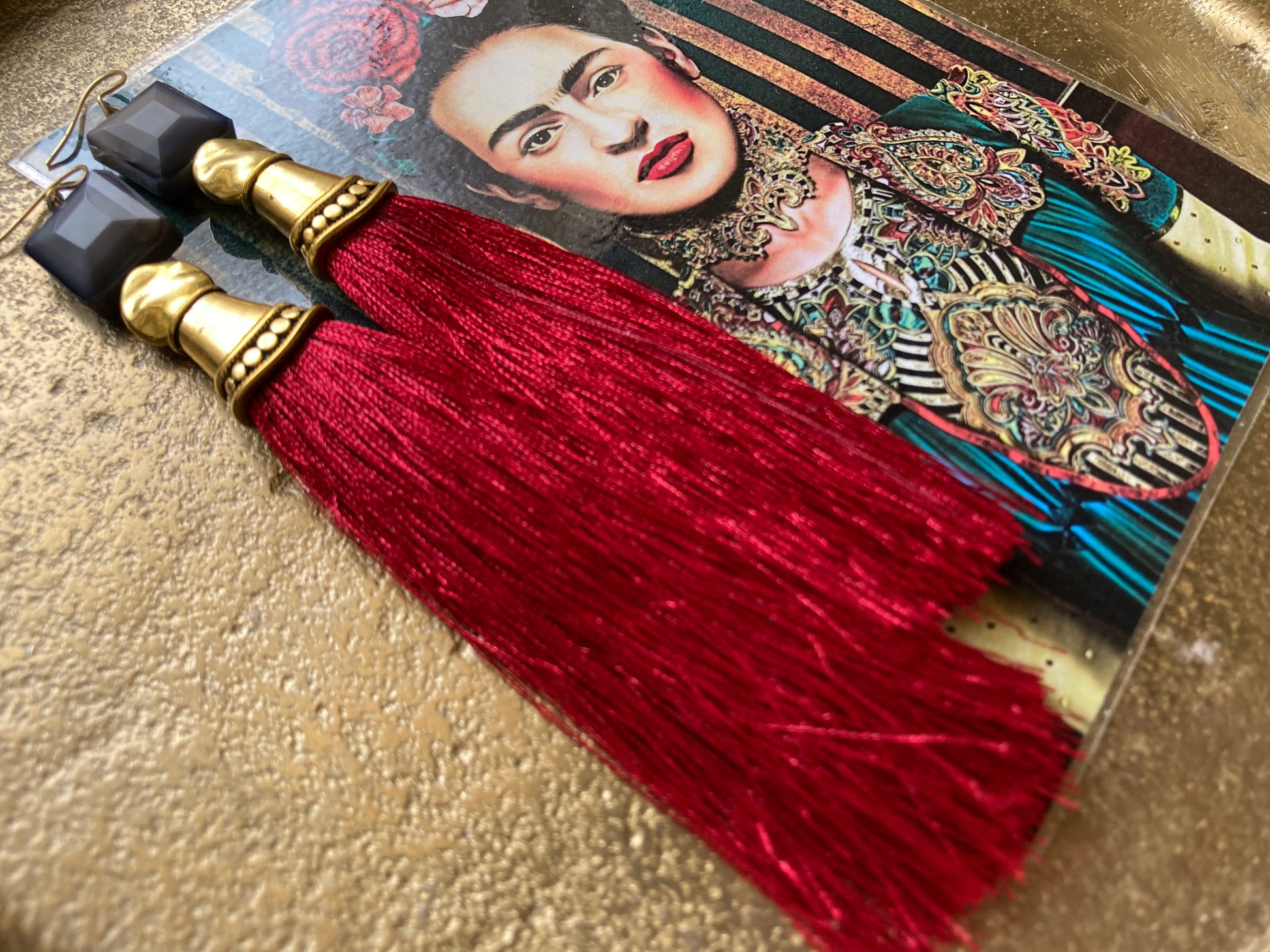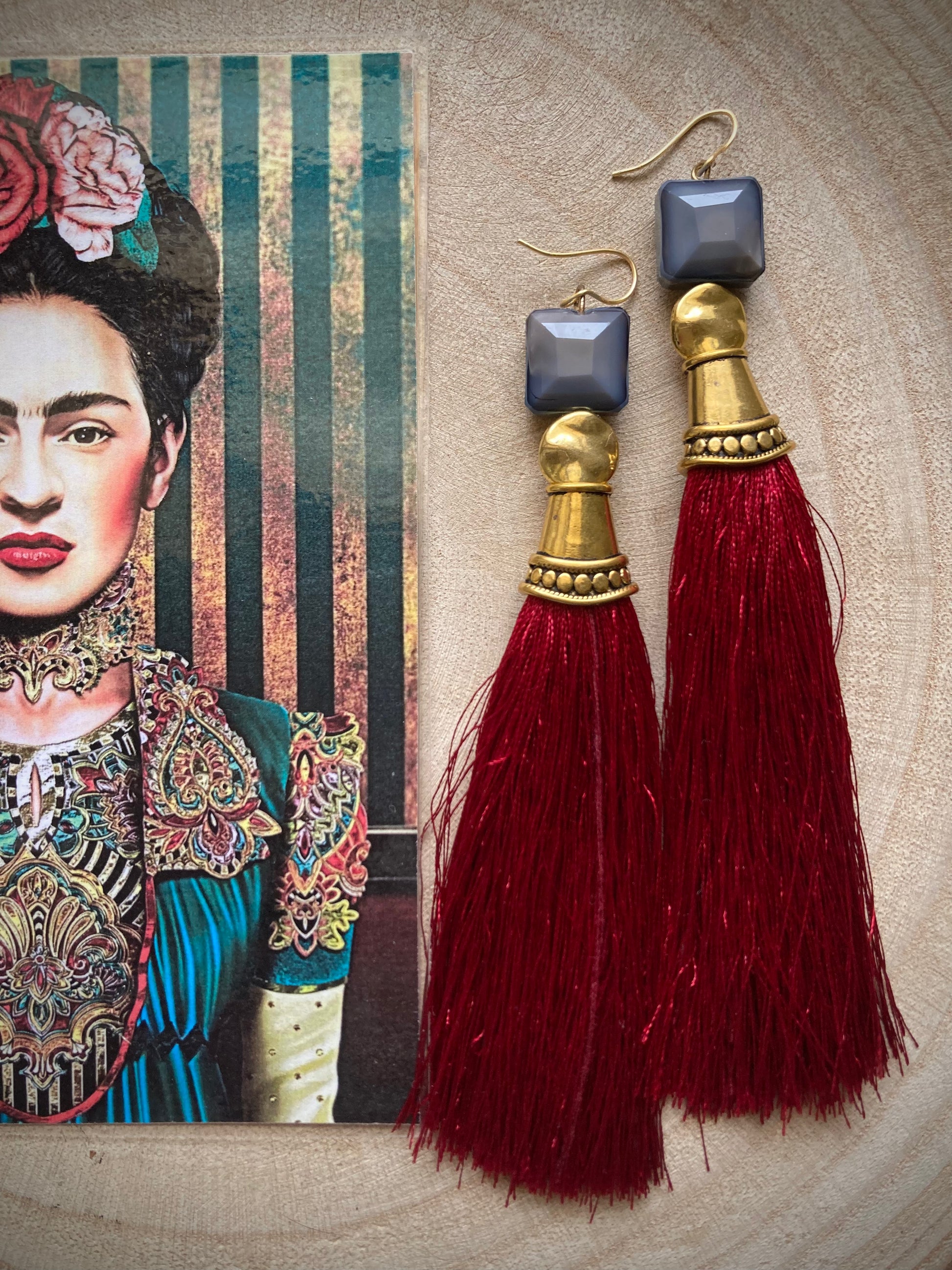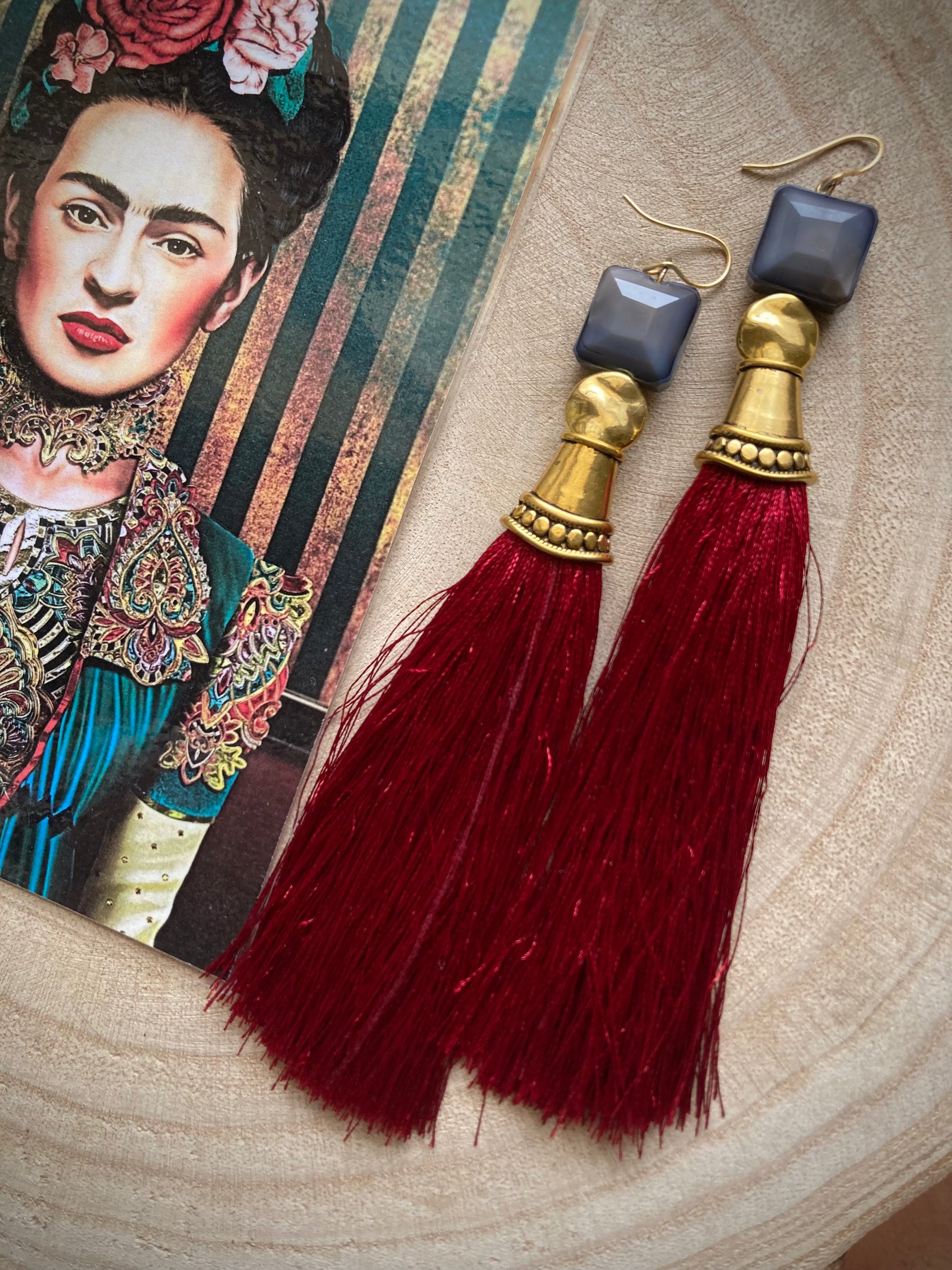 Un modello unico, molto particolare, per un look dove la parola d'ordine è OSARE!!! Nappe rosso bordeaux, cristalli grigii e metallo dorato....danno vita a questi orecchini lunghi 12cm, originali e pieni di stile!!