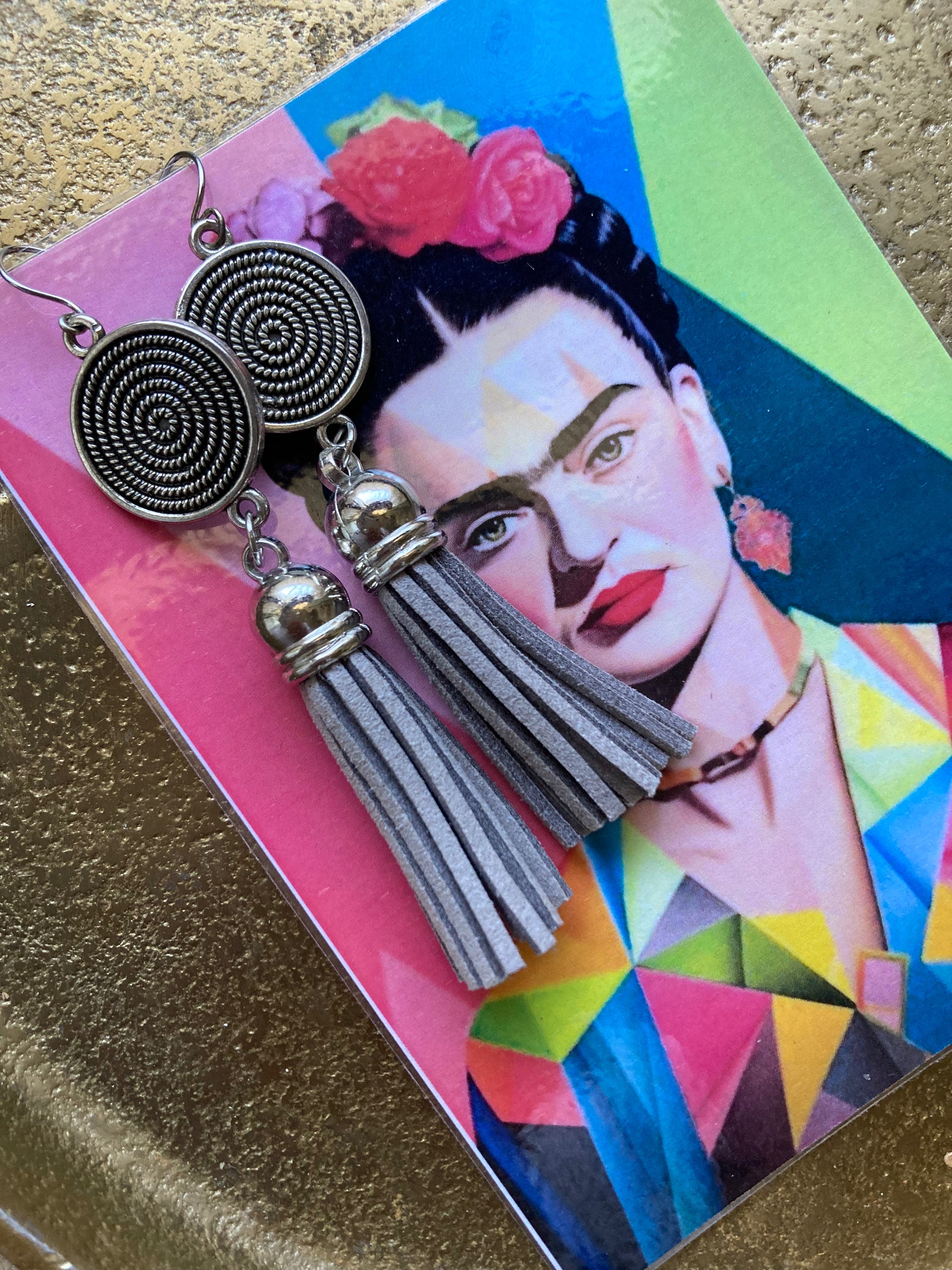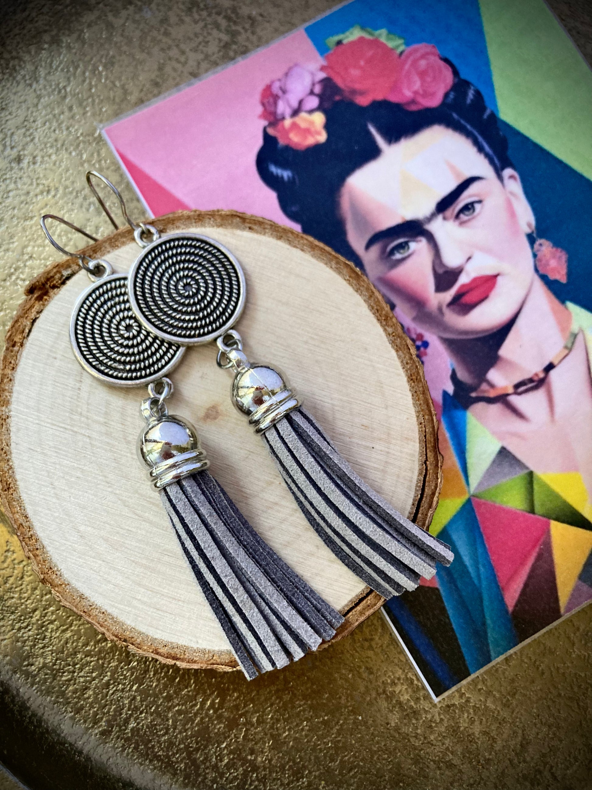 Le meravigliose girelle argentate abbinate alle nappe in alcantara creano un accessorio originale, super leggero da indossare, per look ultra stilosi!!! Le girelle sono in ottone rodiato color argento. Le monachelle (orecchini) sono in acciaio, anallergiche. La lunghezza degli orecchini è di 8cm