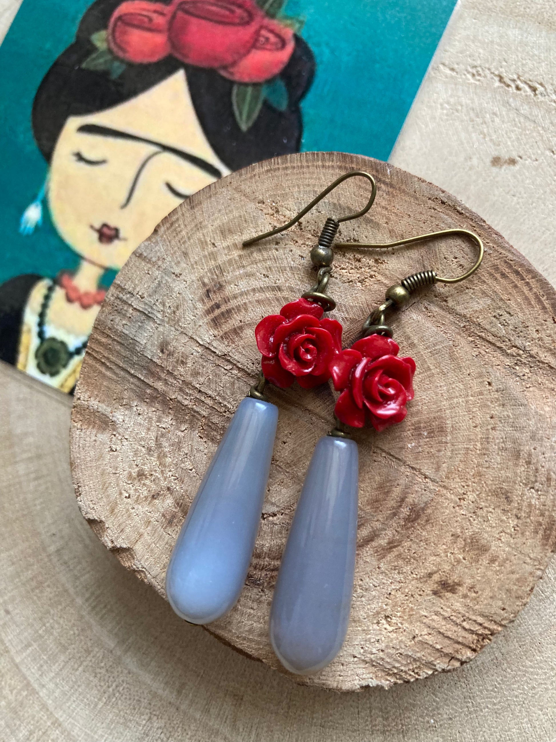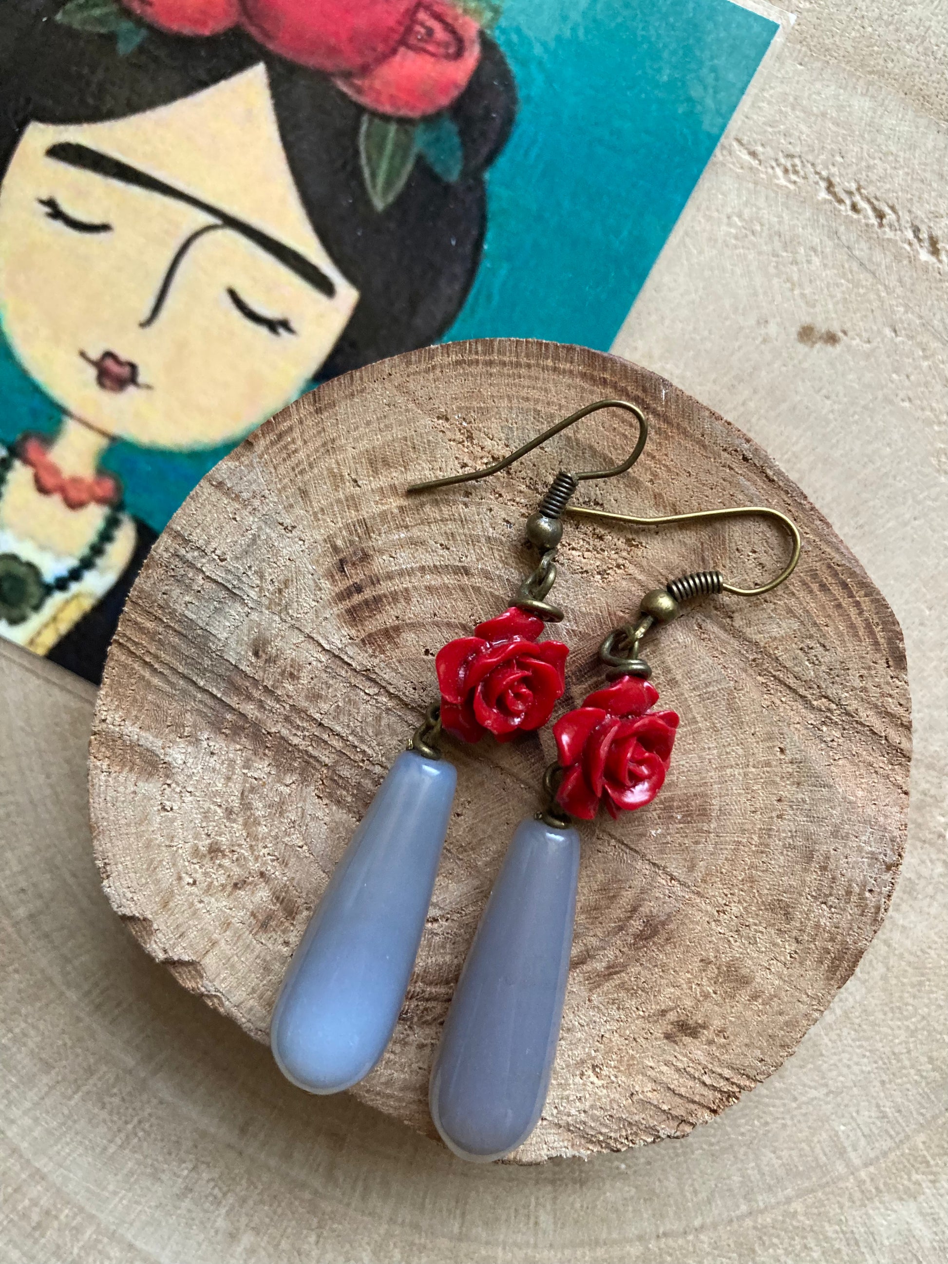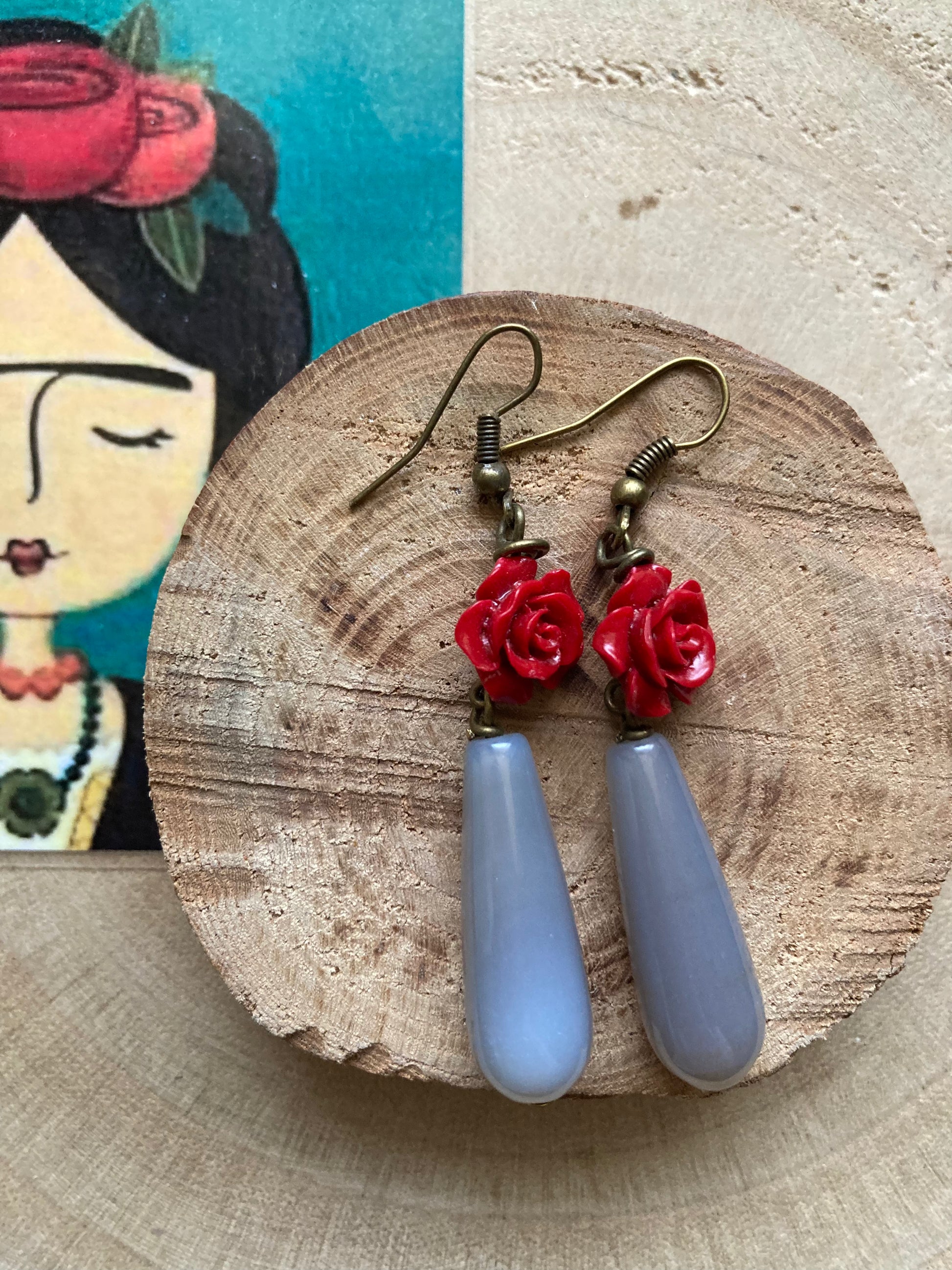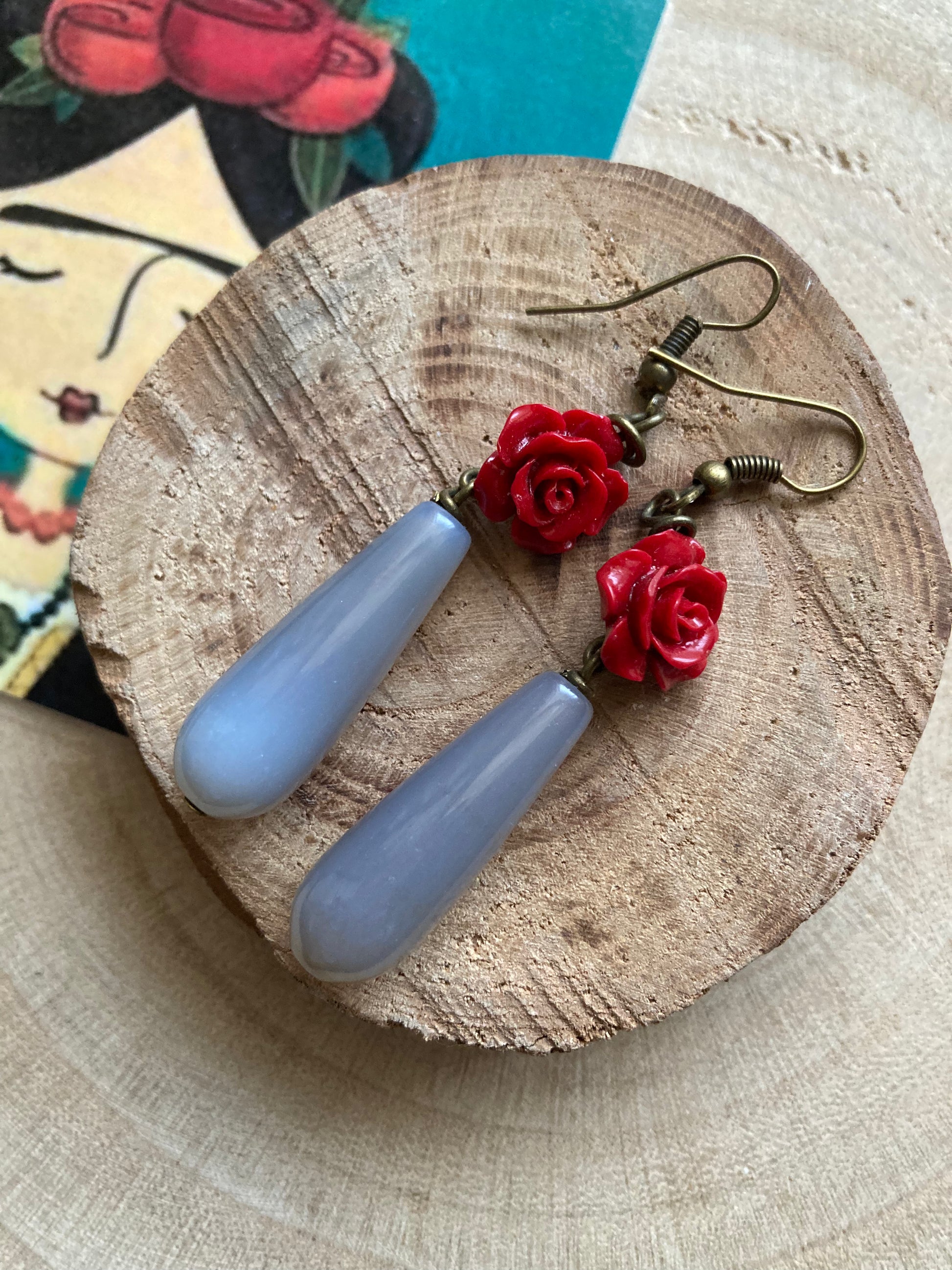 Le gocce di Agata grigia sono le protagoniste indiscusse di questi orecchini, lunghi 6,2cm, fighissimi!!!! Gli orecchini sono realizzati a mano! Il tocco di colore è dato dalle roselline in resina rosse!