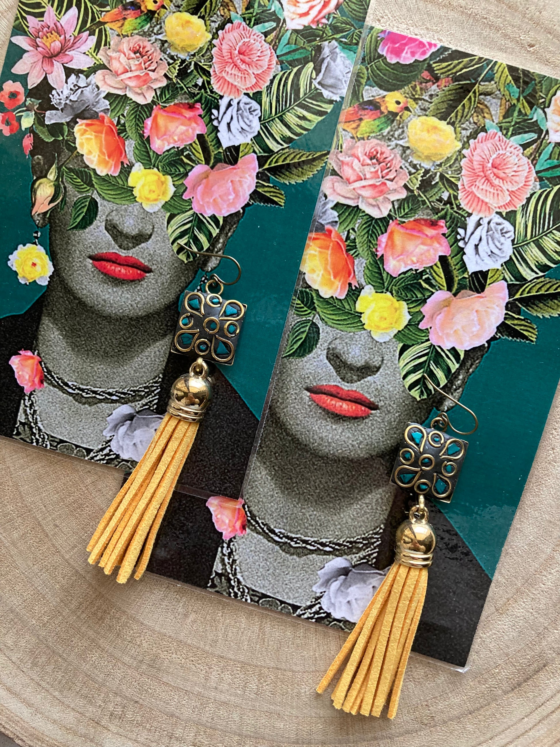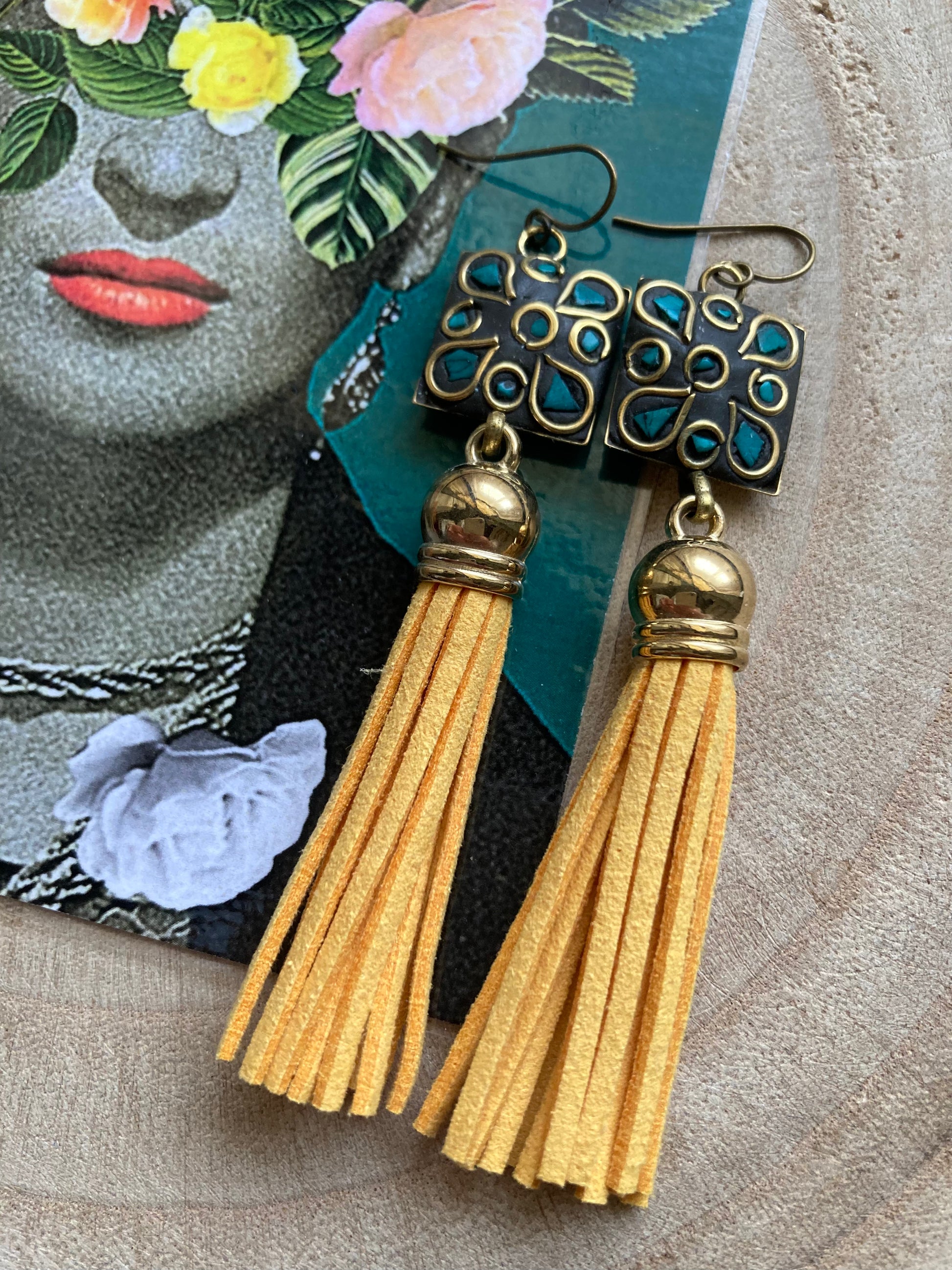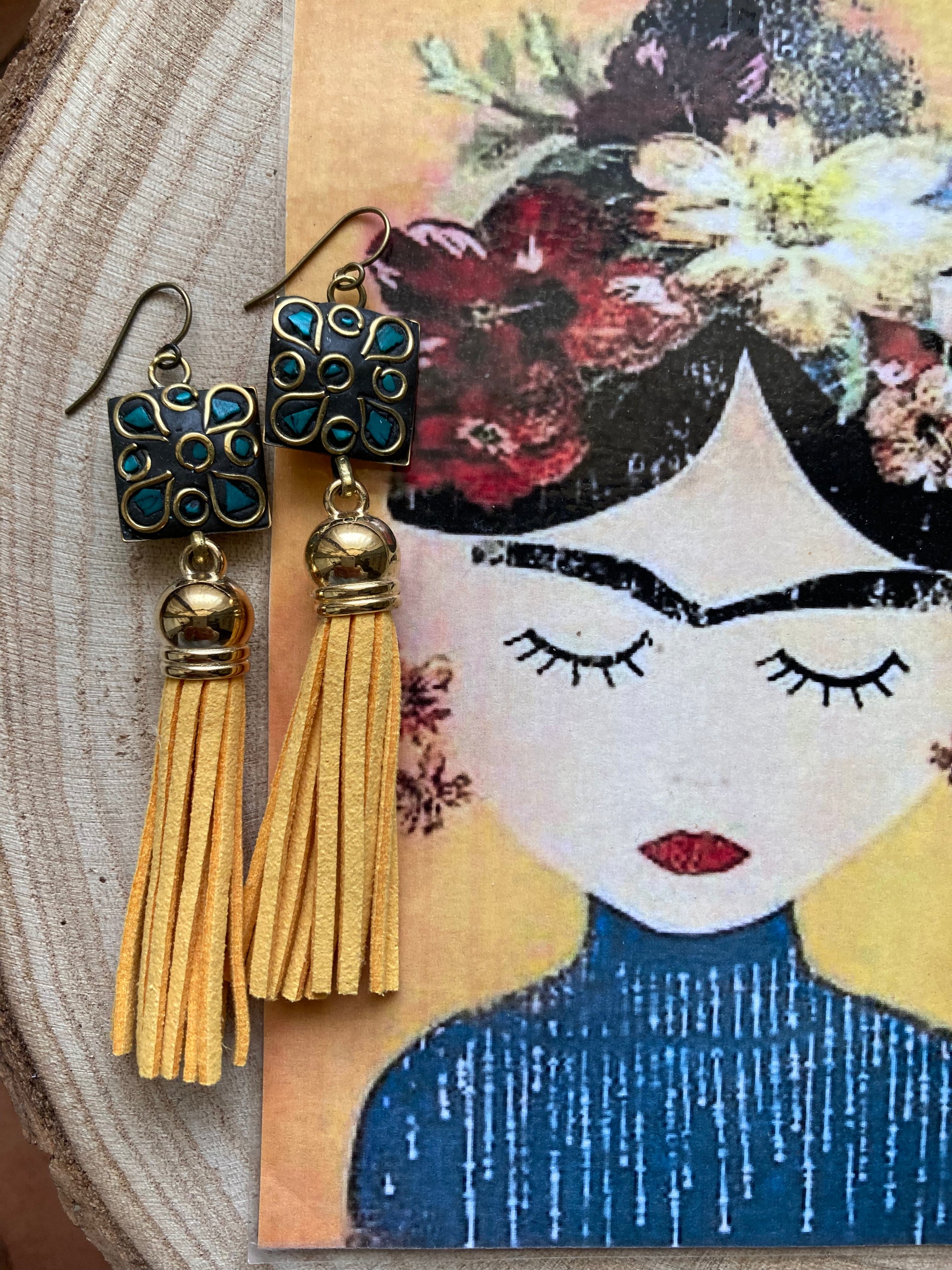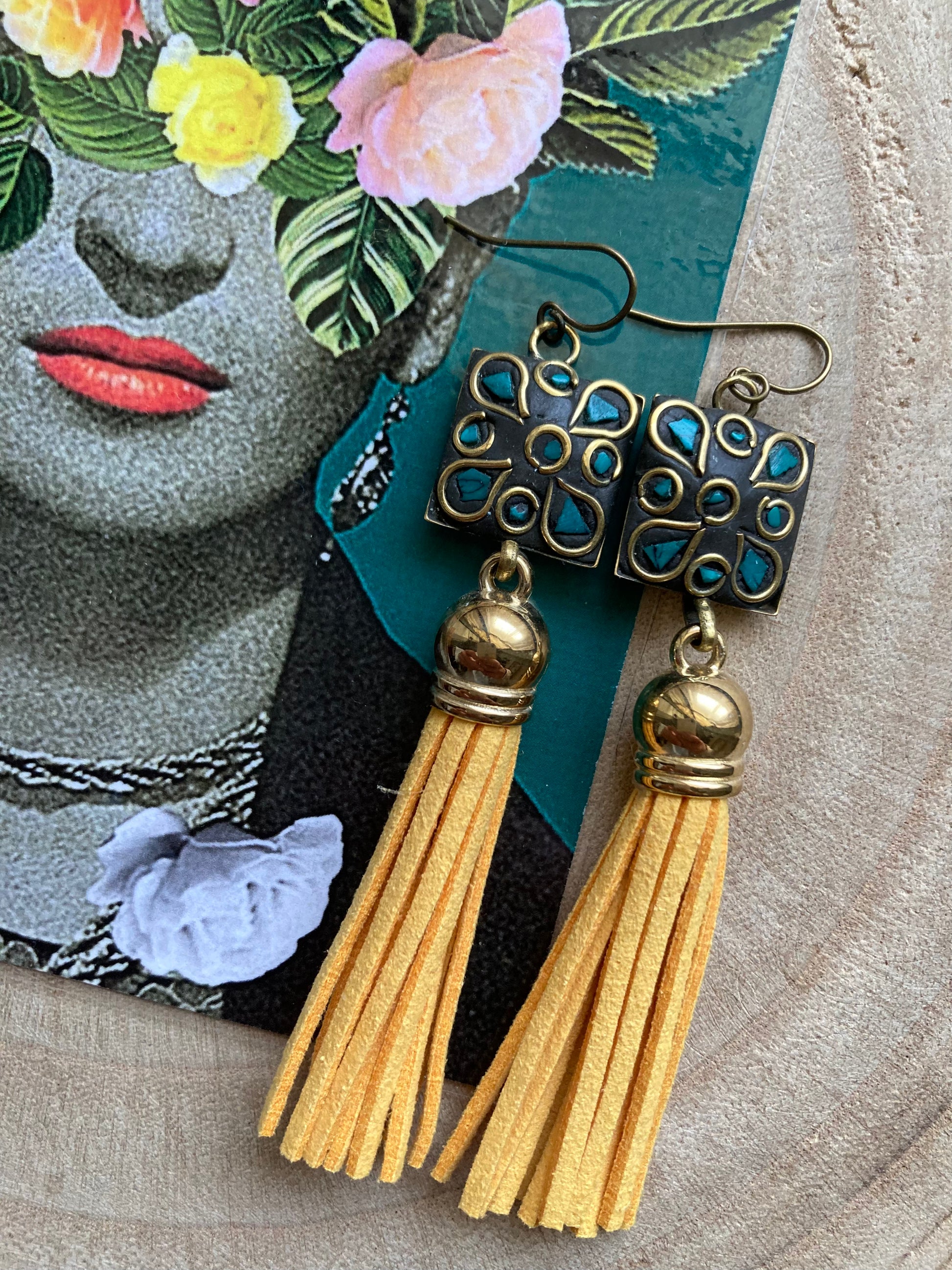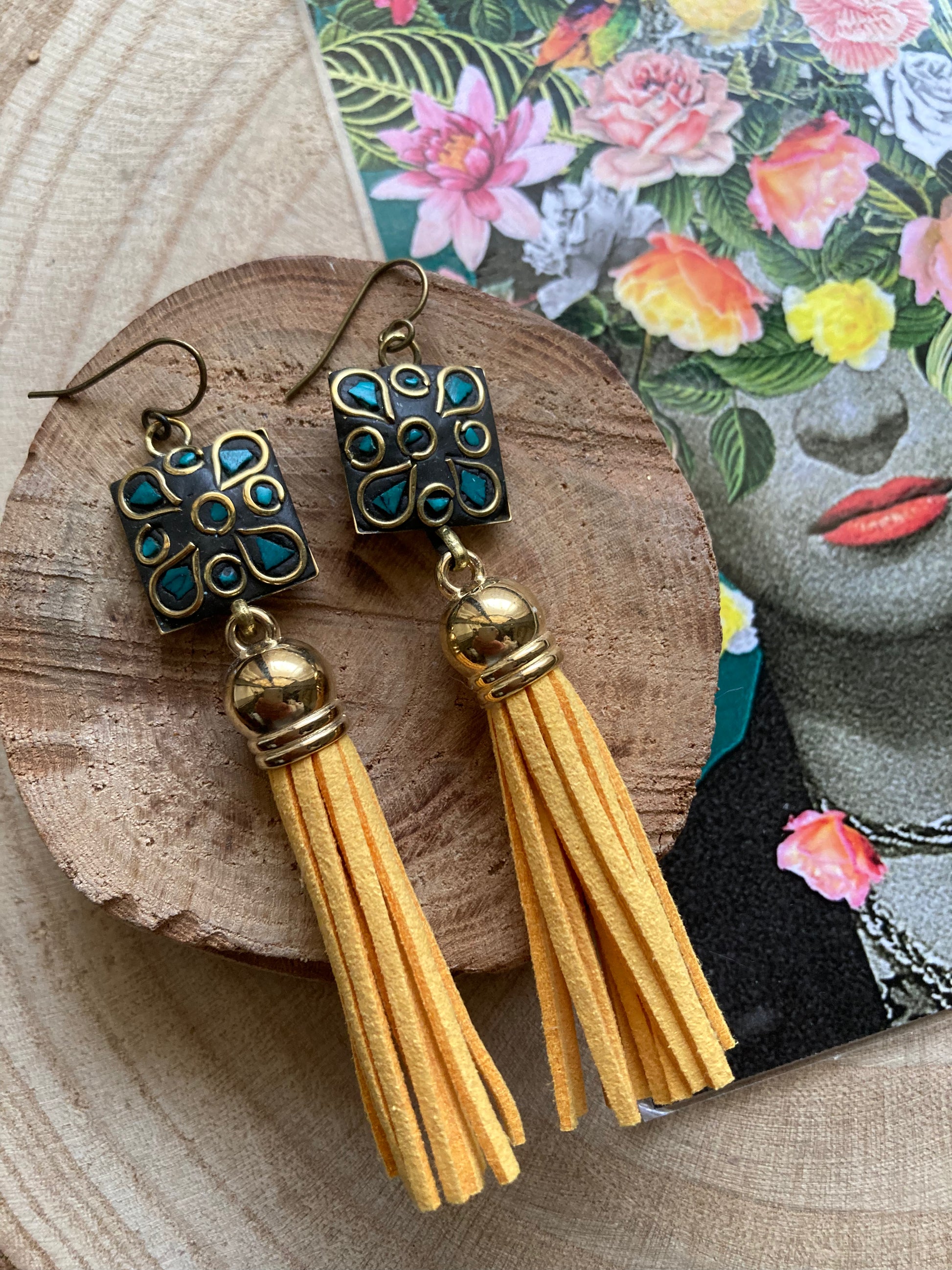 I pendenti indiani realizzati a mosaico turchese e le nappine in alcantara giallo ocra.. creano un abbinamento unico dal sapore orientaleggiante e ti permettono di indossare un accessorio ricercato, colorato e non scontanto!! Leggerissimi; donano un tocco di colore a tutti i tuoi look!!!! Lunghezza 8,5cm