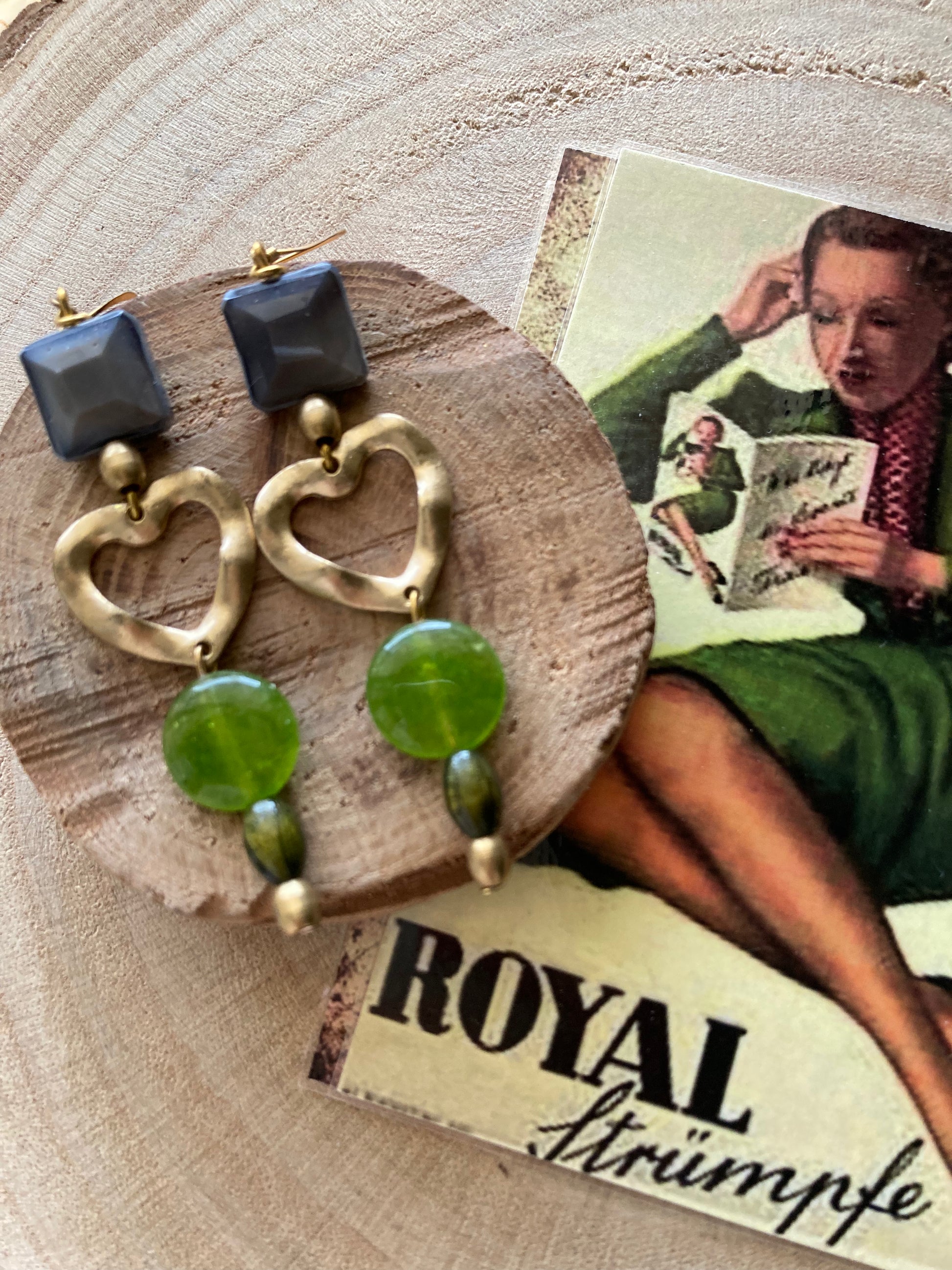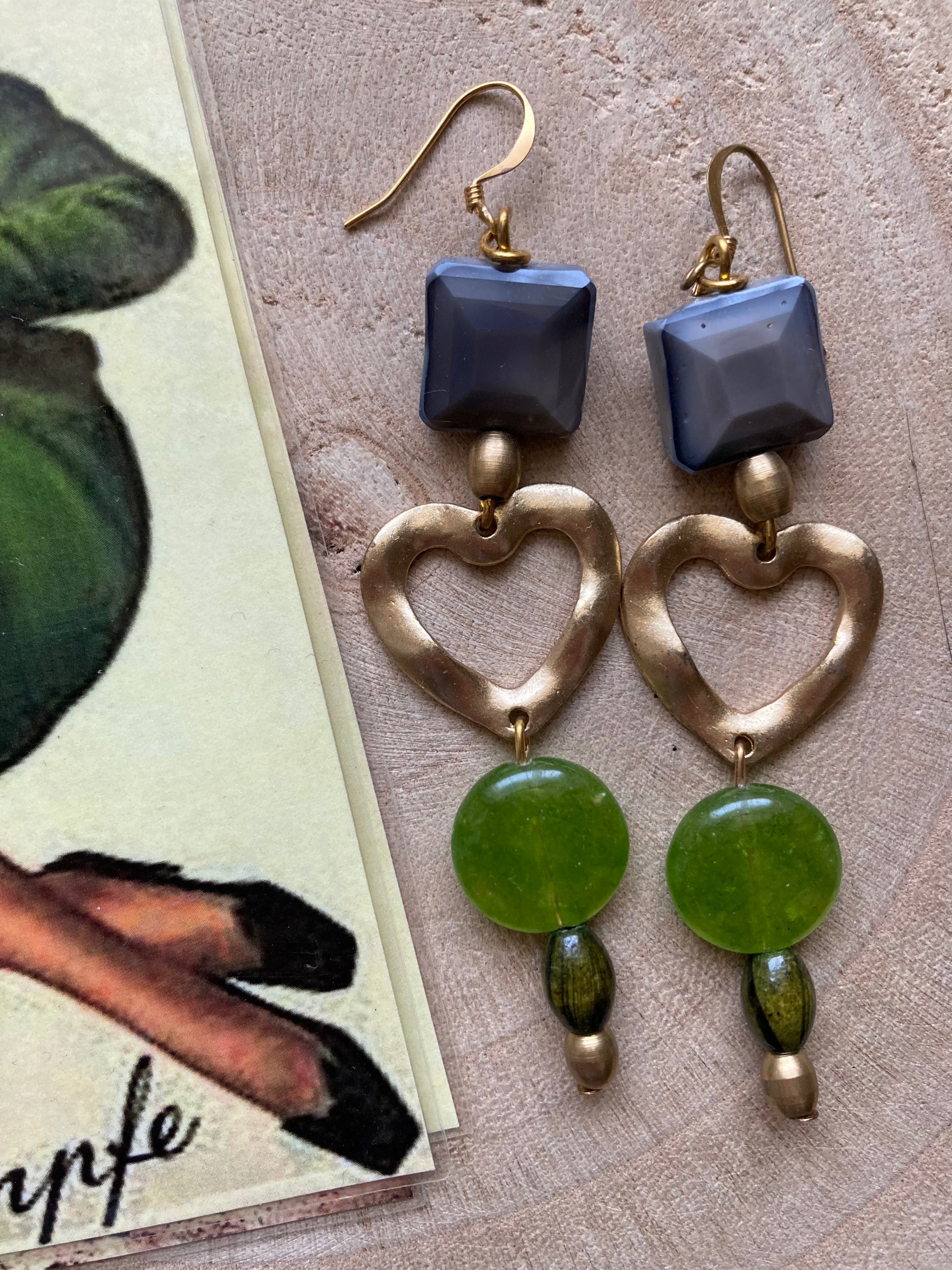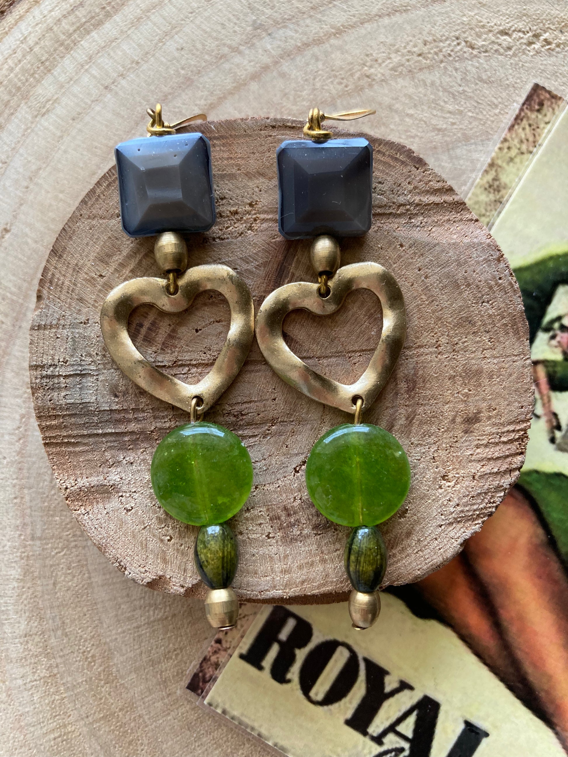 La pietra di Giada verde abbinata al cristallo grigio ed illuminati entrambi dal cuore in zama dorato.. creano nun abbinamento unico, non scontato, bello ed originale!!! La lunghezza degli otrecchini è di 8cm. Si abbinano benissimo a tutti i tuoi look!!!