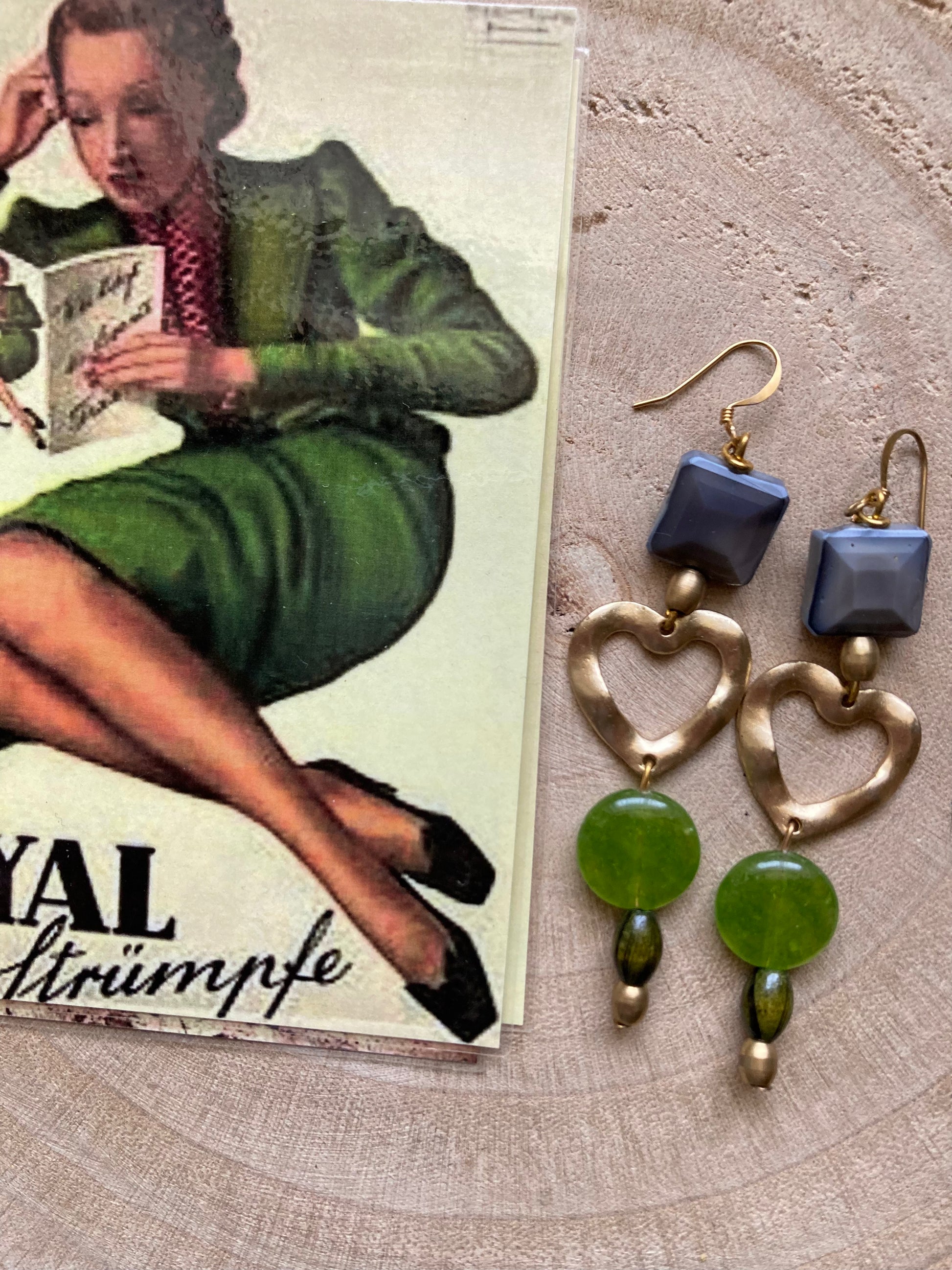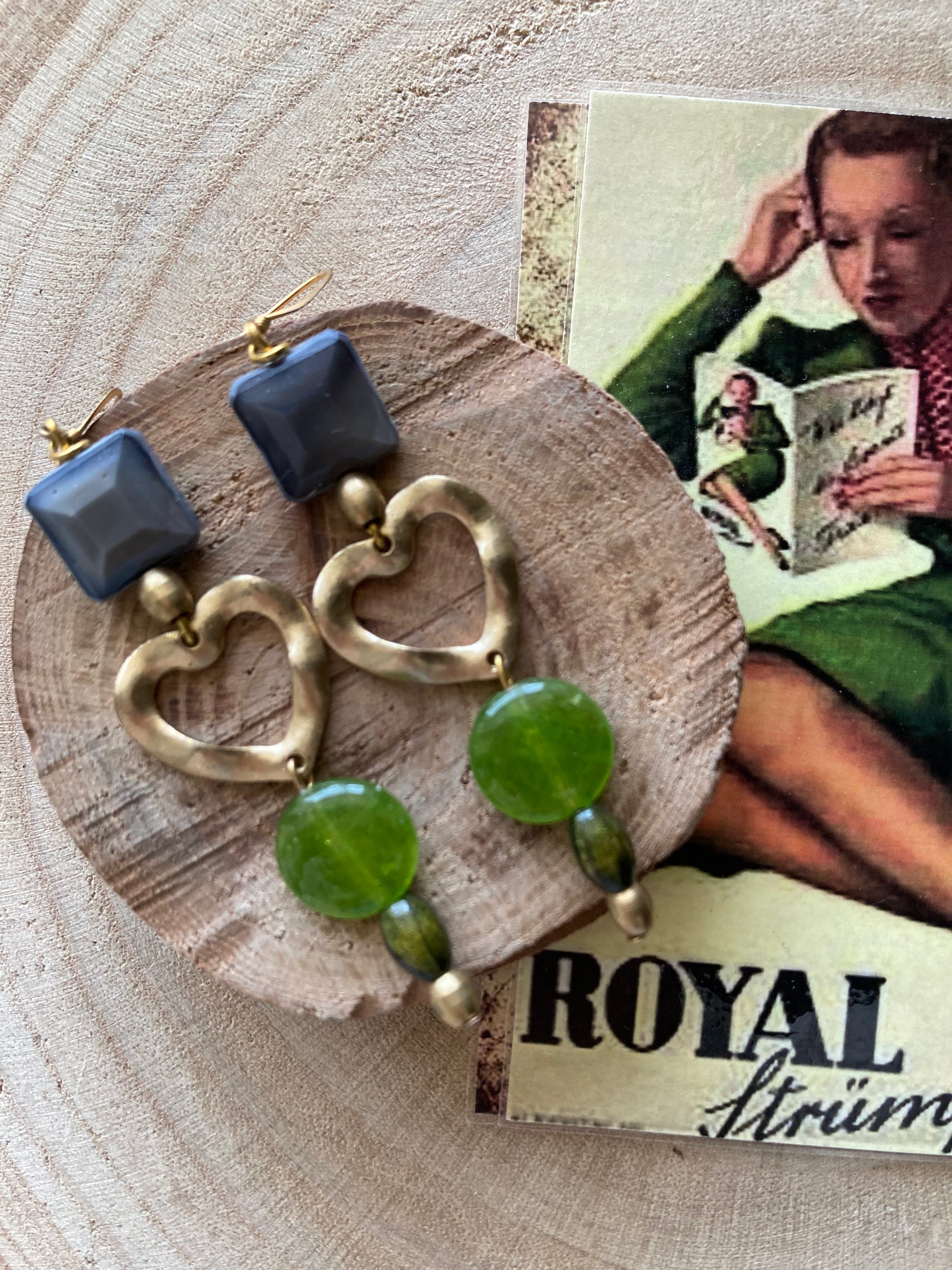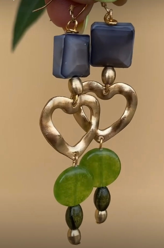La pietra di Giada verde abbinata al cristallo grigio ed illuminati entrambi dal cuore in zama dorato.. creano nun abbinamento unico, non scontato, bello ed originale!!! La lunghezza degli otrecchini è di 8cm. Si abbinano benissimo a tutti i tuoi look!!!