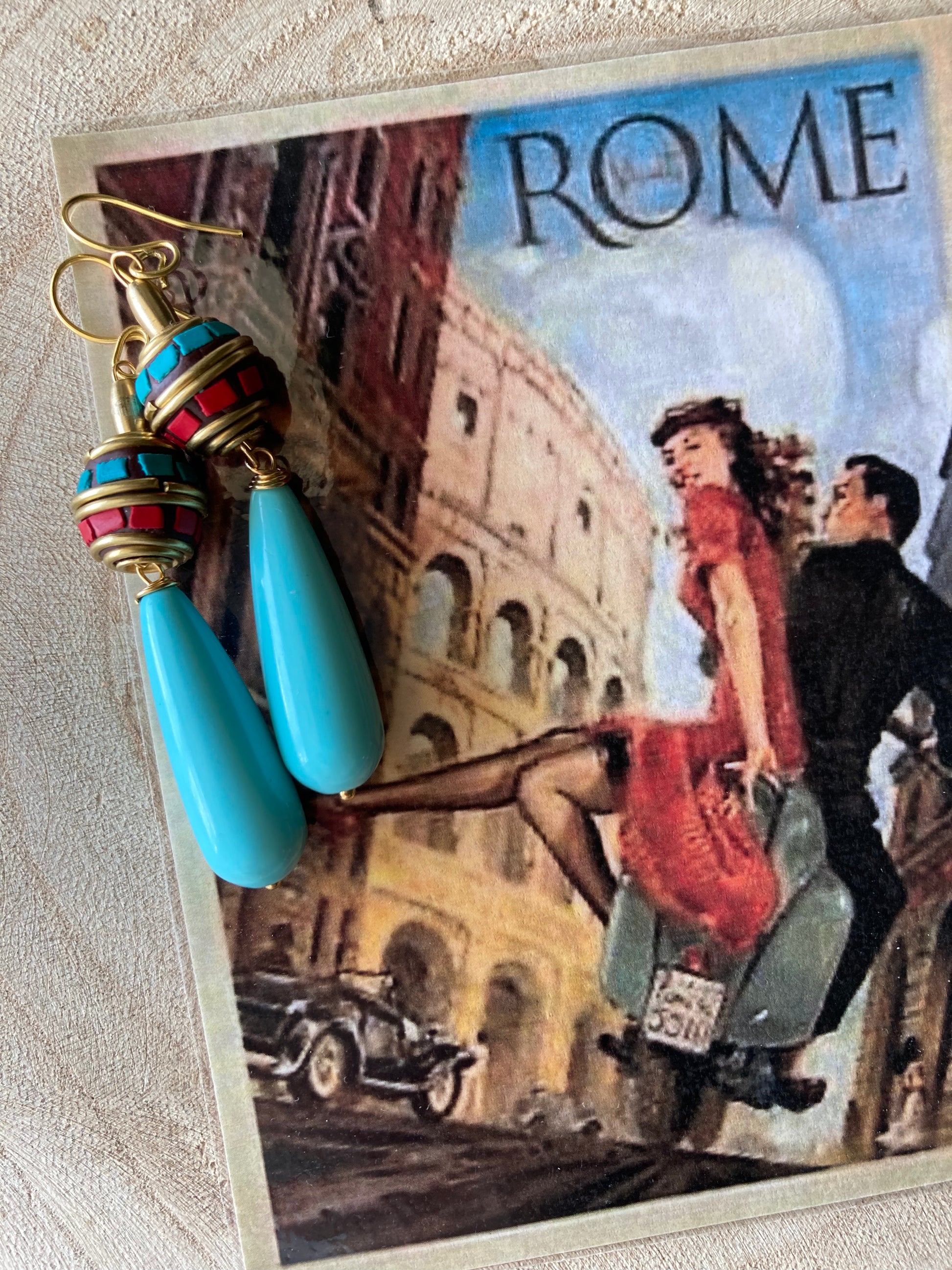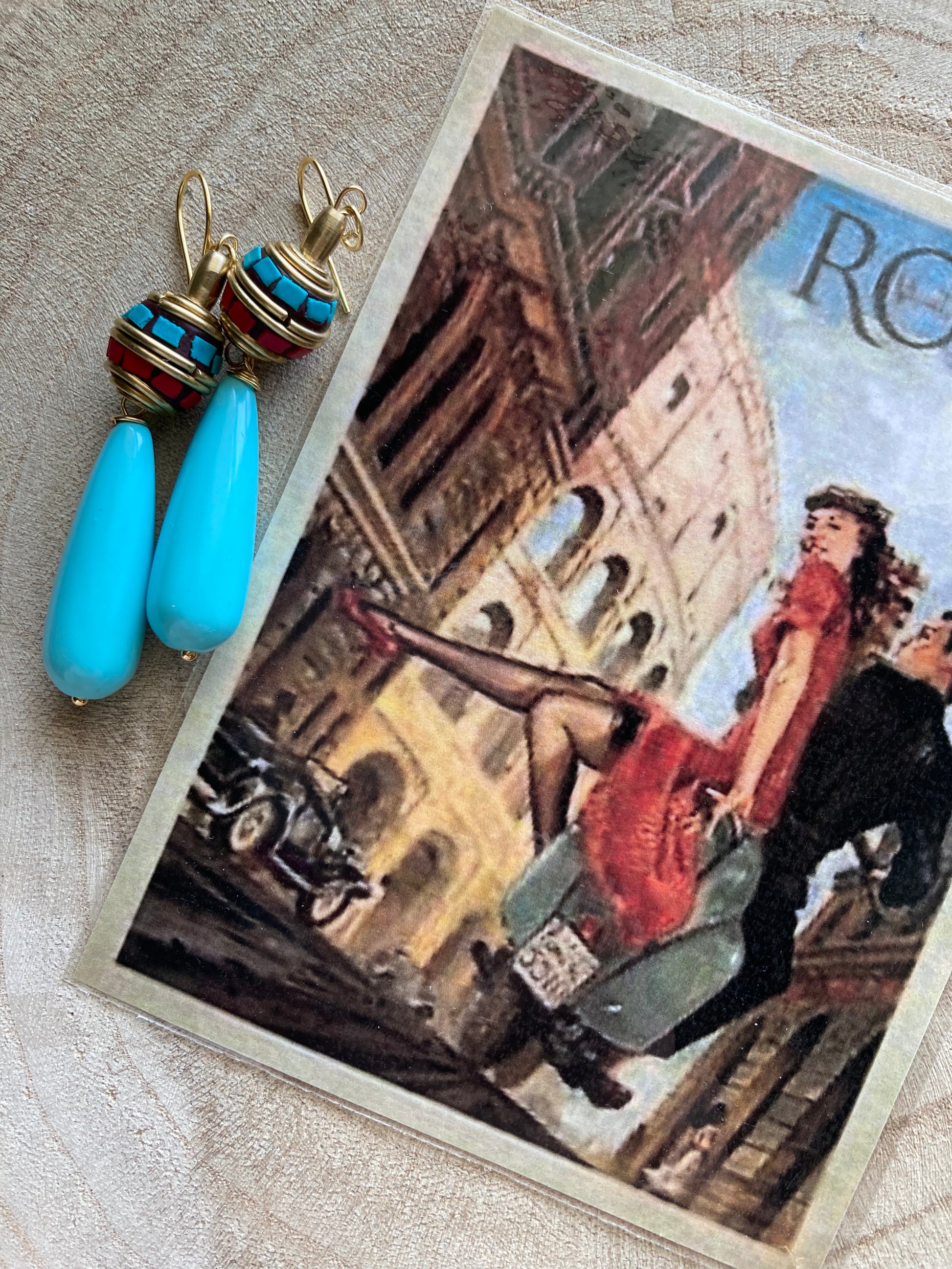 Orecchi8ni pendenti realizzati a mano con le bellissime Perline Nepalesi... Note orientali quindi per questi perndenti con gocce di pasta di turchese, la lunghezza degli orecchini è di 6,3 cm, leggeri, le monachelle (gancini) sono in acciaio quindi anallergiche
