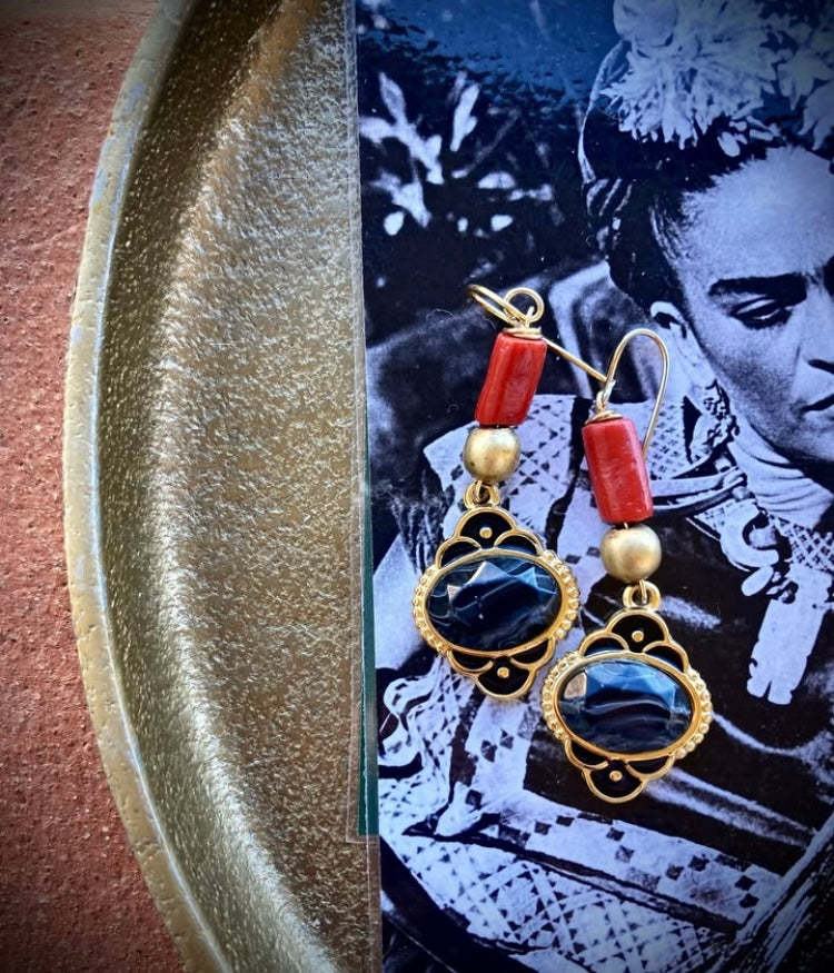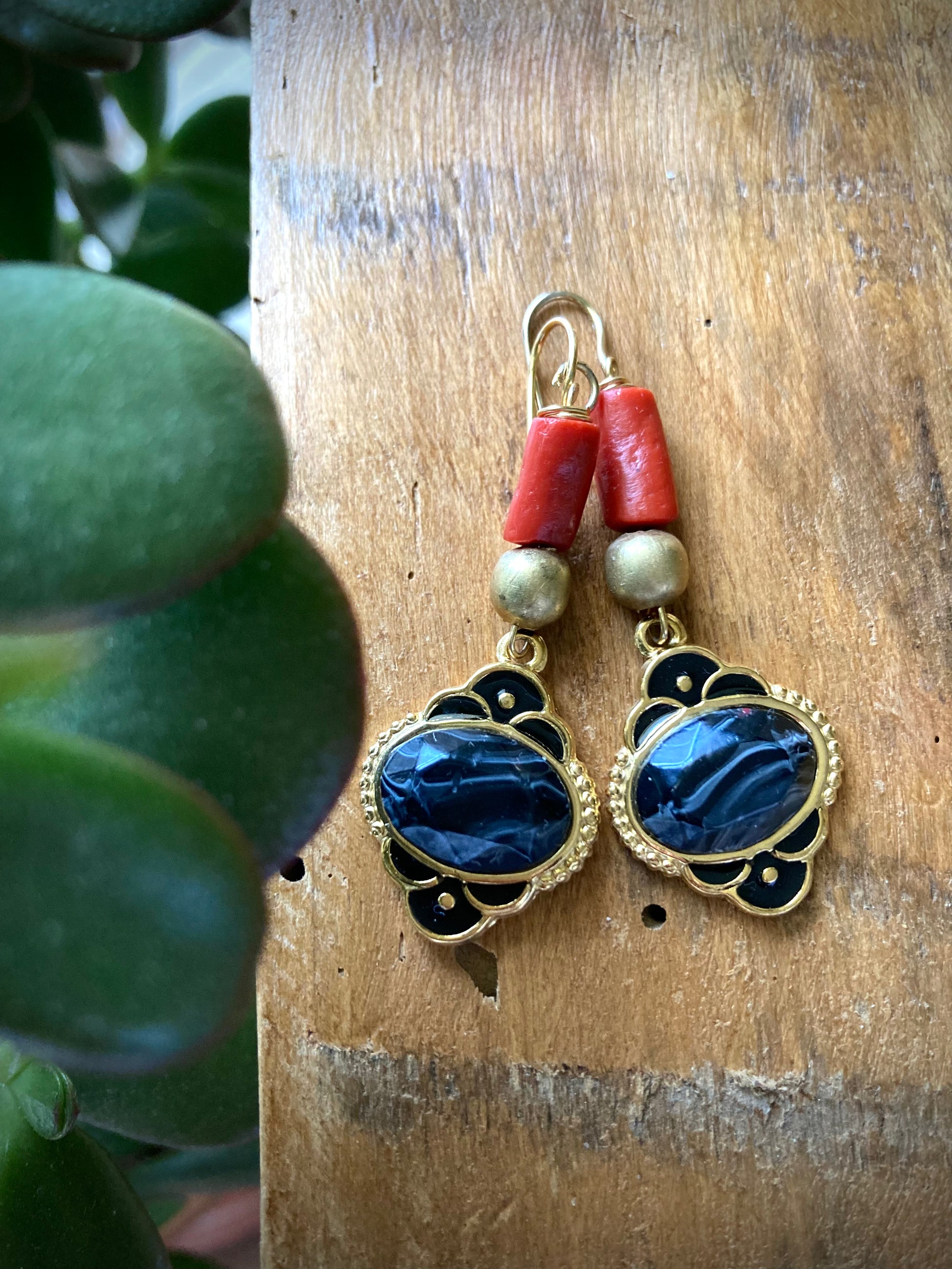 Orecchini pendenti con corallo bambù, pepite in ottone, pendente in acciaio dorato con resina nera/striata