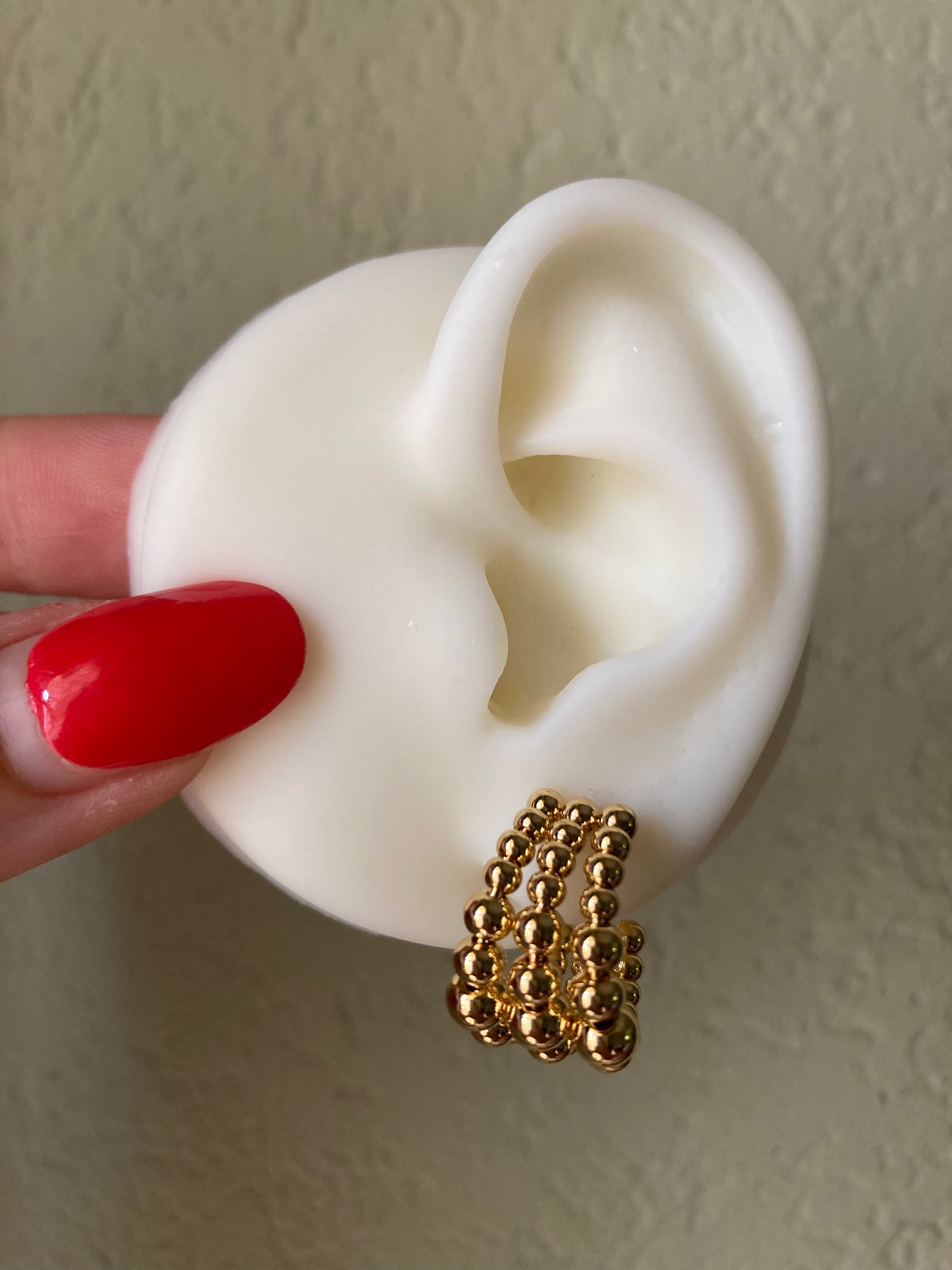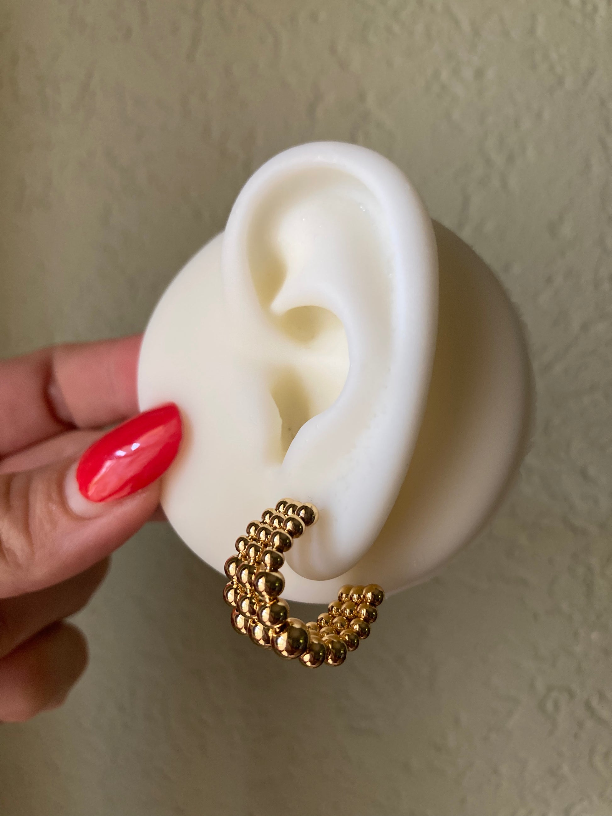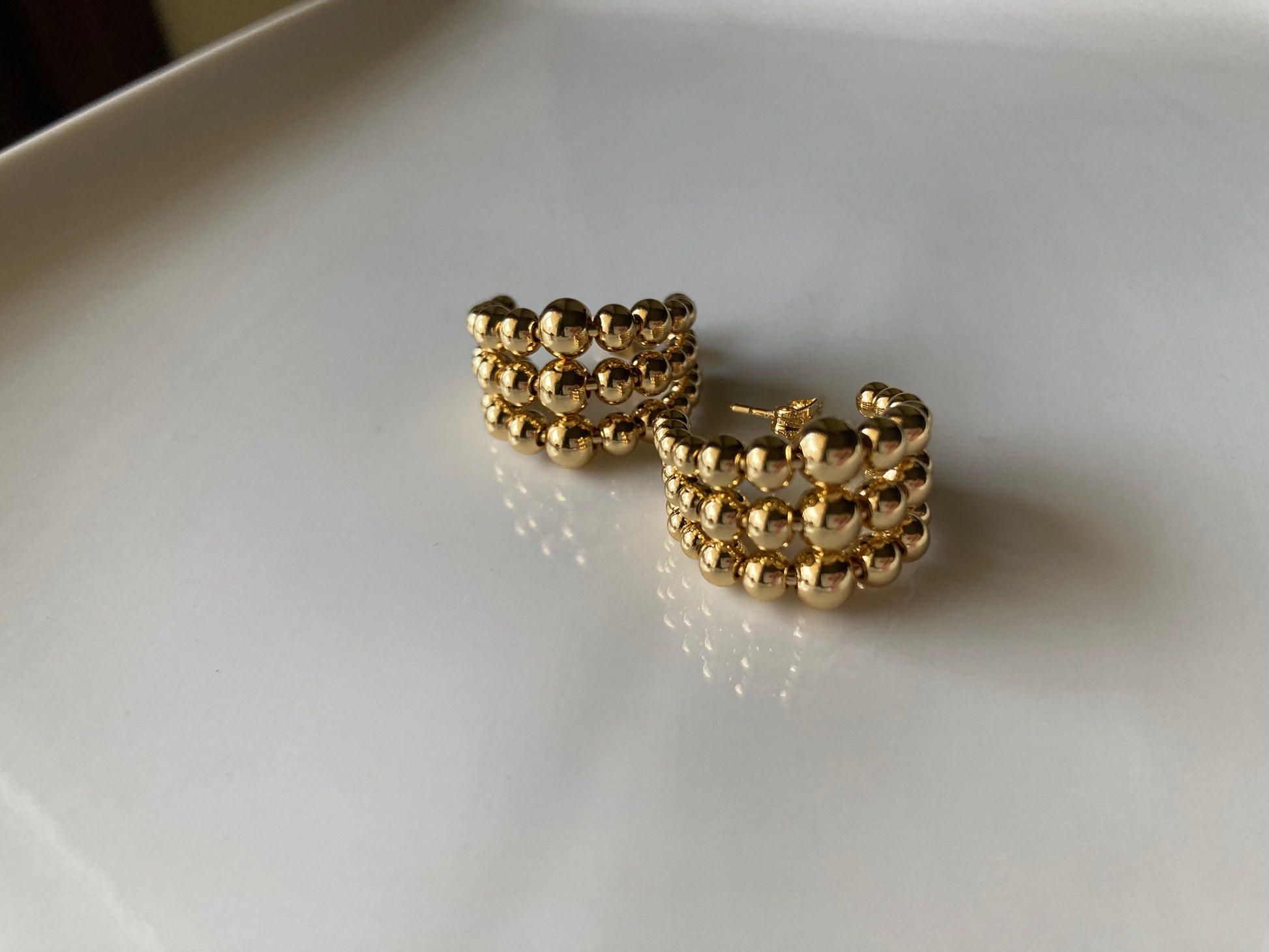 Orecchini in acciaio, leggeri, strutturati in tre file di palline dorate, forma degli orecchini: semicerchio