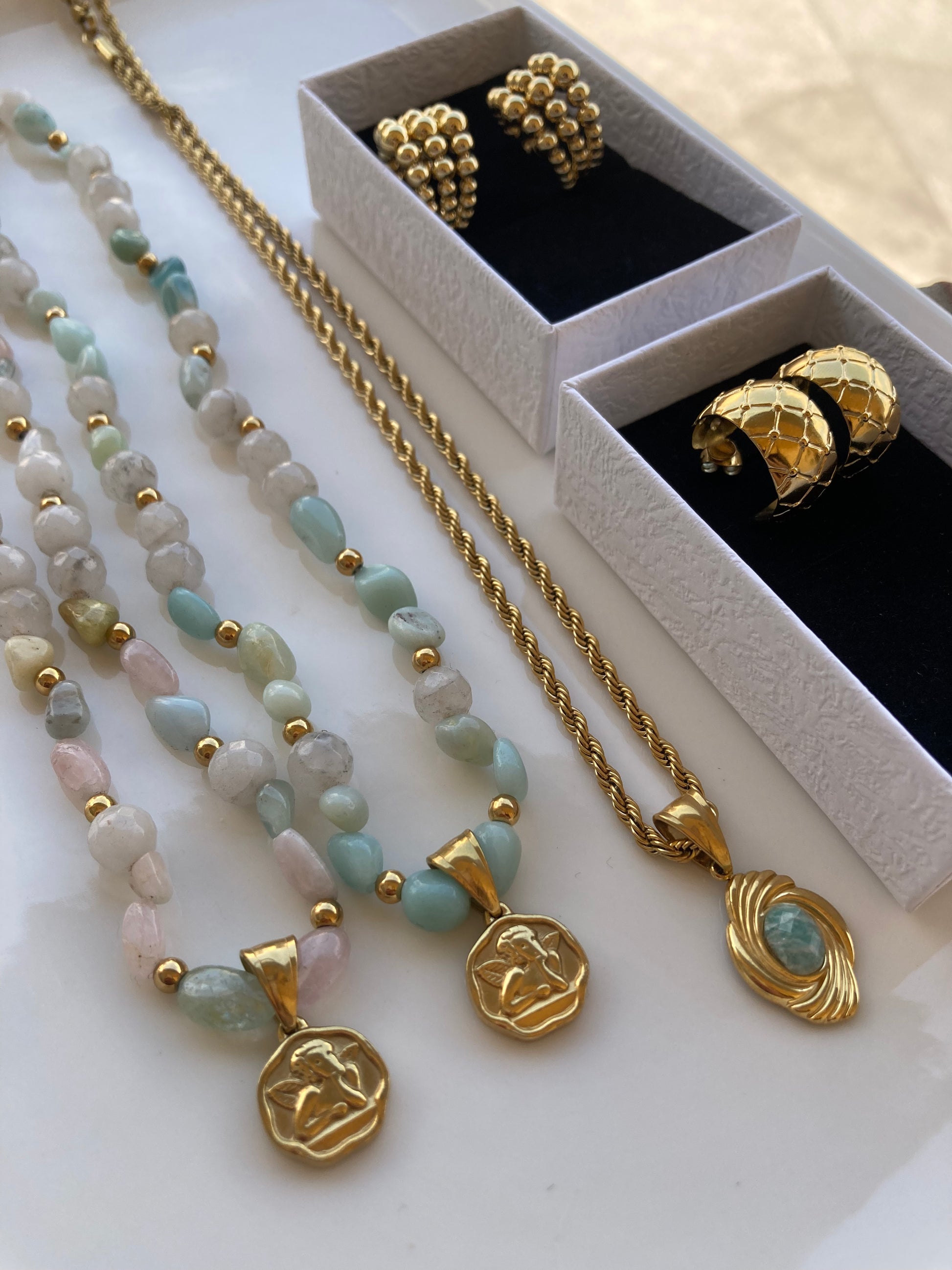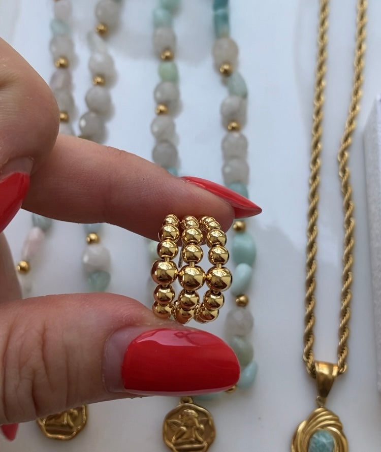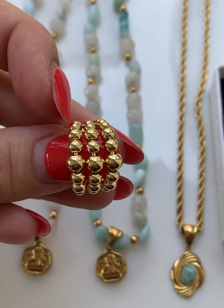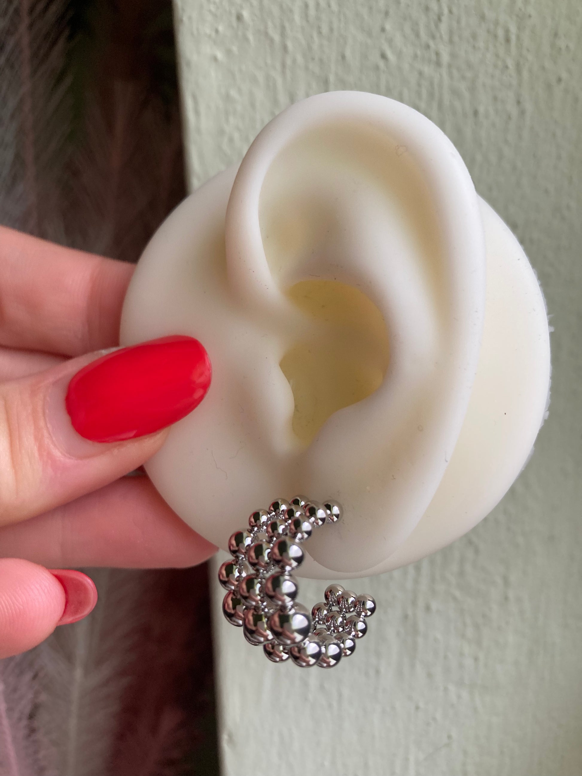 Orecchini in acciaio, leggeri, strutturati in tre file di palline dorate, forma degli orecchini: semicerchio