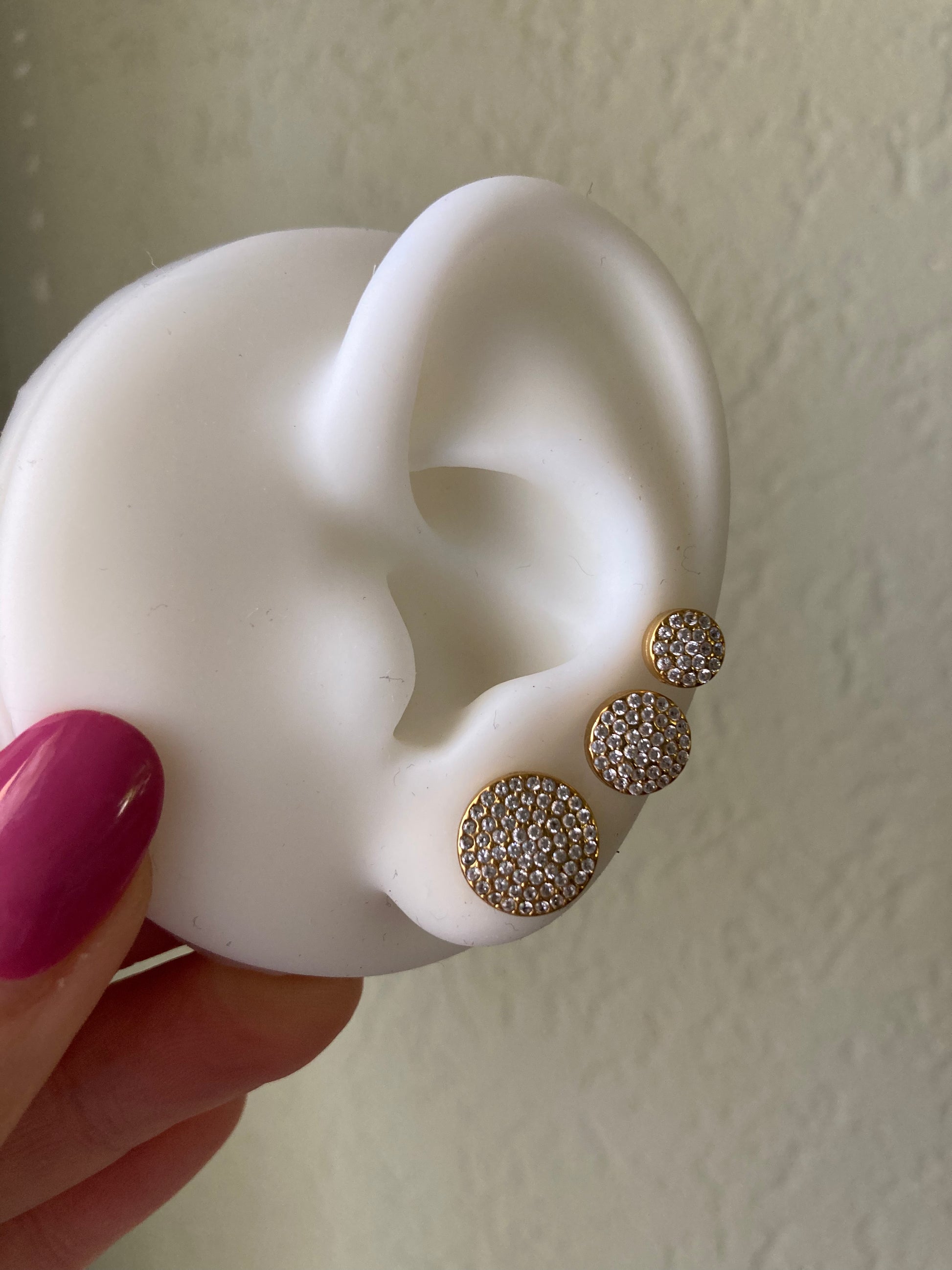 L'orecchino pavè ricoperto completamente da piccolissimi zirconi è ideale da indossare nel primo, secondo, terzo foro, è in acciaio, anallergico