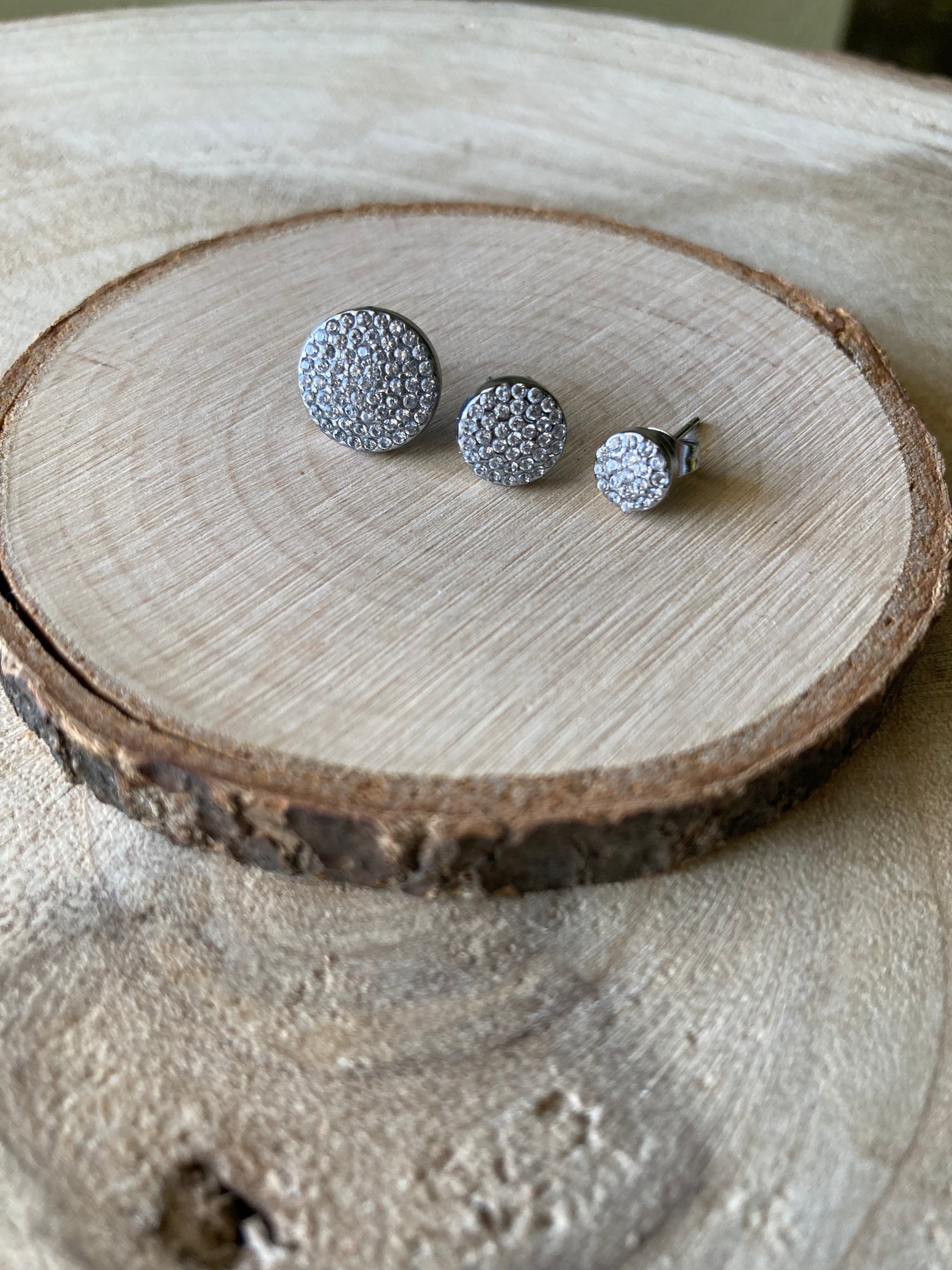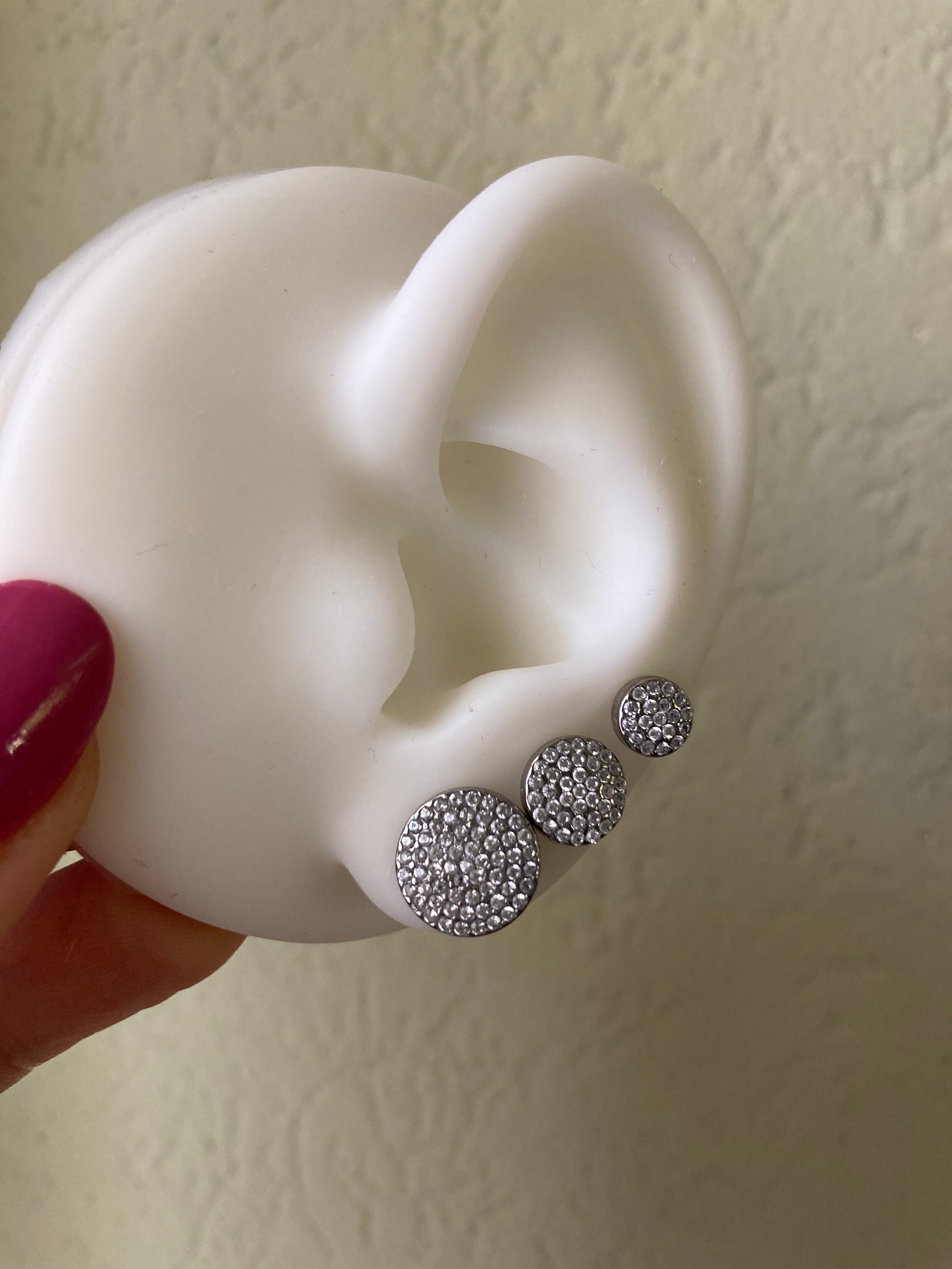 L'orecchino pavè ricoperto completamente da piccolissimi zirconi è ideale da indossare nel primo, secondo, terzo foro, è in acciaio, anallergico