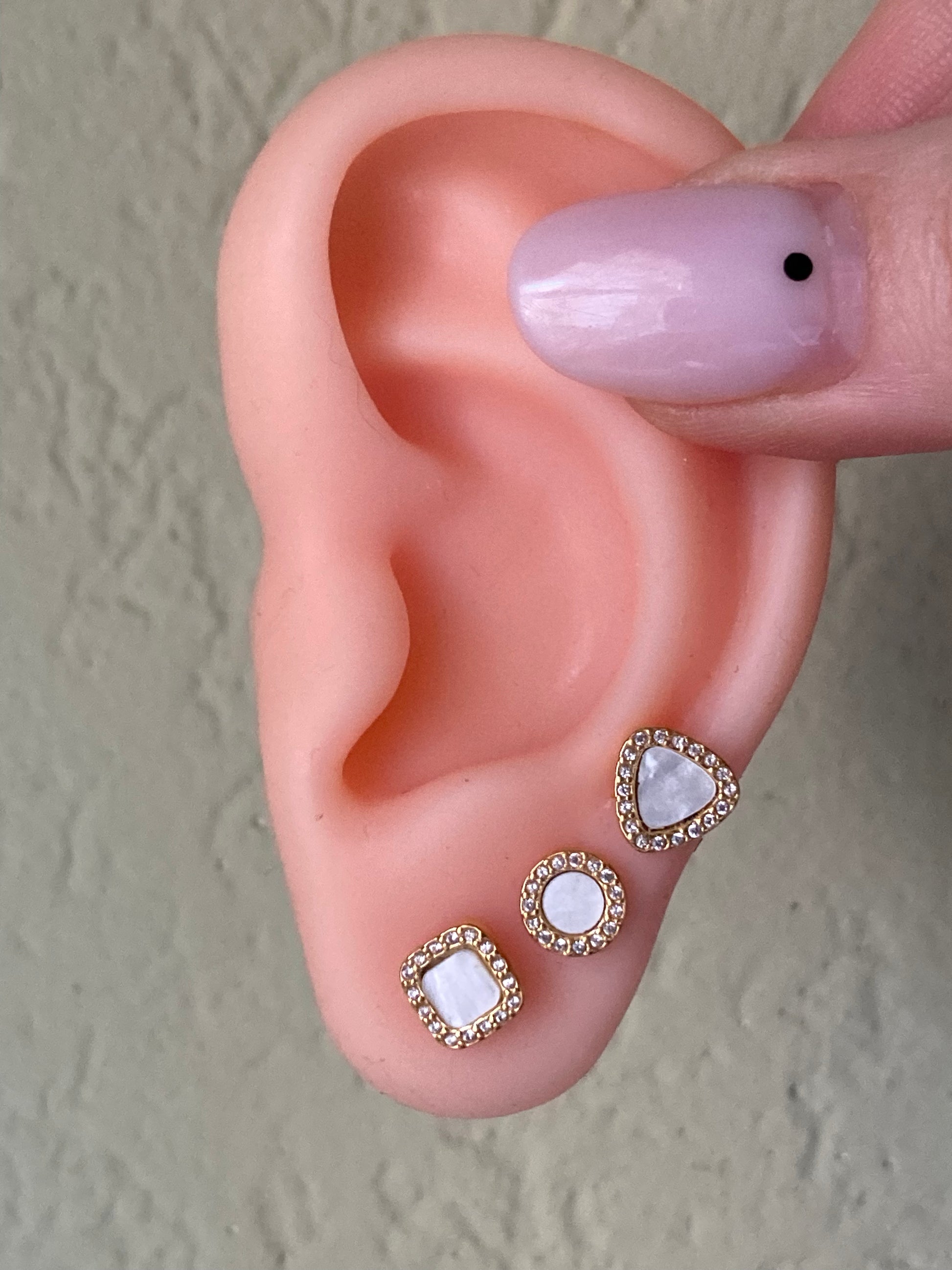 Set composto da tre orecchini, ognuno diverso dall'altro nella forma e nella grandezza, ideali per realizzare abbinamenti, da mettere nei secondi fori.