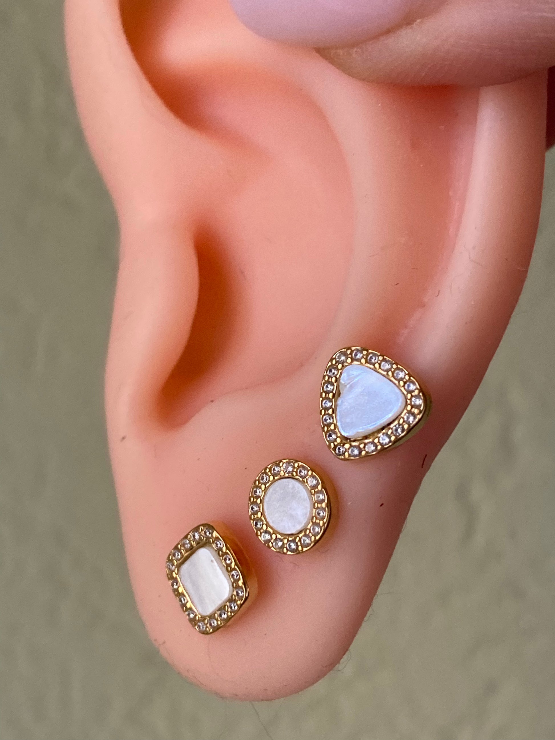La parte centrale è realizzata in madreperla e tutt'intorno ci sono dei piccolissimi zirconi che li rendono lumunosissimi!