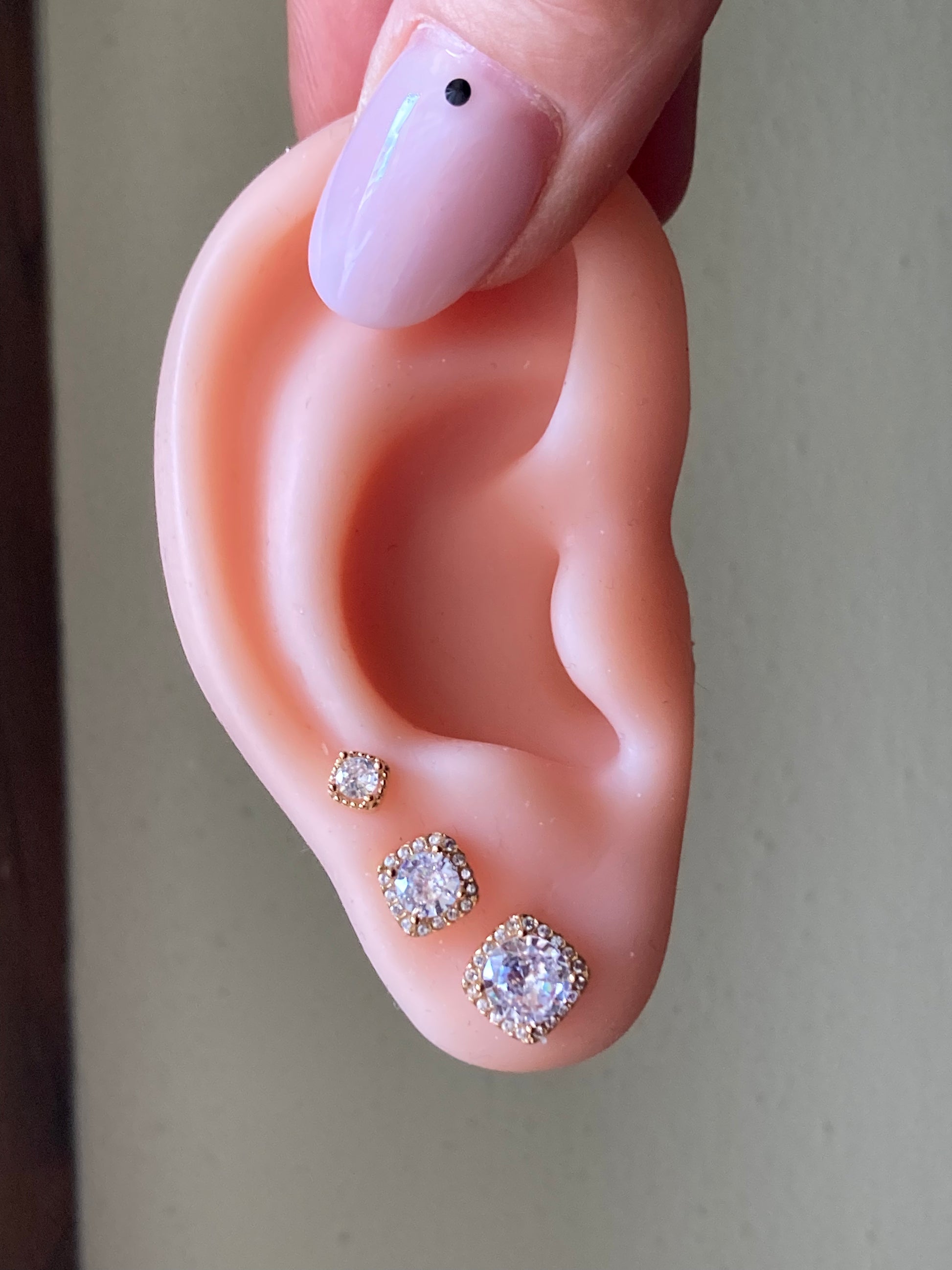 Set composto da tre orecchini, ognuno diverso dall'altro nella forma e nella grandezza, ideali per realizzare abbinamenti, da mettere nei secondi fori.