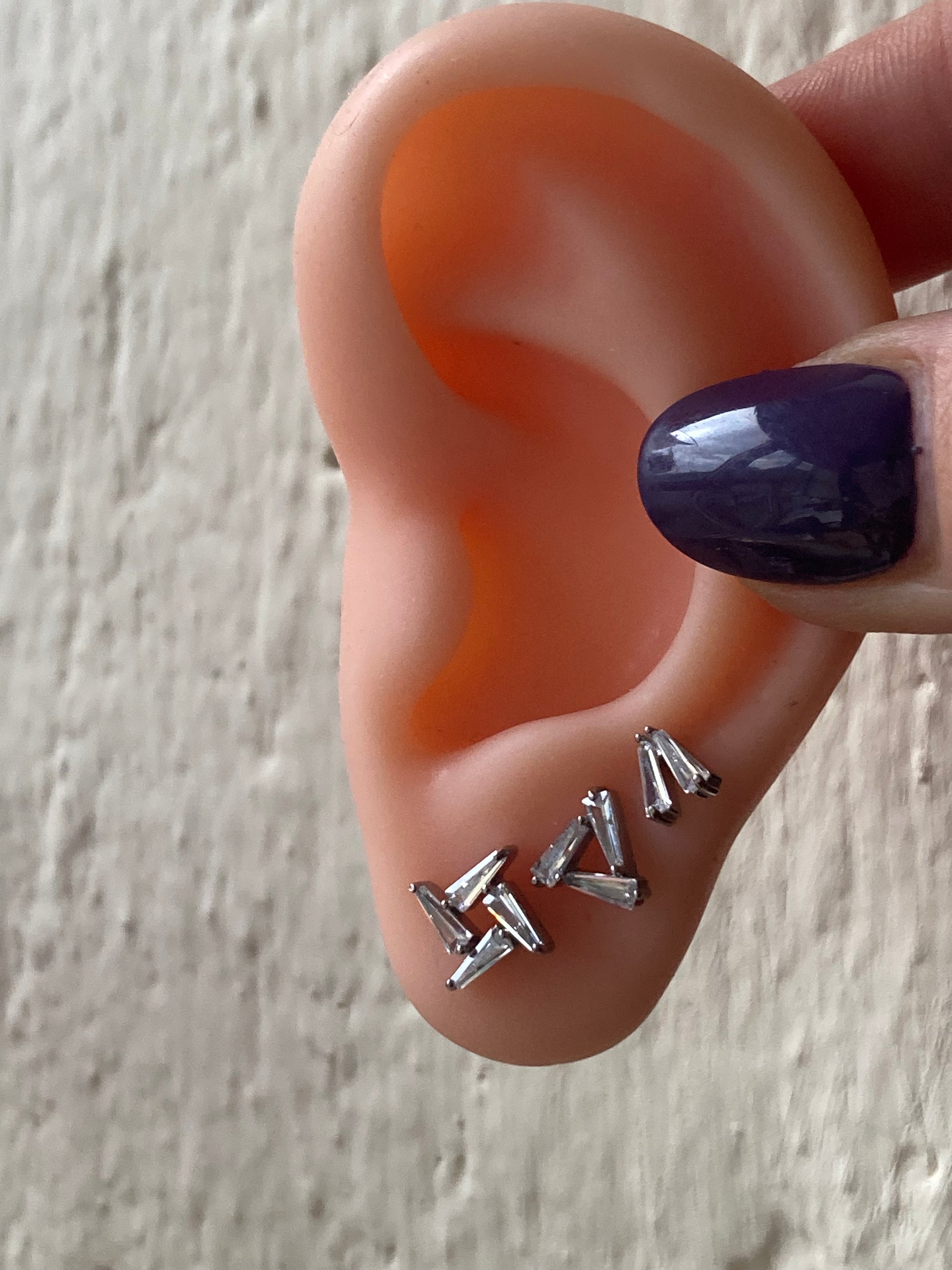 Set composto da tre orecchini, ognuno diverso dall'altro nella forma e nella grandezza, ideali per realizzare abbinamenti, da mettere nei secondi fori.